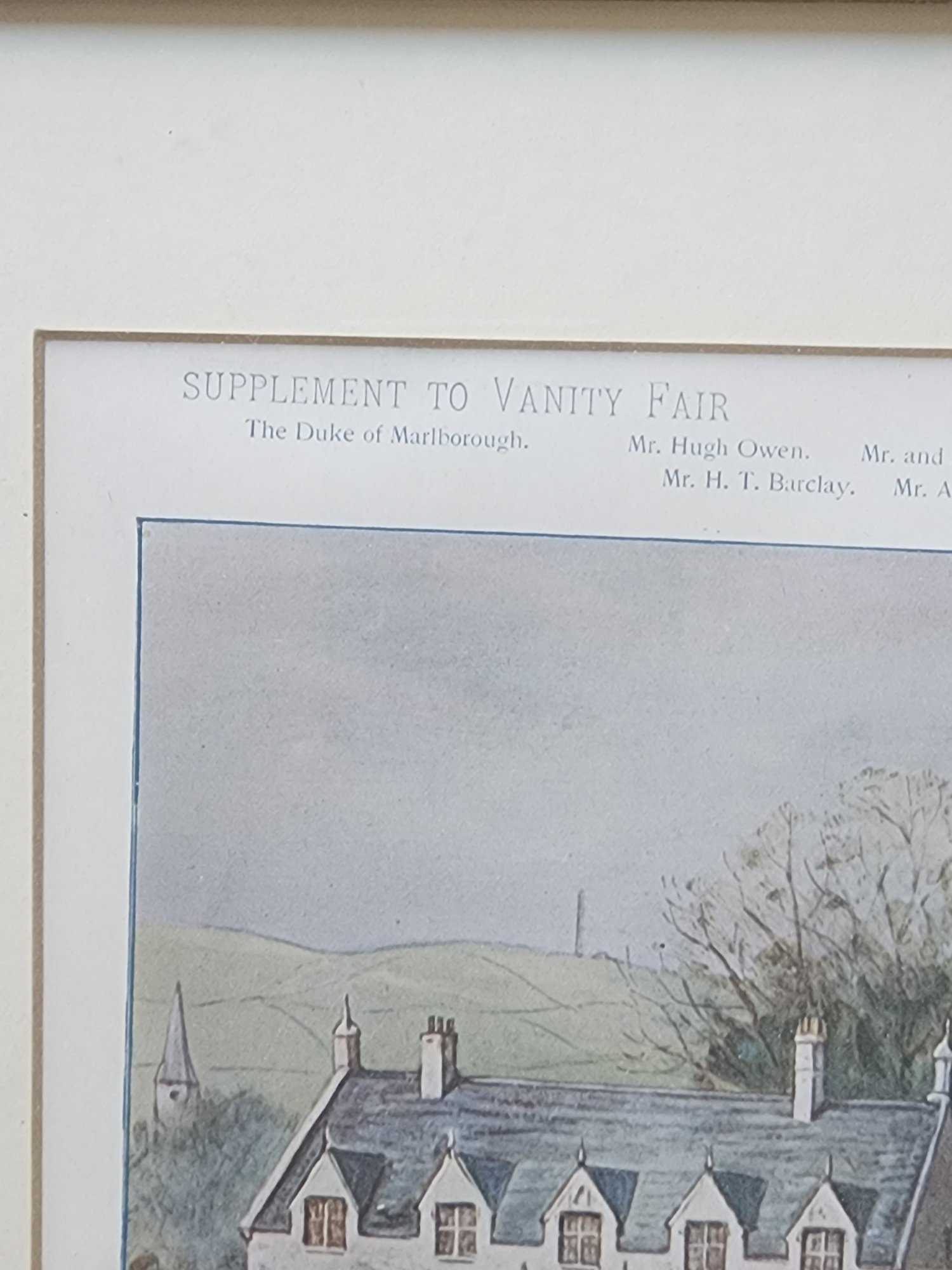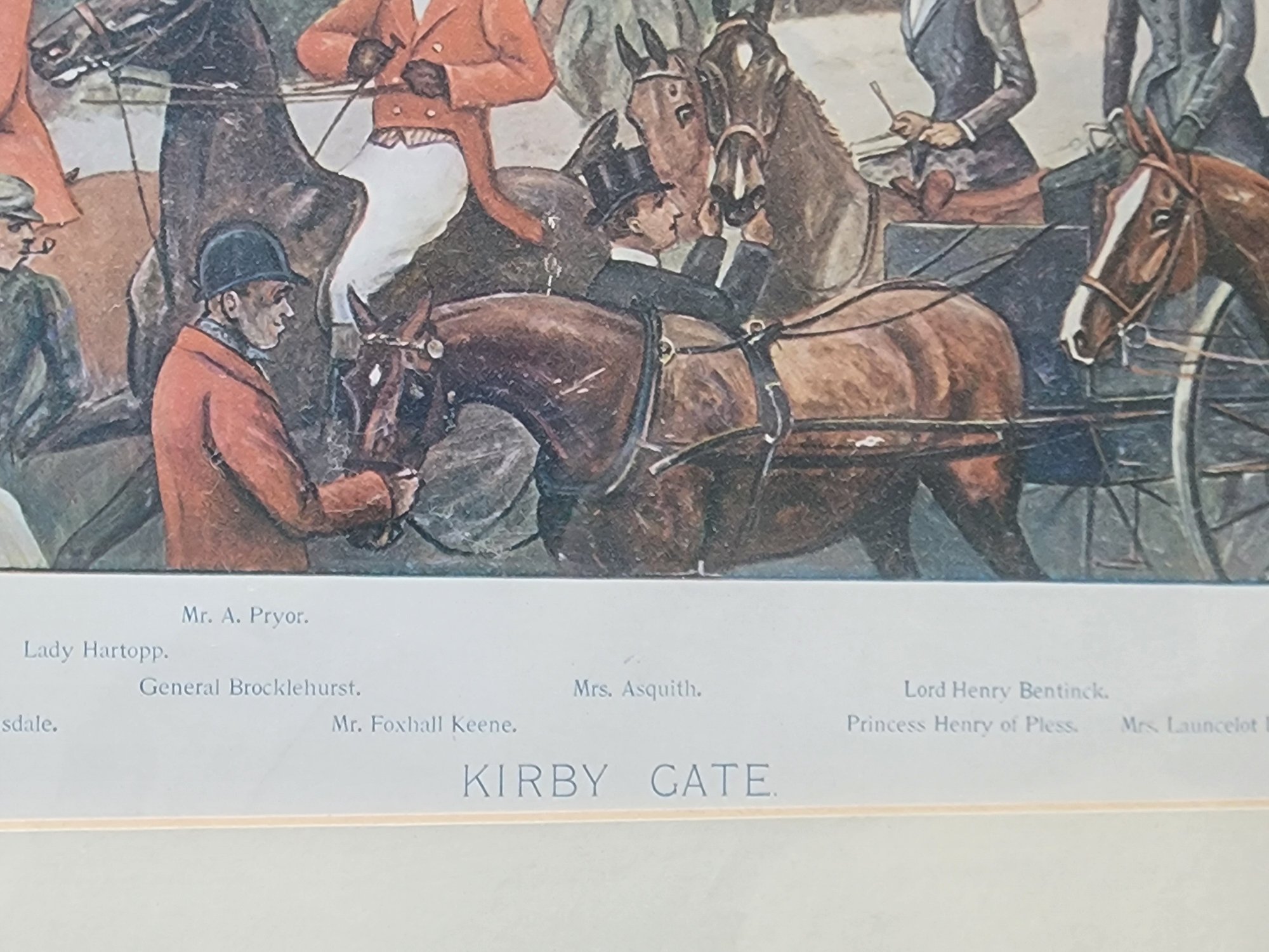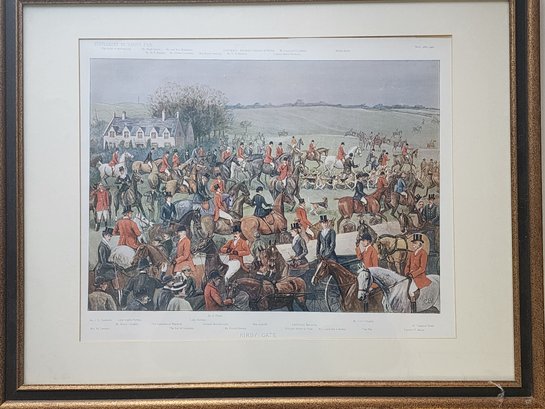 Bradley was widely admired for his ability to combine accurate equestrian observation with social narrative, and this print exemplifies his distinctive approach. Rather than isolating a single rider, the artist arranges a sweeping ensemble of mounted figures, huntsmen, aristocrats, and spectators across a pastoral landscape, creating both a documentary record and a dynamic social portrait. The scene includes notable participants such as Captain Hartopp MFH, huntsmen Tom Firr and Walter Kyte, the Duke of Marlborough, the Earl of Lonsdale, Princess Henry of Pless, and numerous other prominent figures identified in the printed key