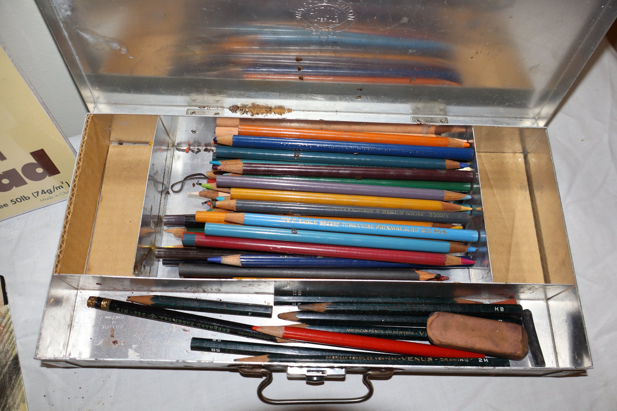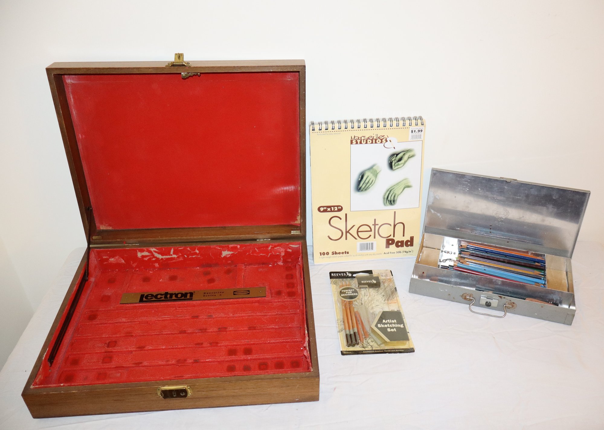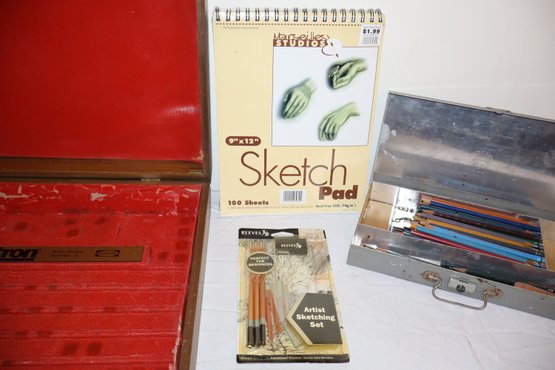 Includes large Lectron case, colored pencils, drawing pencils, Winsor & Newton artists carrying case & sketch pad