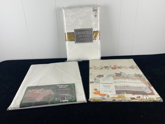 Three different tablecloths in set. All still in packaging. No damages seen in images. See photos for more conditions and sizing.