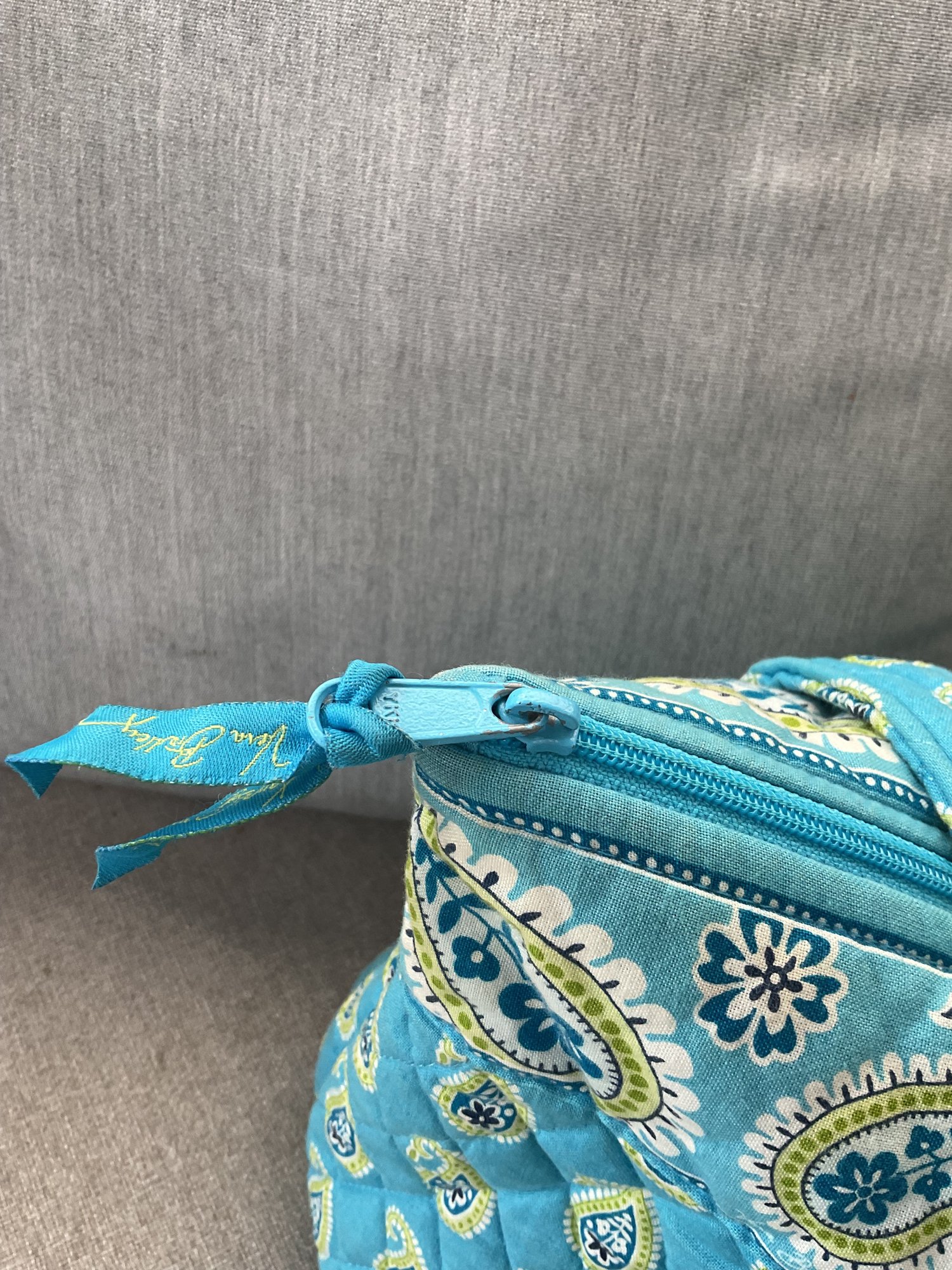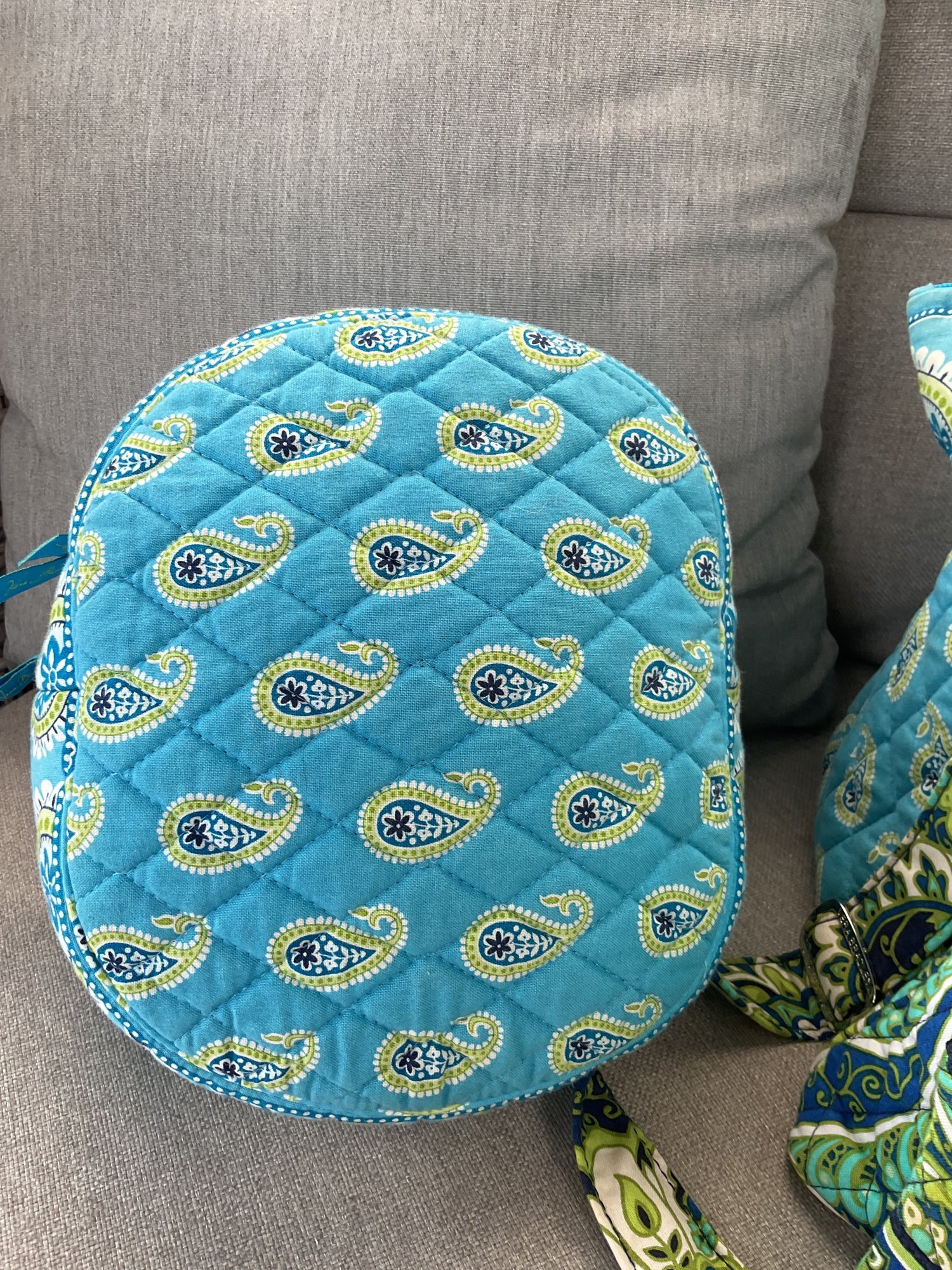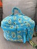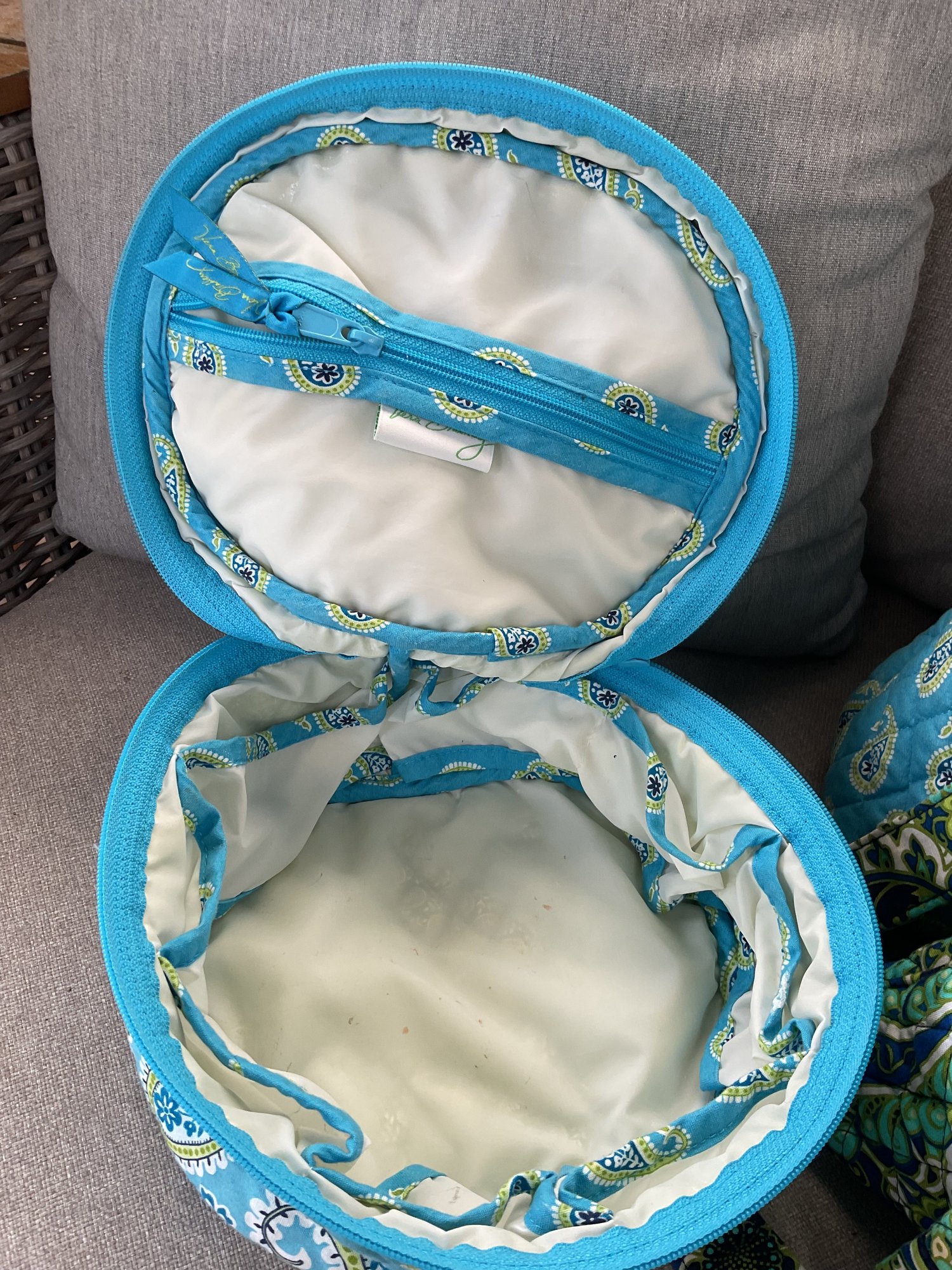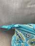 Round Toiletry/Cosmetic Case: A matching turquoise paisley vanity case with a sturdy top handle and a wrap-around zipper, featuring an interior pocket for secure storage.