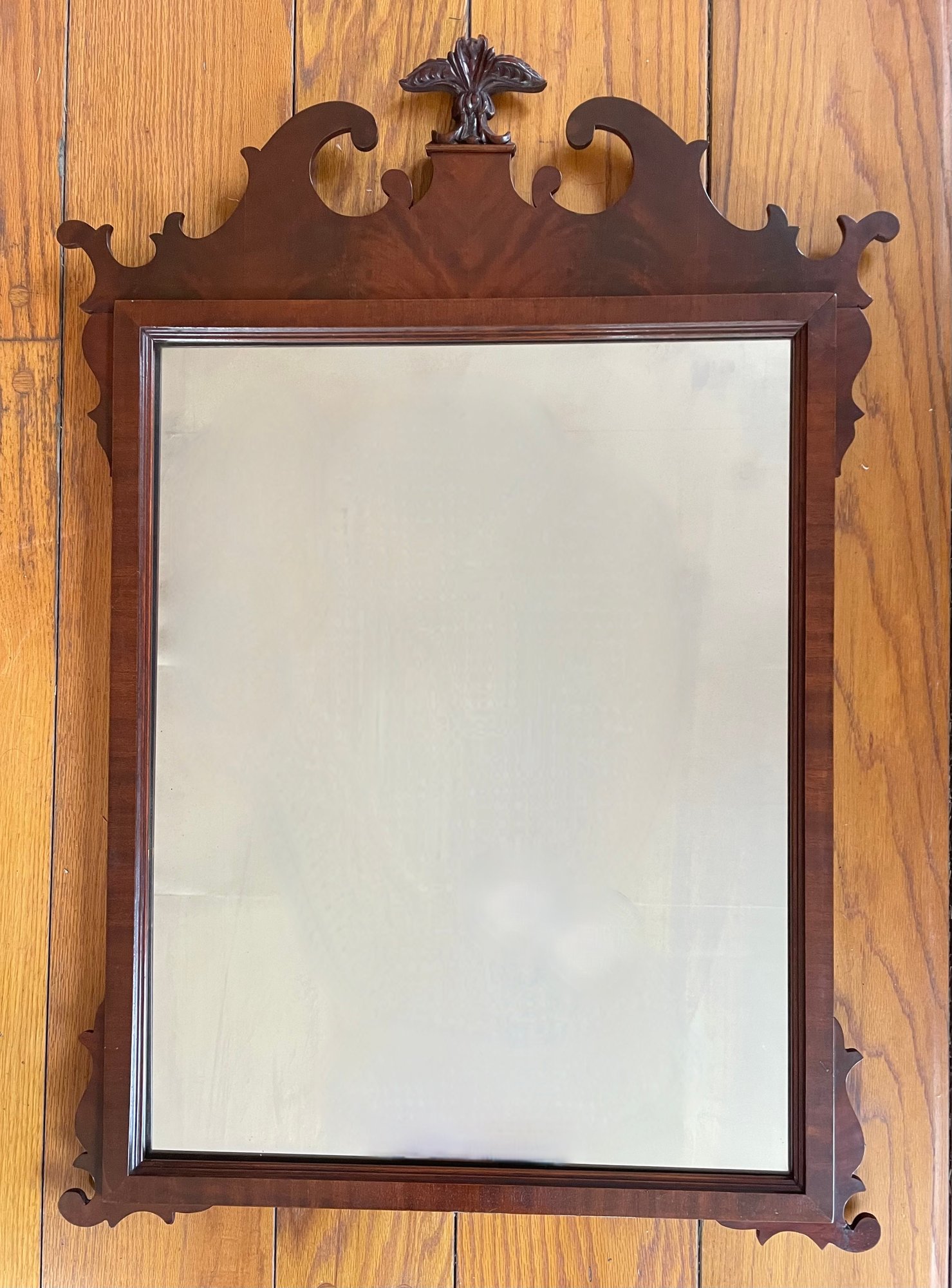 A very beautifully made antique Chippendale style large mirror with book-matched veneer, a hand carved finial, and original mirror. The mirror is in very good condition with only slight signs of wear and a small repair on the bottom right corner - not very noticeable. The mirror measures 40" high by 28" wide.