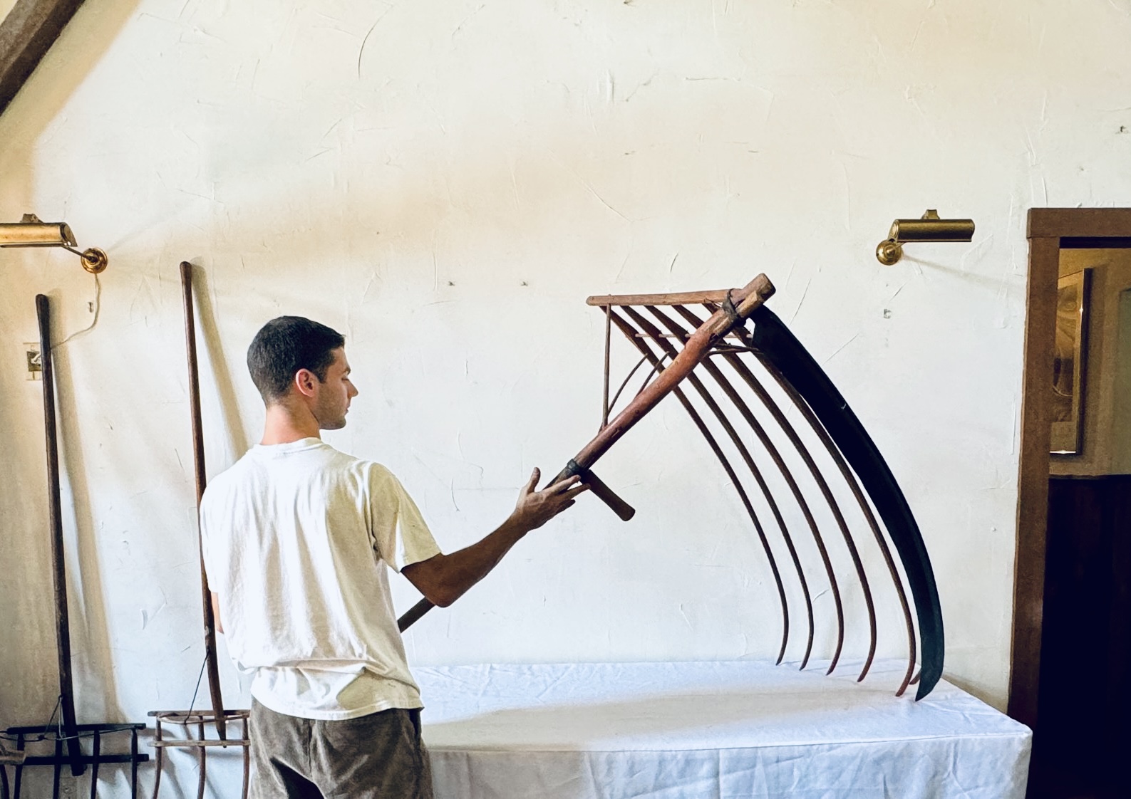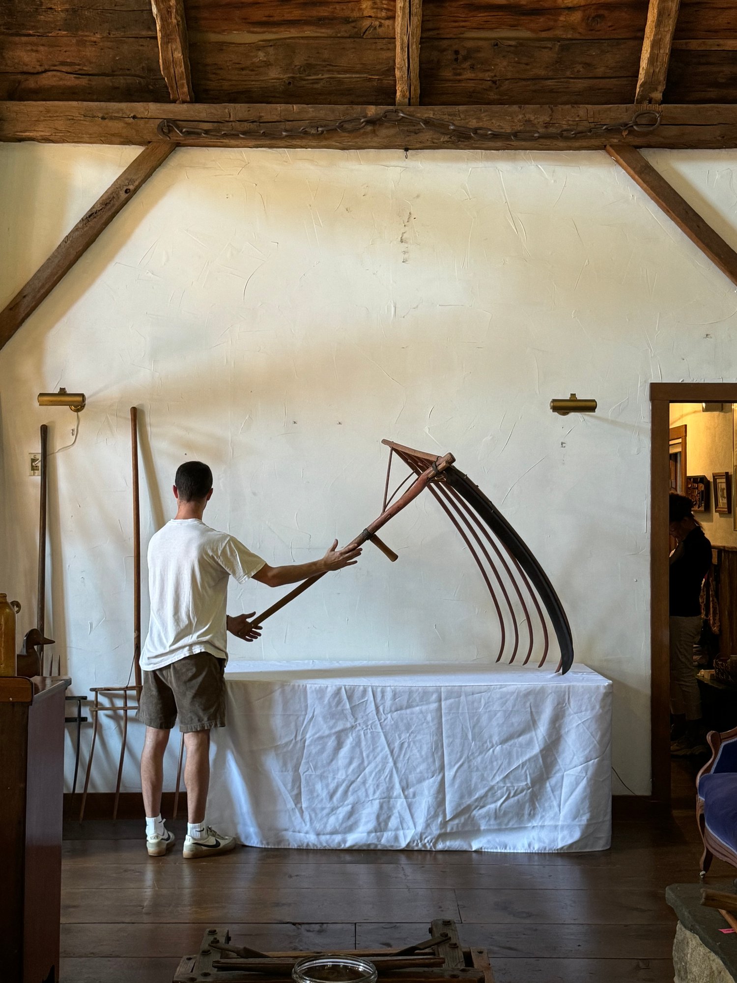 Beautiful and Primitive Early 18th + 19th Century Sculptural Farm Tools Galore, Shaker Shovels, Tall Hay Forks, Large Winnowers, and Many Forged Items, Lightening Rods, Very Tall 15’ Primitive Barn Ladder, Art By Hale Johnson and Others, Furniture, Carpets, Collectibles, Gorgeous Chestnut Canoe By Temagami, Books, Records + More!