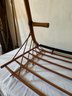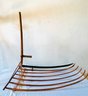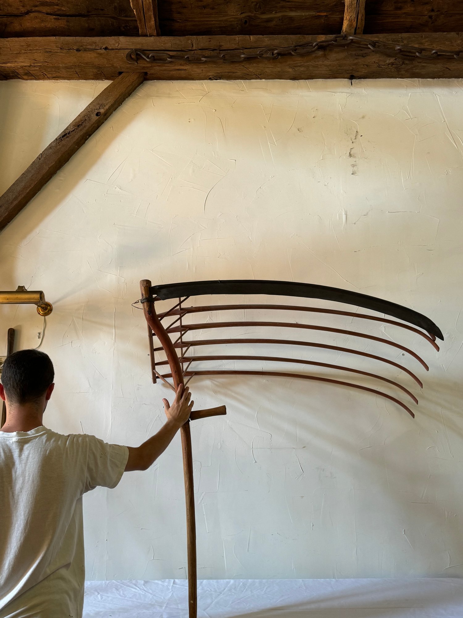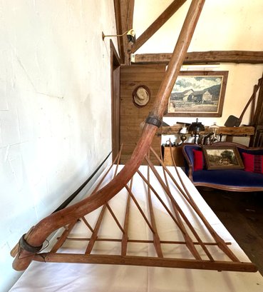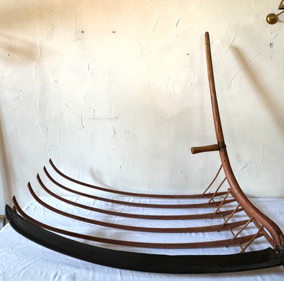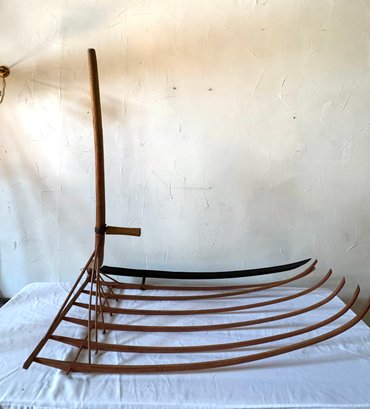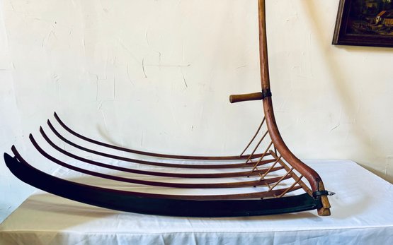 This is an antique cradle scythe. The primitive farm tool allowed for slicing and setting aside of the grain in one sweeping motion. It features a wooden handle and tines with a metal blade and hardware. It has been living collected and used decoratively in this CT collectors