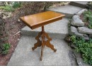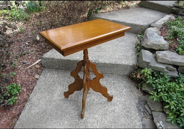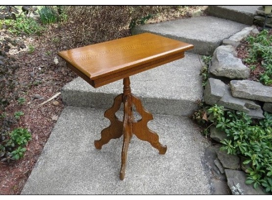 Attractive Victorian Eastlake style parlor table or lamp table, probably refinished at some point in its past but clean overall, legs may have been re-pegged and were glued, table sits quite solid and might be of a golden oak or chestnut. Table is 27.5" high with a top measuring 22" long x 14" wide. A nice table in front of the bay window with that stained glass lamp or as an occasional table anywhere in the home. Nice piece.