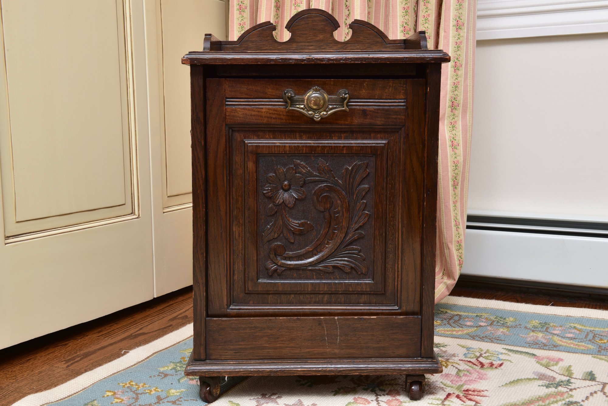 A charming antique Victorian mahogany purdonium cabinet. The purdonium cabinet has a square shaped top with a carved gallery back with shaped sides. Below, is a carved front drawer which drops open, with a brass handle, to reveal a large coal compartment, perfect for storage. Both sides have carved brass handles. Raised on castors.