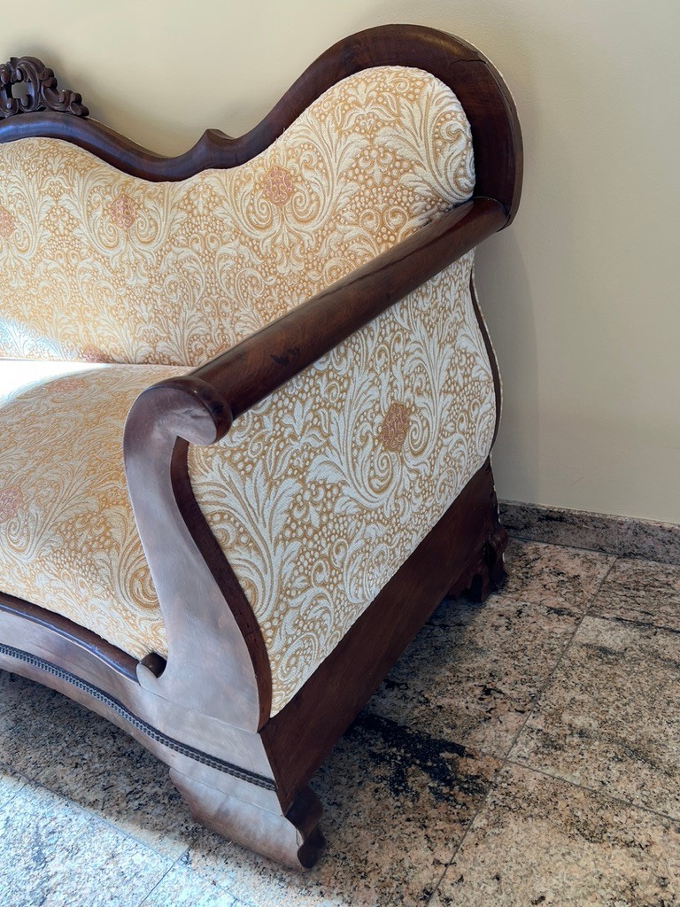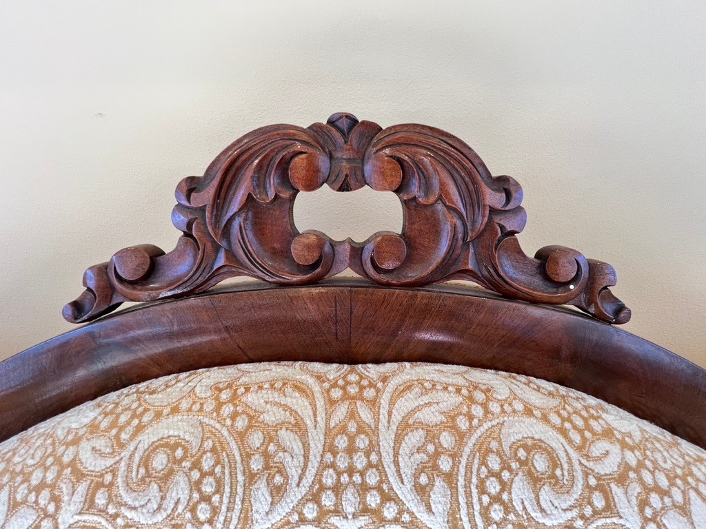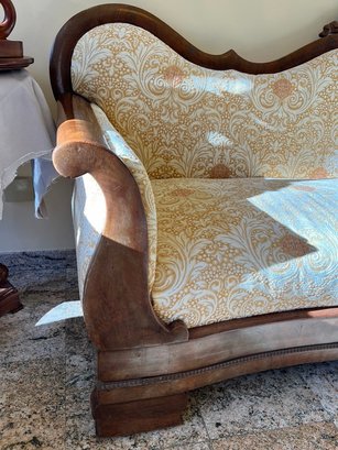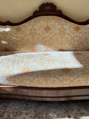 This is an antique American Empire or Victorian style mahogany sofa with a new damask upholstery. Lovely condition, great age, staged in an entryway, not used conventionally. Has everything right going for it!