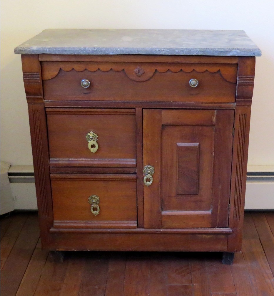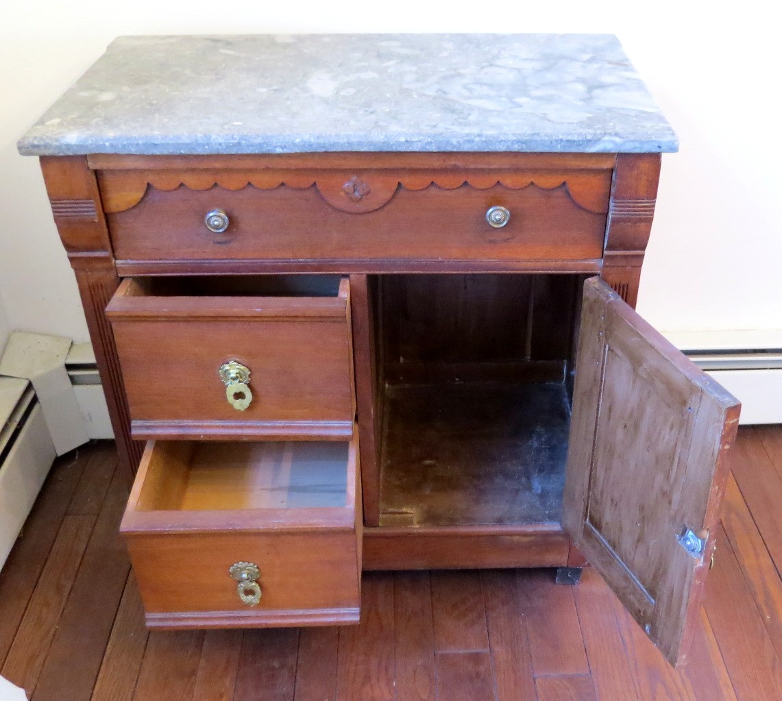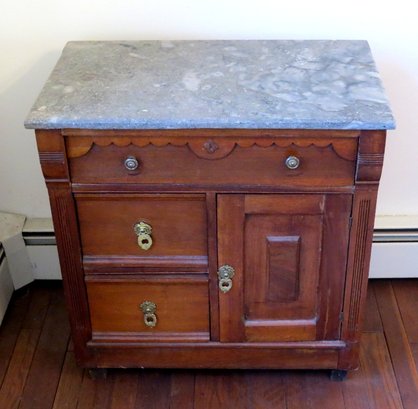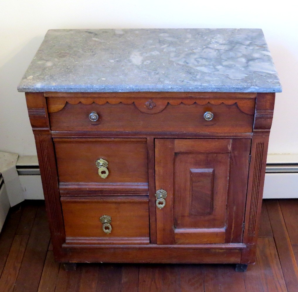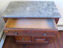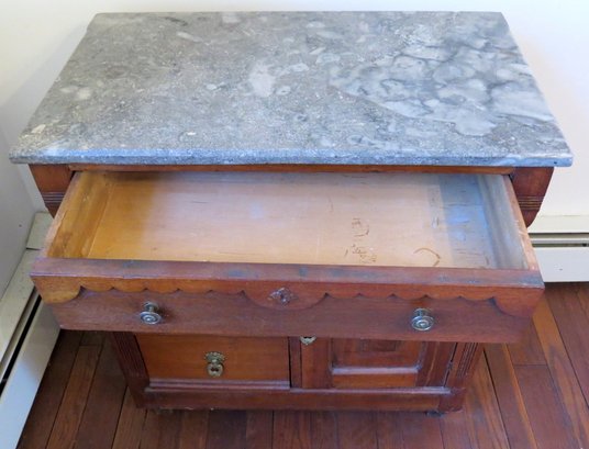 A Victorian era oak washstand with gray marble top, 30" wide, 16.5" depth and 28" height, 3 drawer, one door.