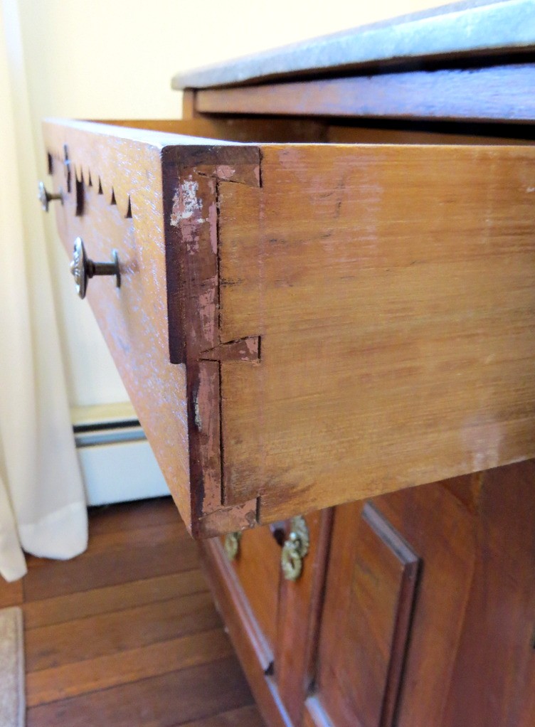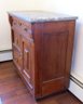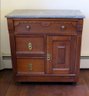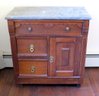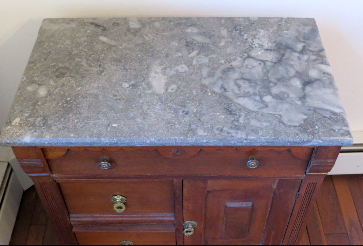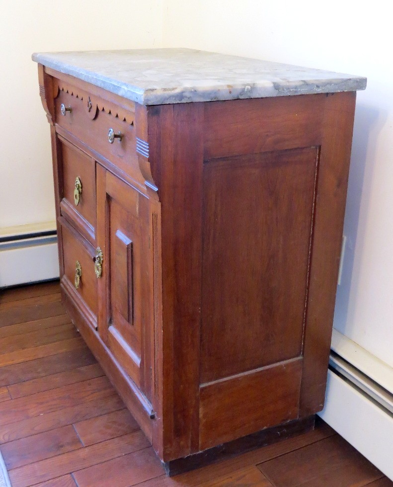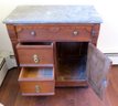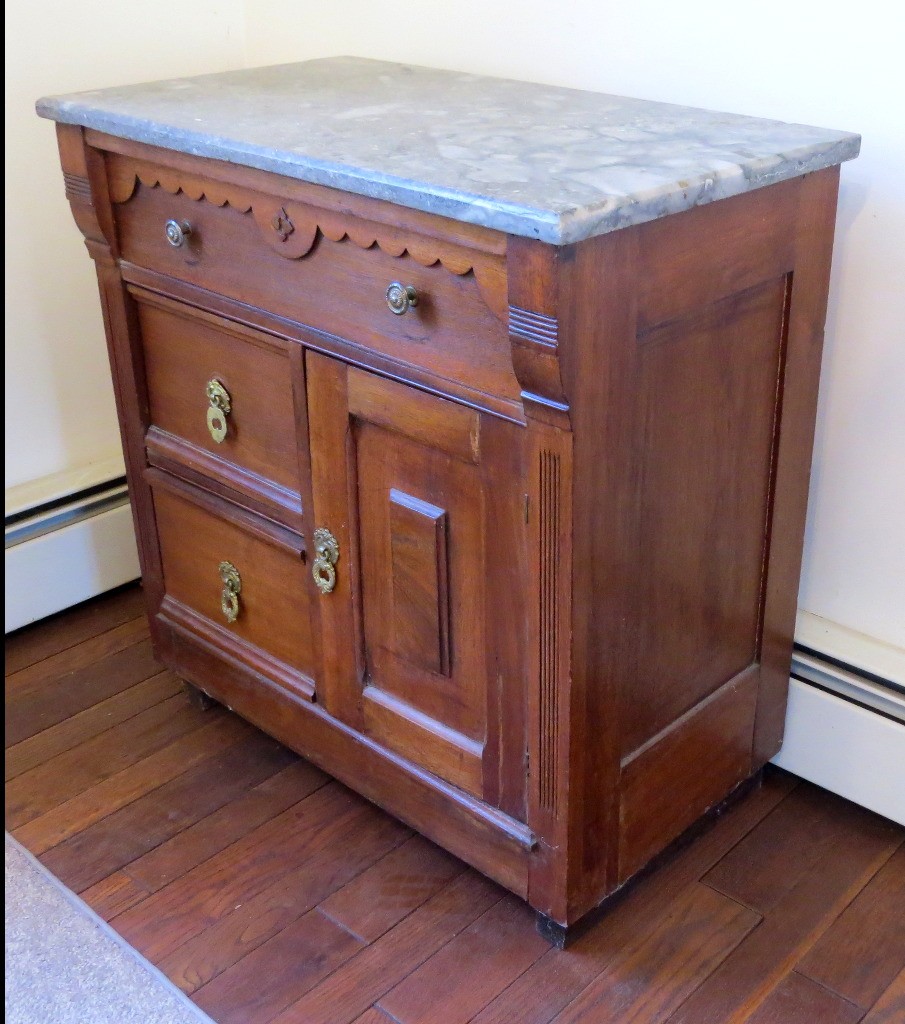 A Victorian era oak washstand with gray marble top, 30" wide, 16.5" depth and 28" height, 3 drawer, one door.