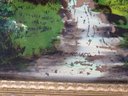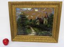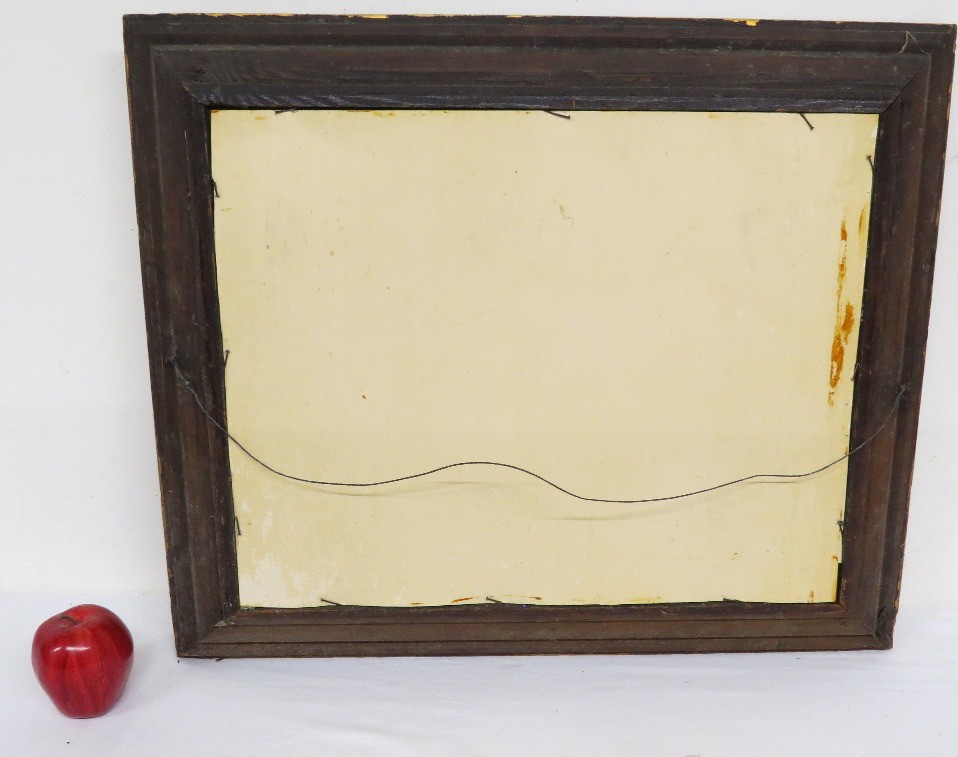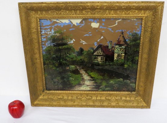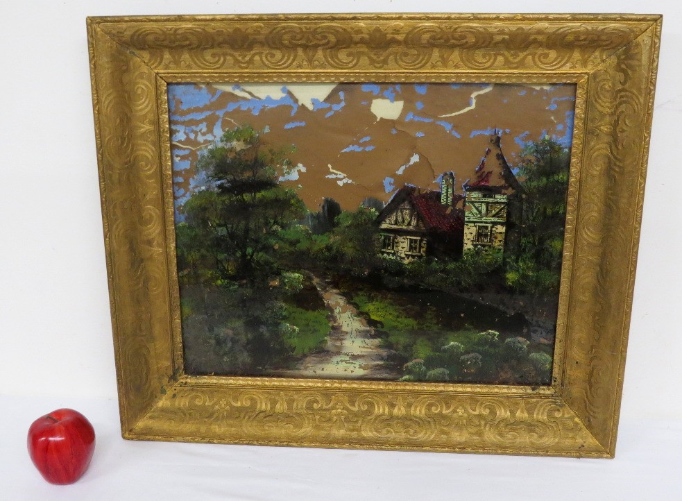 A Victorian era reverse paint on glass painting, with significant deterioration to the painting, but the frame is nice and certainly can be repurposed. Frame measures 21.75" x 25.75" with sight line of 16" x 20".
