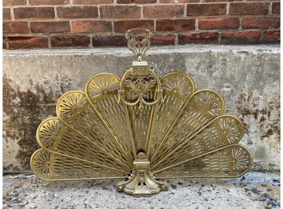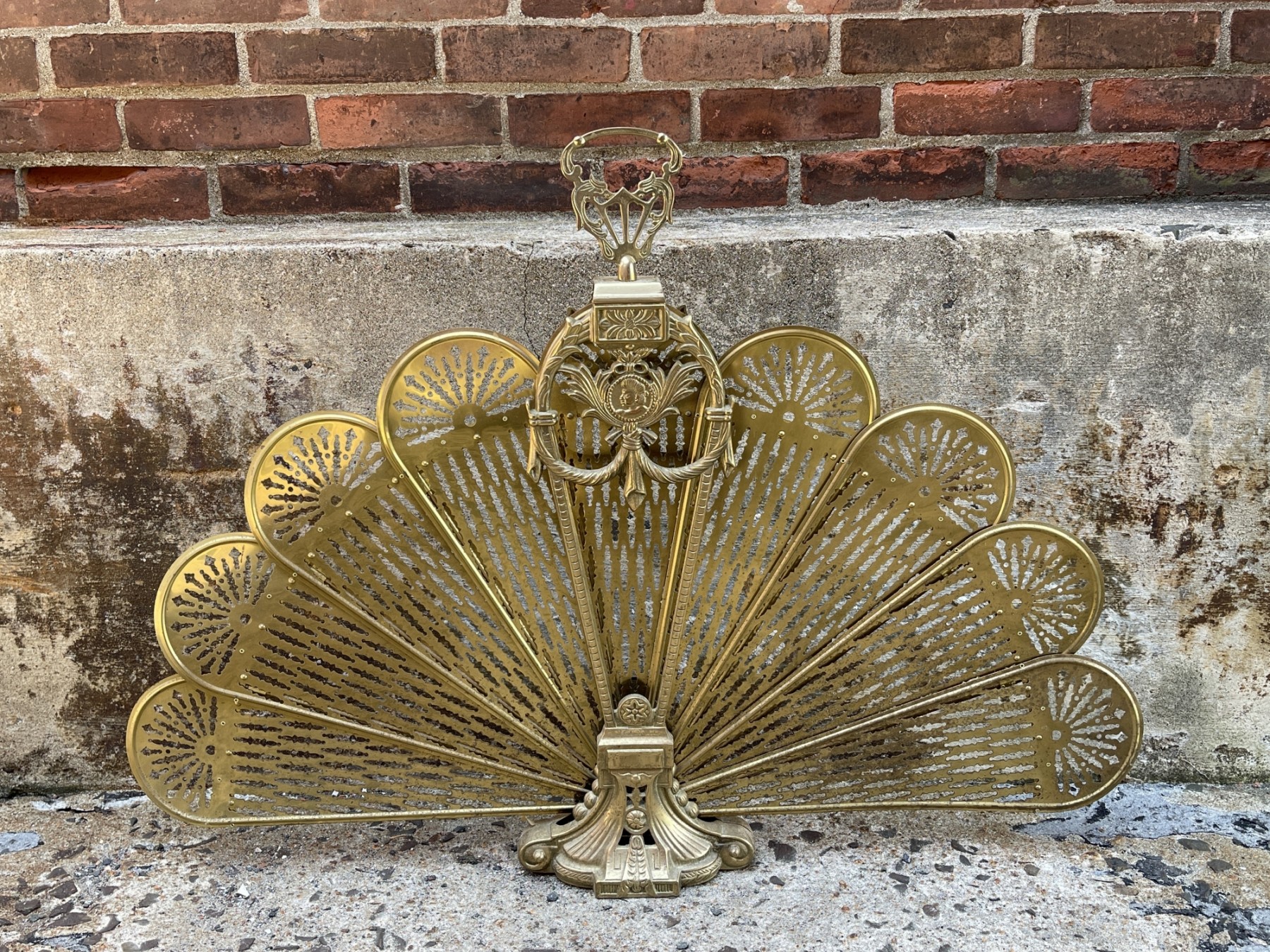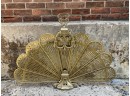 Victorian style brass peacock fireplace folding fan screen that is sometimes also used as a window screen. It is adorned with a finial/handle with a dragon motif on top for carrying it. The intricate detail of the filigree cut out screen creates an amazing reflection as it catches the light. There are four fans on each side and one in the center. You simply fold it up when you want to make it smaller. It measures 27 inches tall and 9 inch wide base when closed and 37 inches wide when opened.