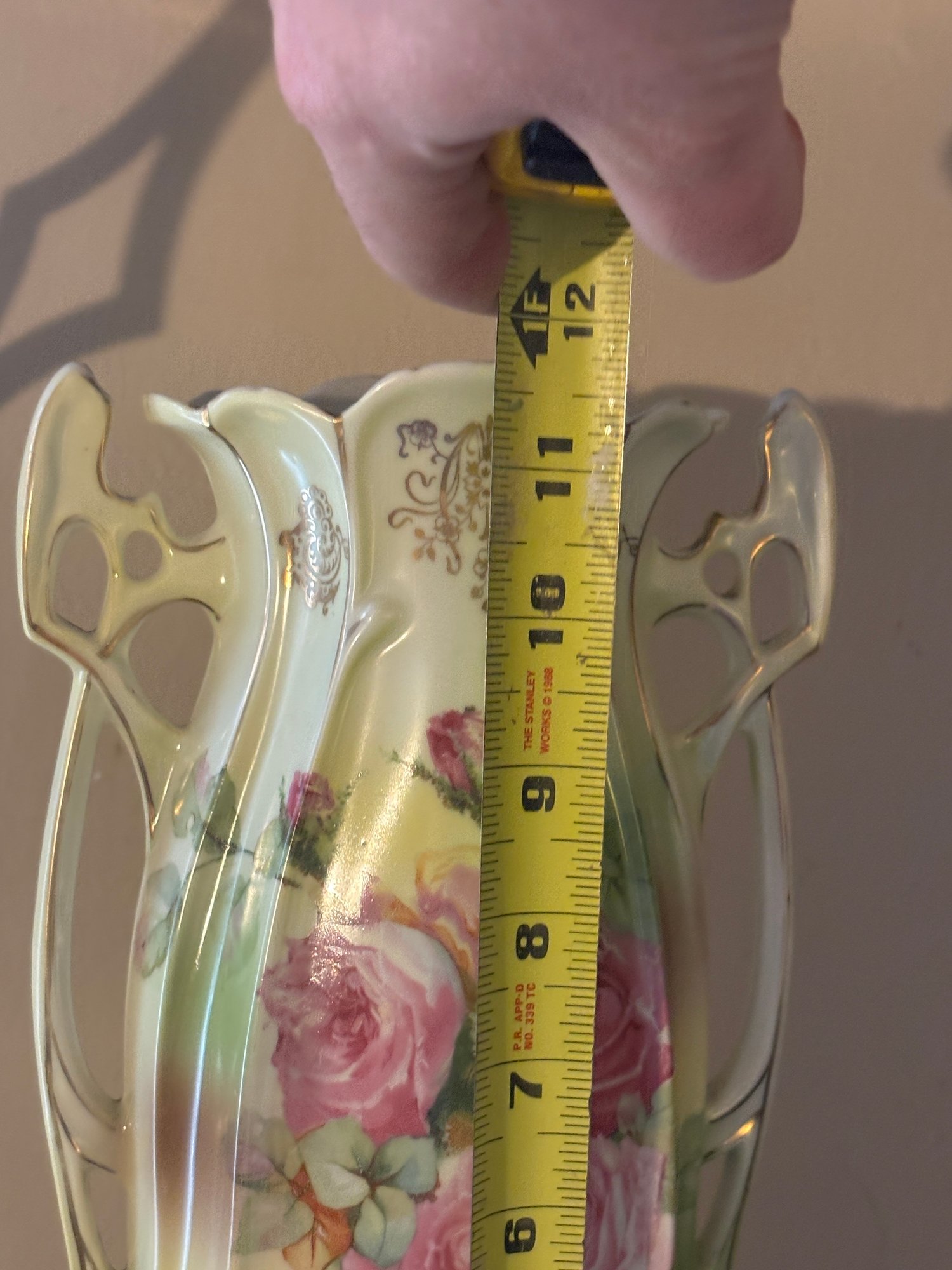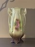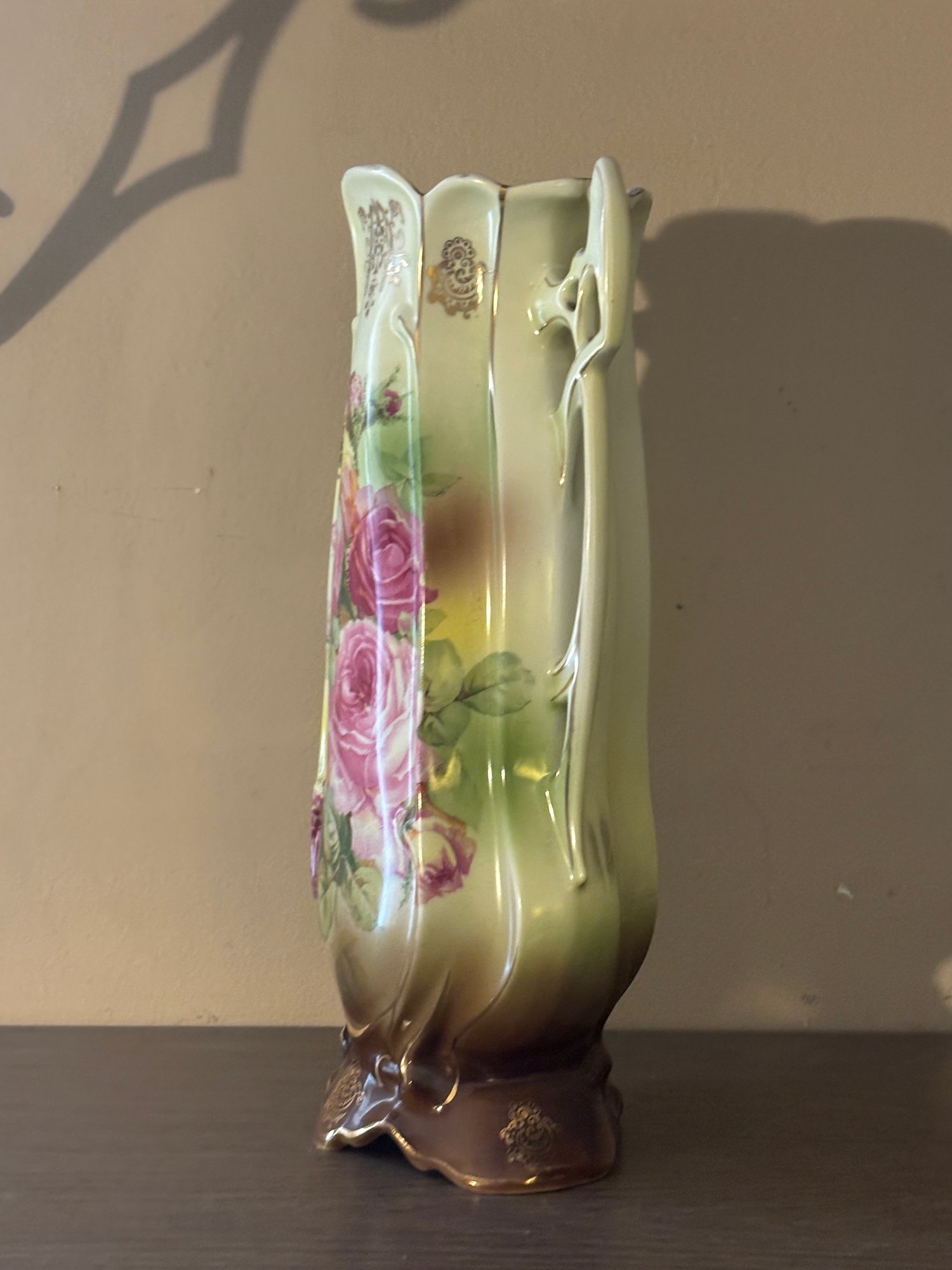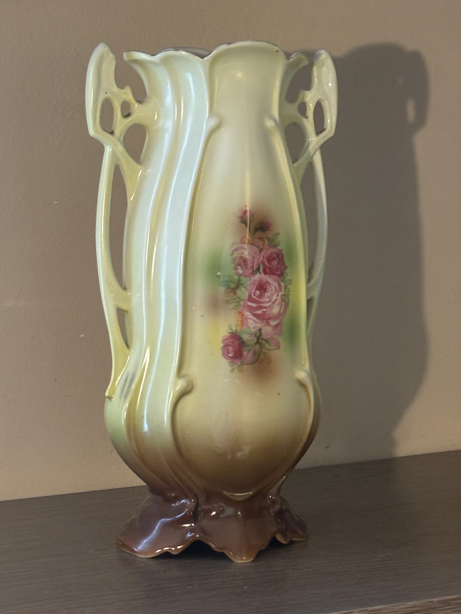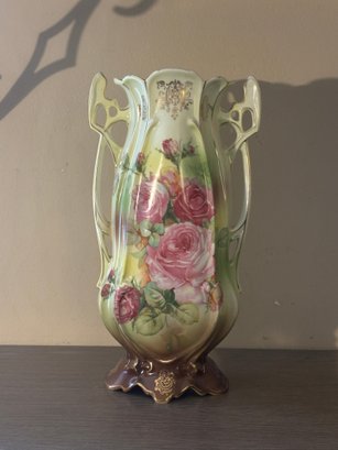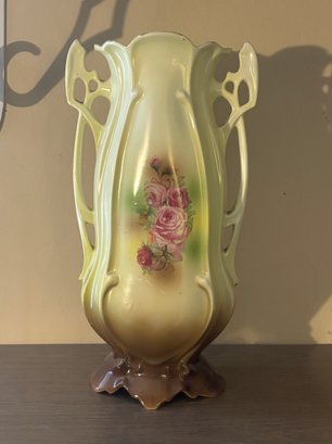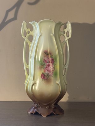 This impressive 12" porcelain vase features a softly blended ground of creamy ivory, pale green, and warm caramel tones, centered with a delicate rose bouquet vignette that feels straight out of a turn-of-the-century parlor. The silhouette leans Art Nouveau — all gentle curves, flowing lines, and organic movement — capped off with exuberant openwork side handles that curl and pierce like sculpted vines.