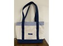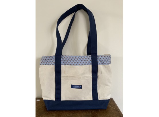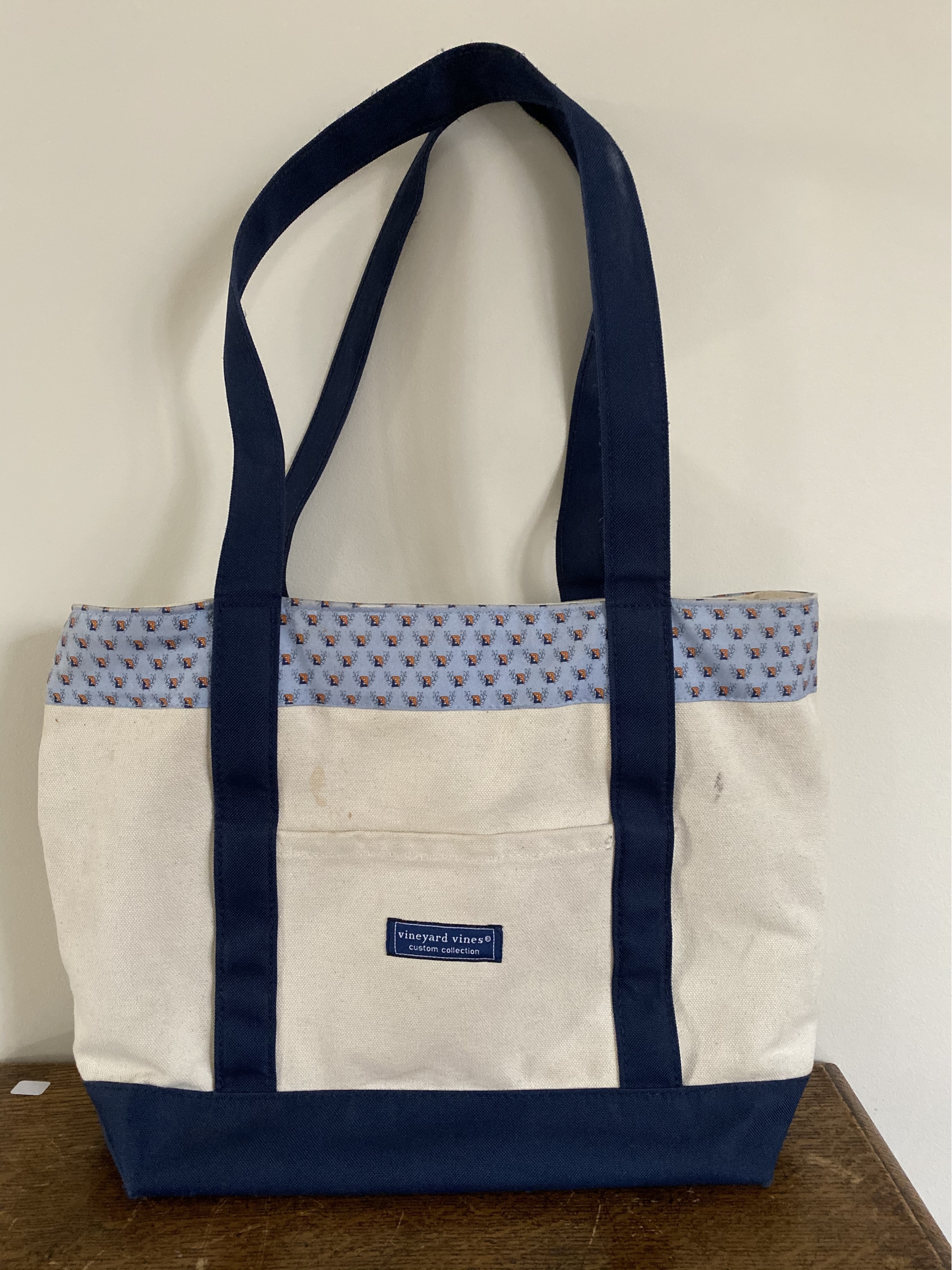 Classic Vineyard Vines canvas tote bag with custom Bucknell University pattern. Navy handle and zip top. Shows some staining.