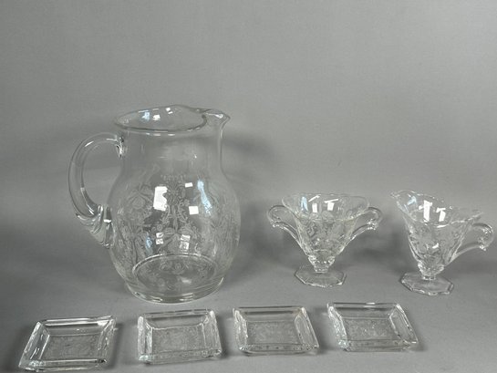 Vintage 1940s Heisey Etched Glass Orchid Pattern Pitcher, Creamer & Sugar double handled dish & four 3” Butter Pat or ashtray