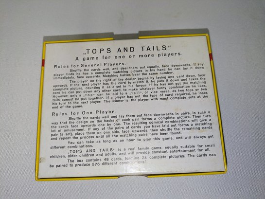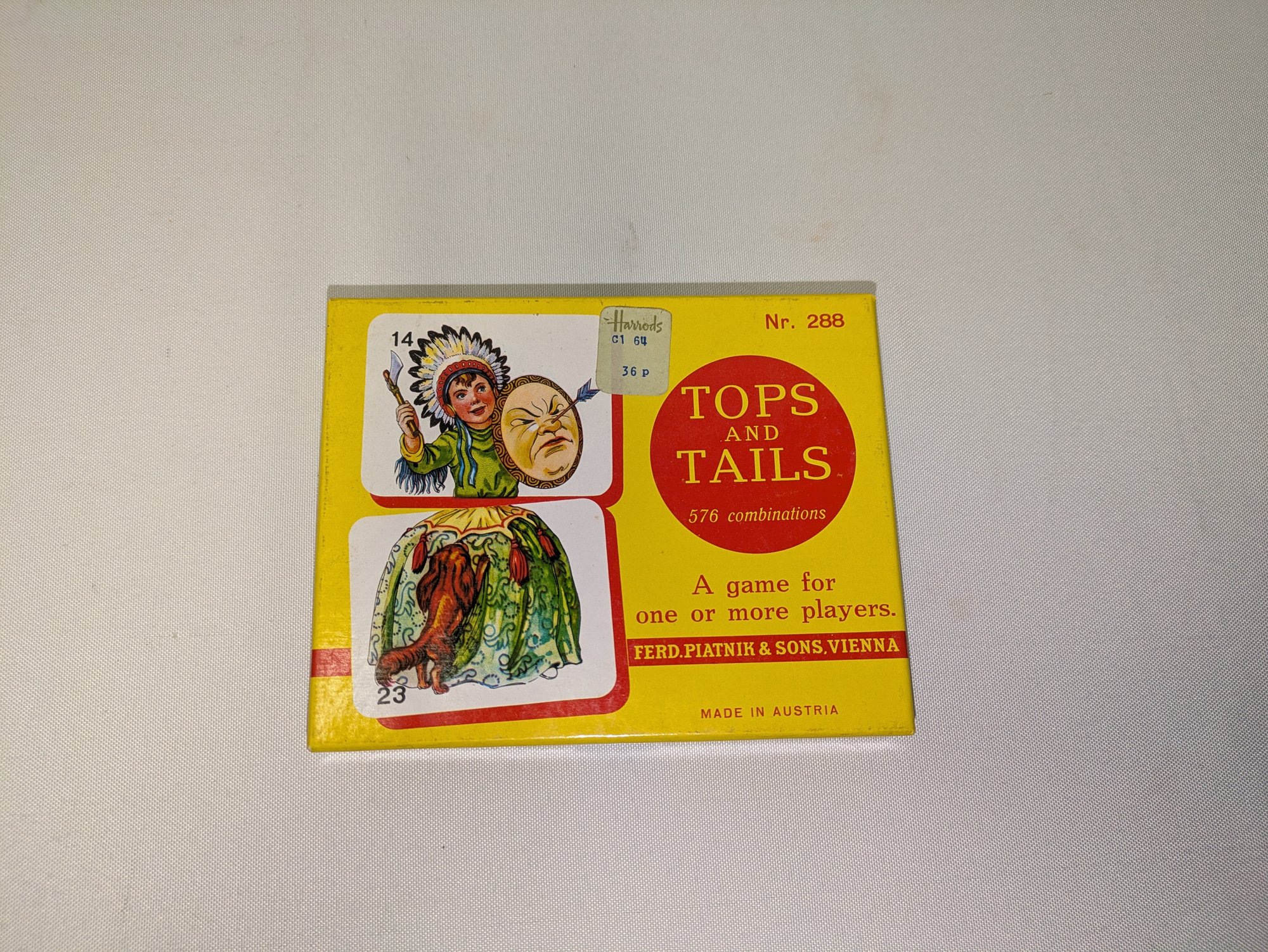 Vintage 1950/60s "Tops & Tails" card game, No. 288, by Ferd. Piatnik & Sons of Vienna, Austria. Purchased at Harrods, London. Slight wear to the box, the cards are all in Excellent/Very Good Vintage condition, and accounted for. Please see all photos as part of the description and condition.