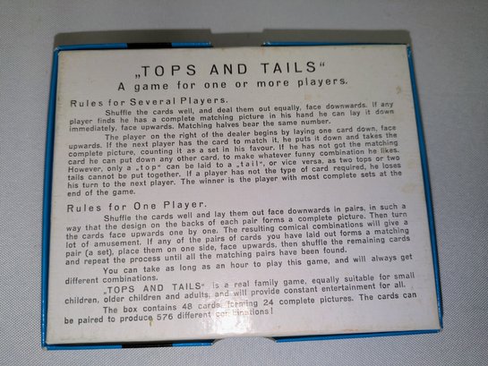 Vintage 1950/60s "Tops & Tails" card game, No. 289, by Ferd. Piatnik & Sons of Vienna, Austria. Purchased at Harrods, London. Slight wear to the box, the cards are all in Excellent/Very Good Vintage condition, and accounted for. Please see all photos as part of the description and condition.