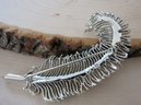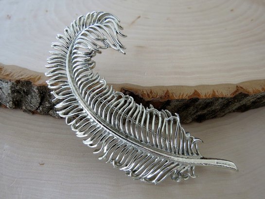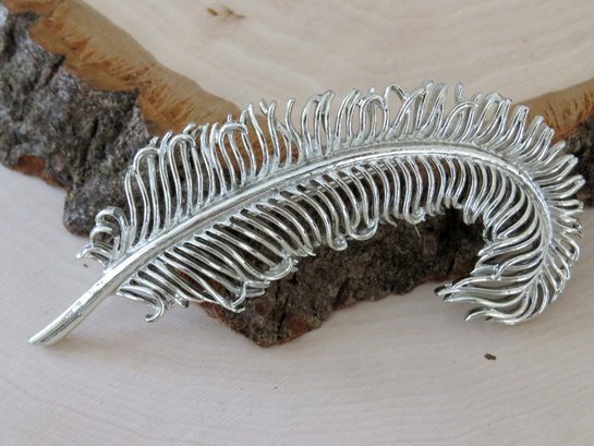 This beautiful Mid Century Pegasus metal ostrich feather brooch features a rhodium plated silver tone finish. Rhodium is a durable, tarnish-resistant, and bright white precious metal often used in plating high-end jewelry to give it a lasting, high-quality finish. The figural feather has individual feather barbs and measures 3 1/2" long. It has a working clasp and is Coro signed on the backside of the pin.