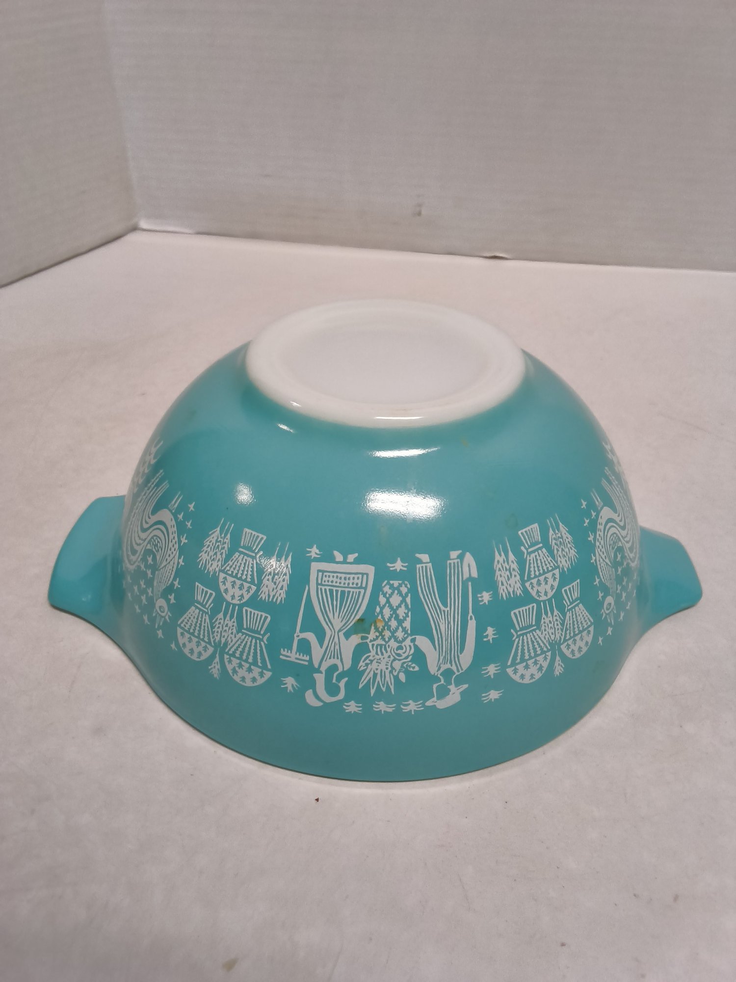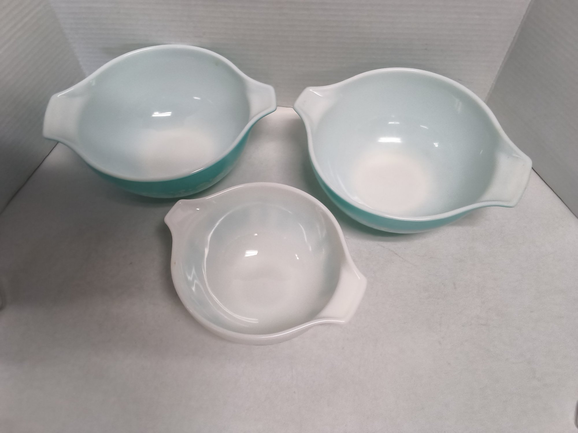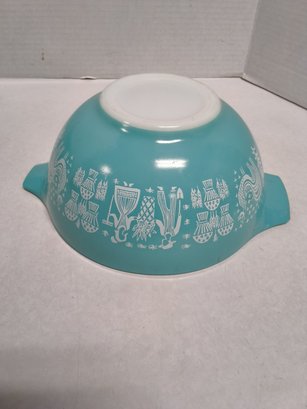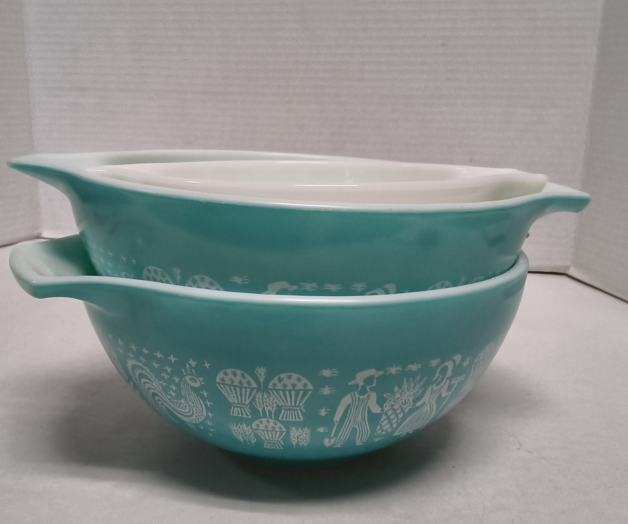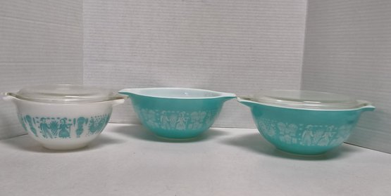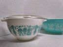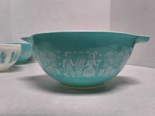 Vintage 1960s Pyrenees turquoise Amish butter print nesting bowls & 2 lids. See photos for closer look. Lids fit bowls-one for small bowl and the other for larger bowls.