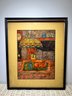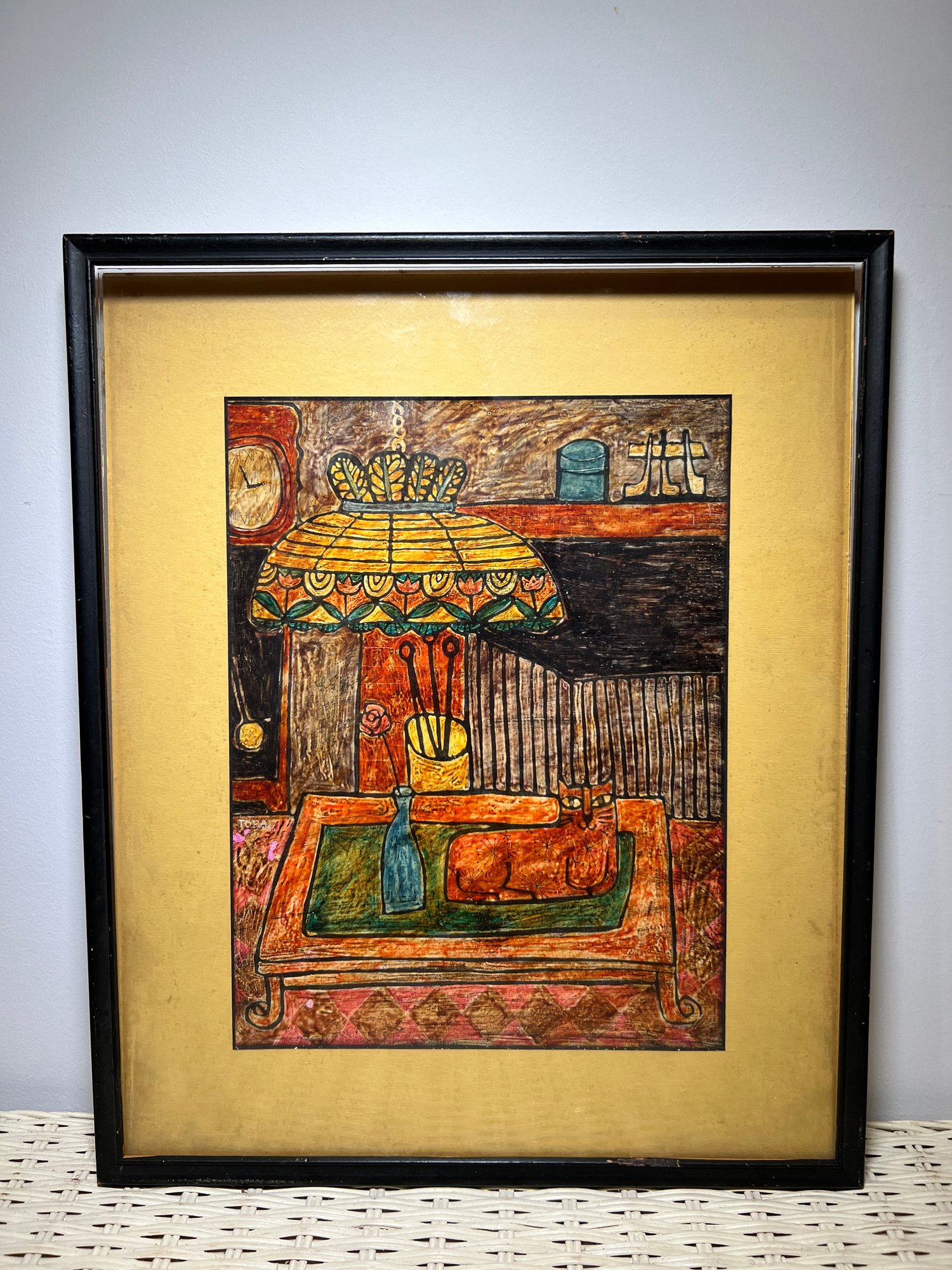 Unique vibrantly colored and patterned painting of a cat signed Tora '66 on the left. Paint finish is very unique, high gloss to give almost an enamel like finish but just a painting.