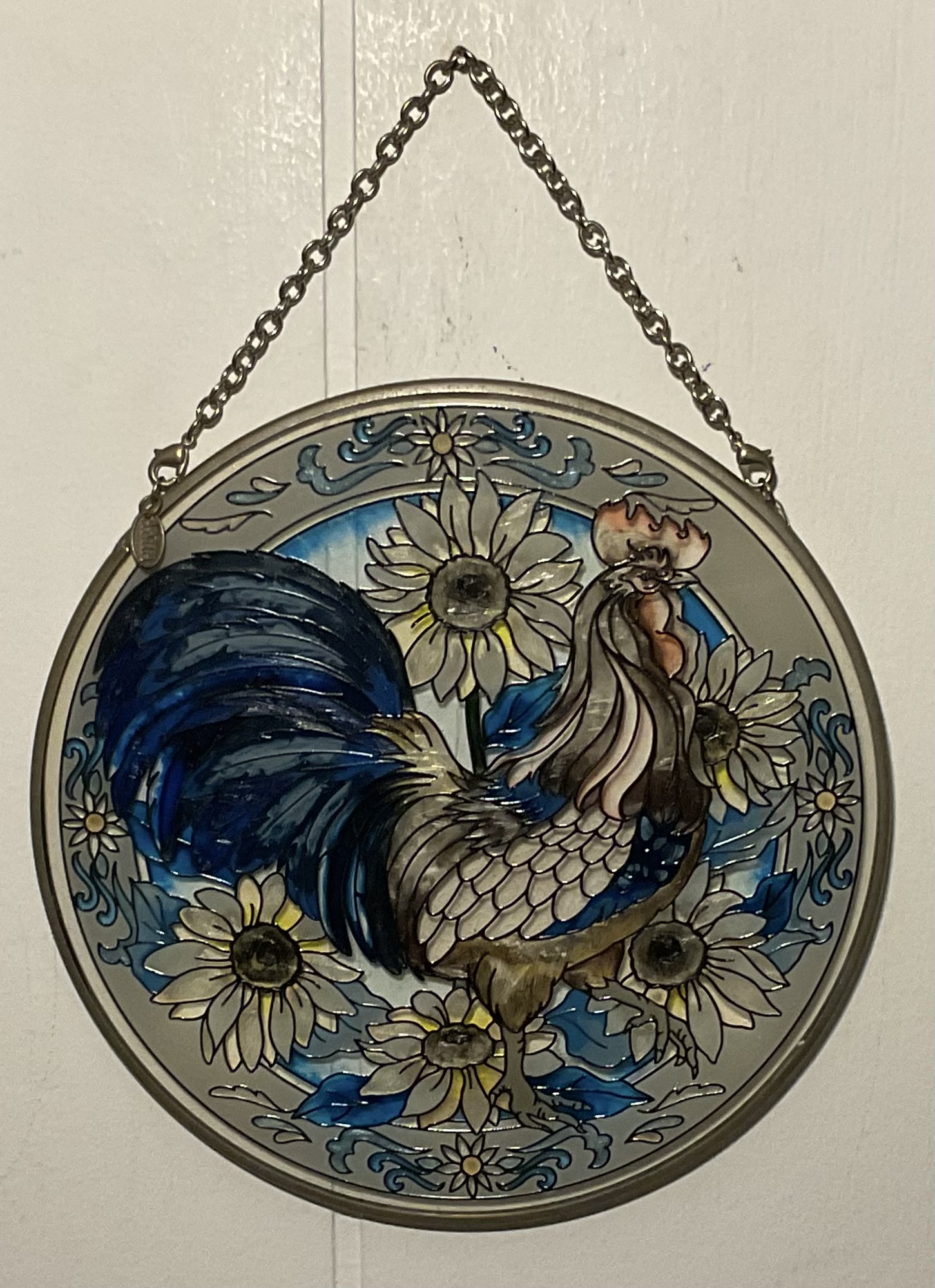 2 Rooster Delight Sun- Catchers, Round, Vibrant Coloring Blues & Greens,
