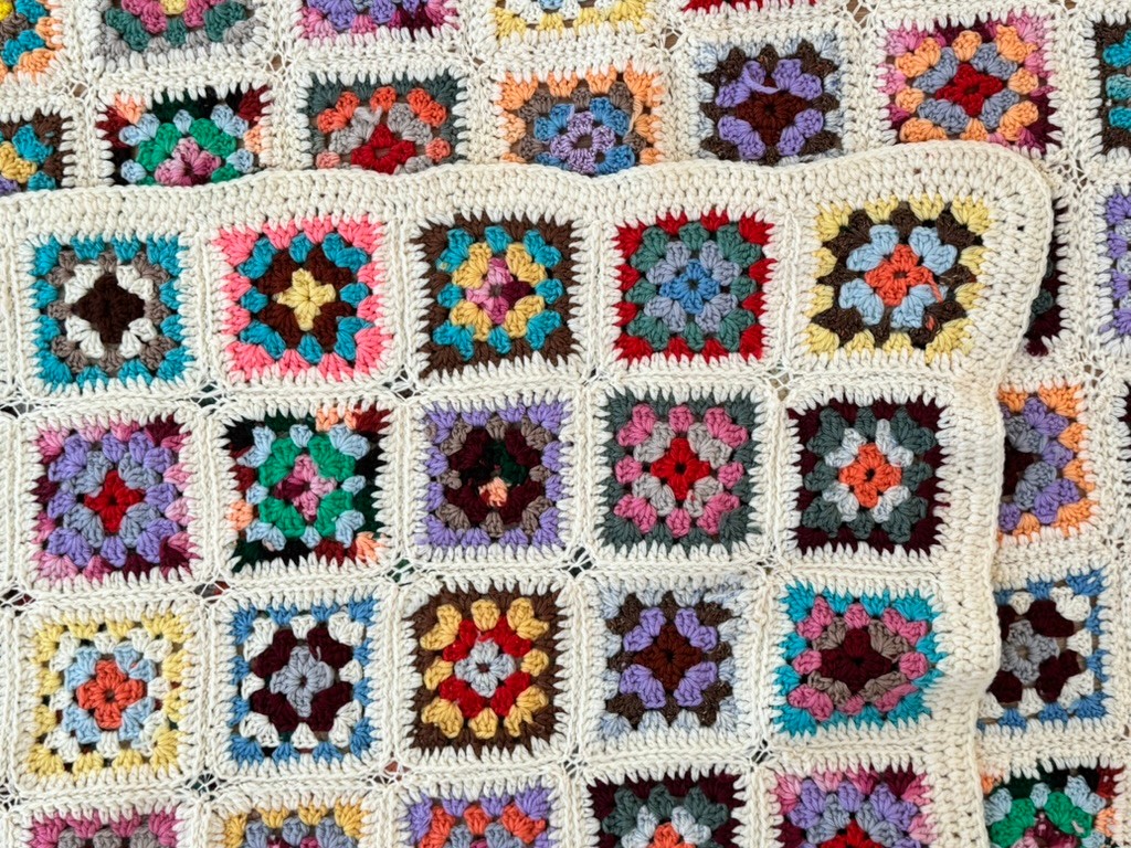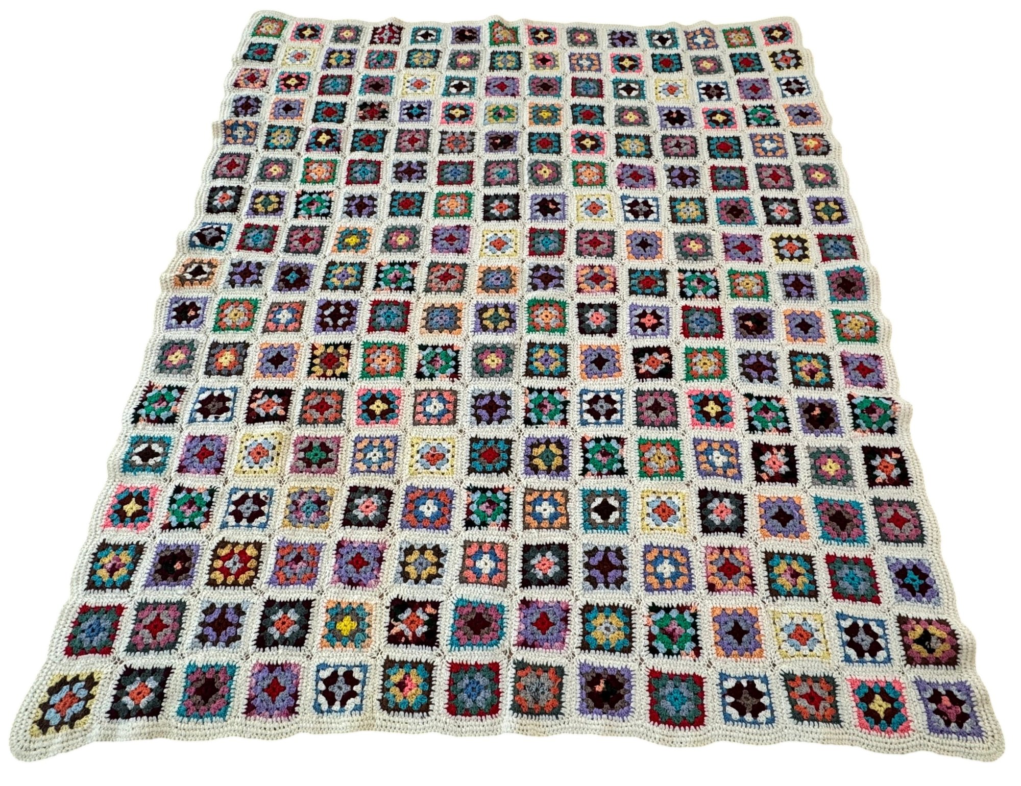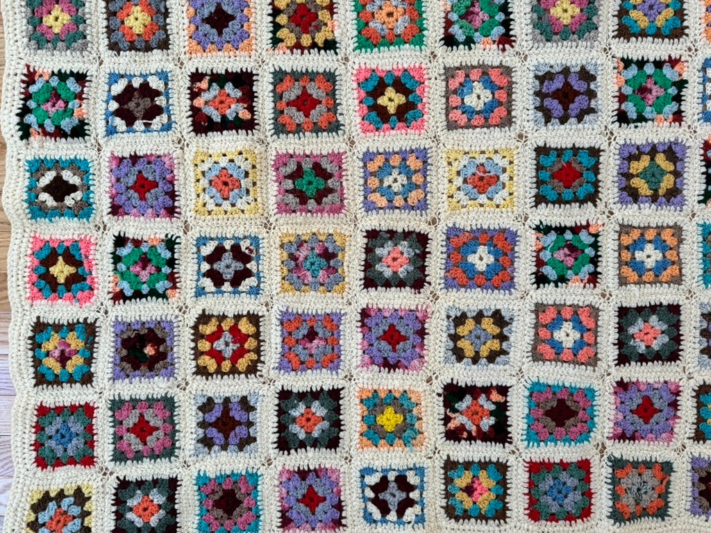 Note: overall good vintage condition, one square has a bit of loose yarn, please see photos.