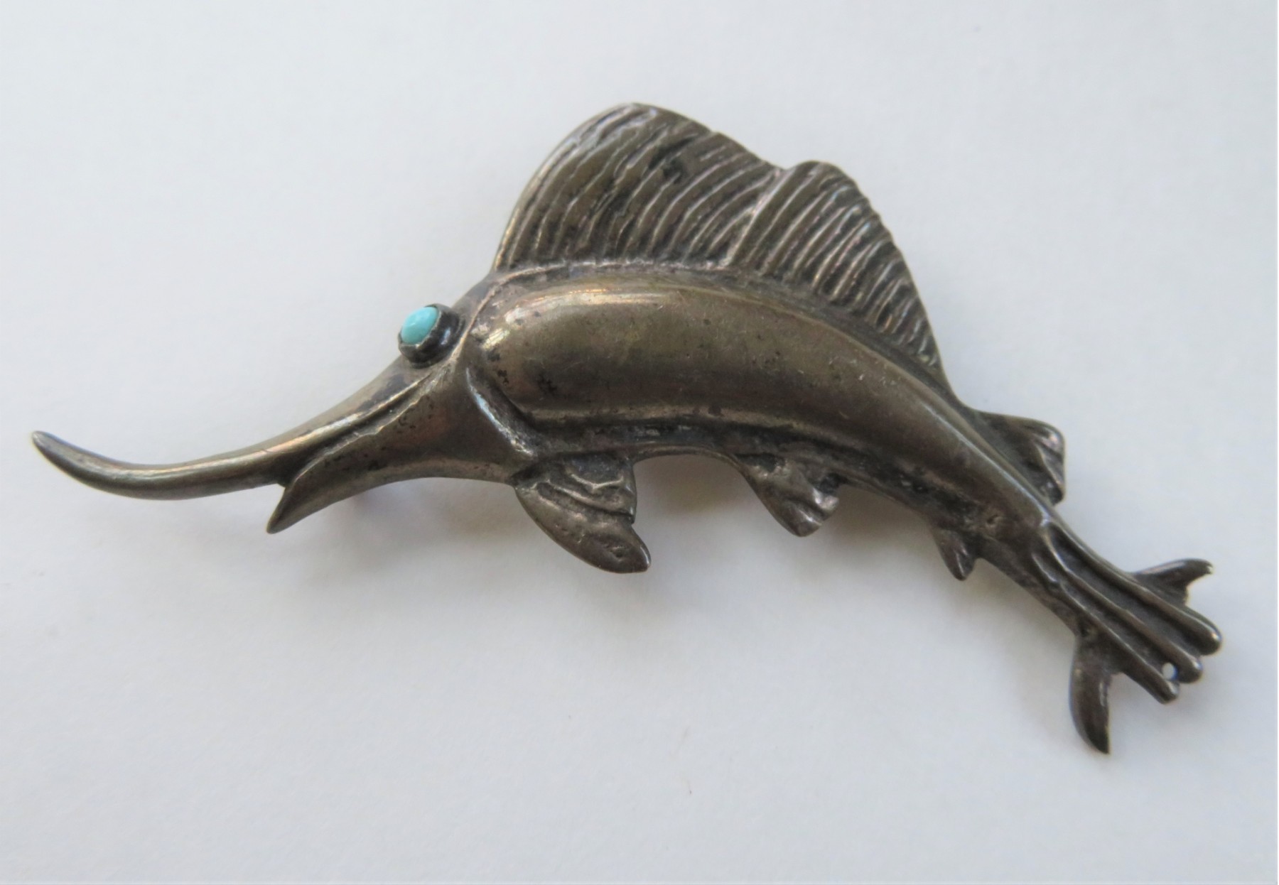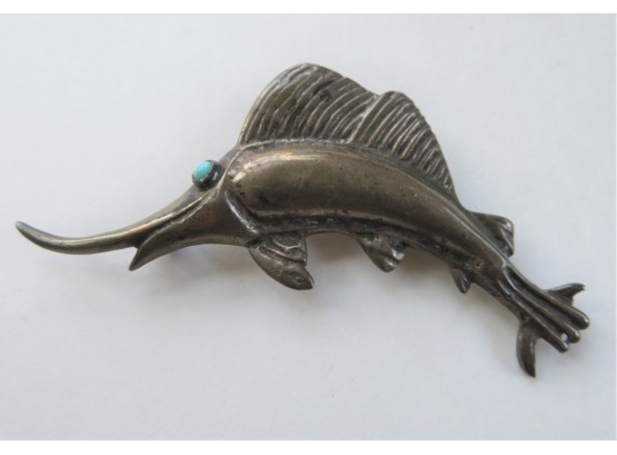 Vintage 925 Sterling Silver Sailfish Marlin Swordfish Brooch Pin Turquoise Eye