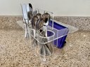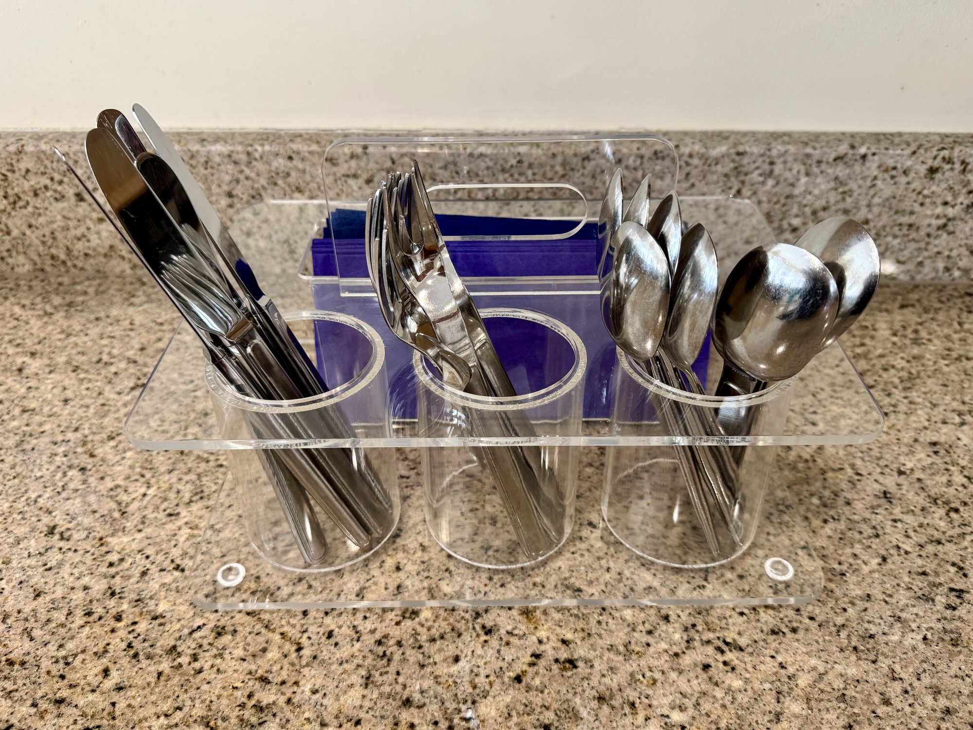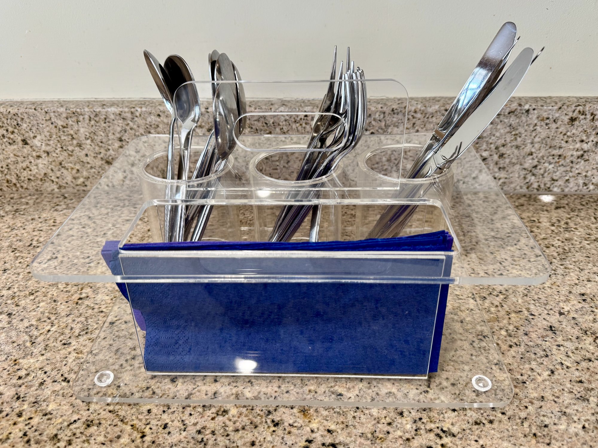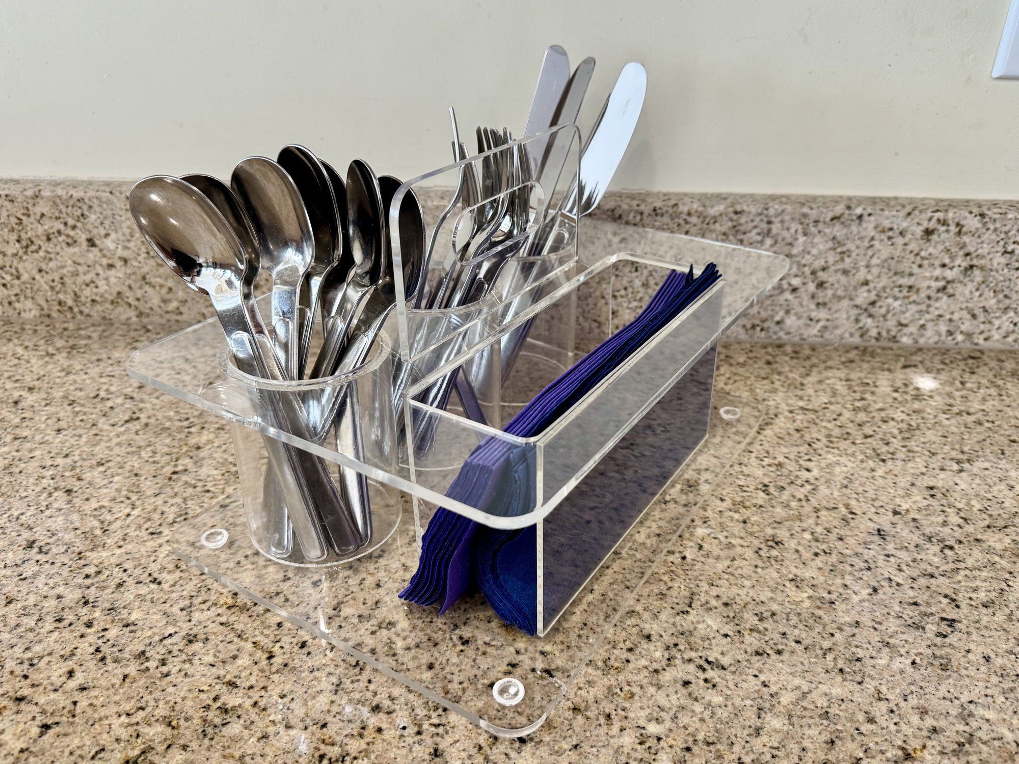 Clear acrylic rectangular 11 1/2 x 8 1/4 caddy with handle. Note: Silverware and napkins not included.