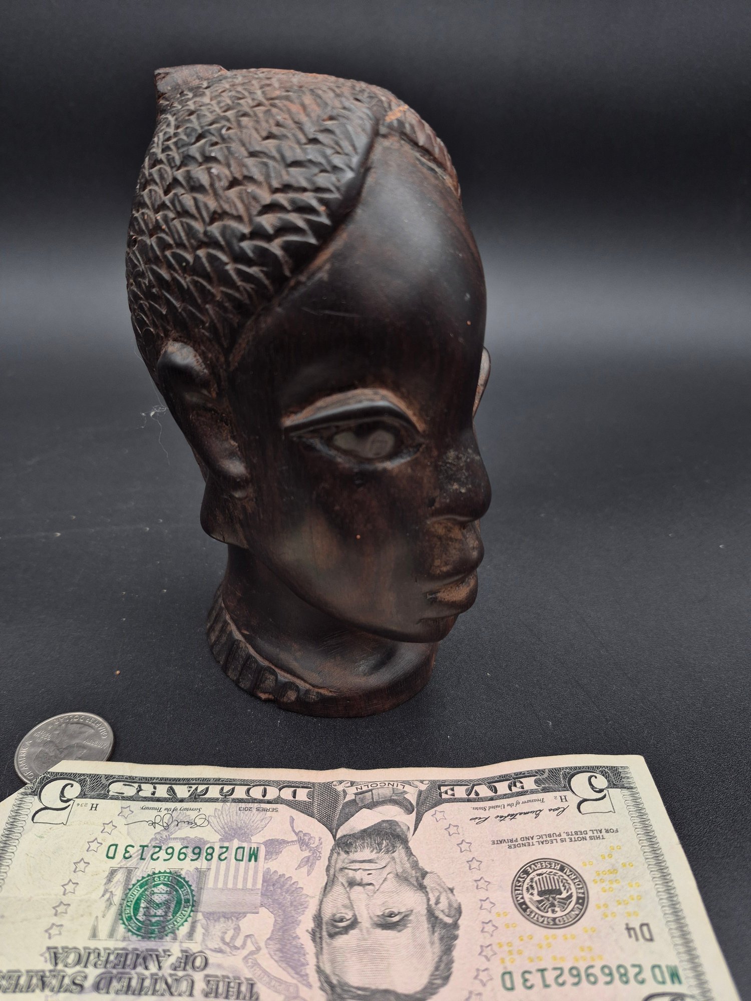 A charming vintage African bust, a female figure with elongated lobes and traditional tribal hairstyle. Stands 6", perfect scale for shelf decoration. Solid rosewood, in good condition.