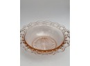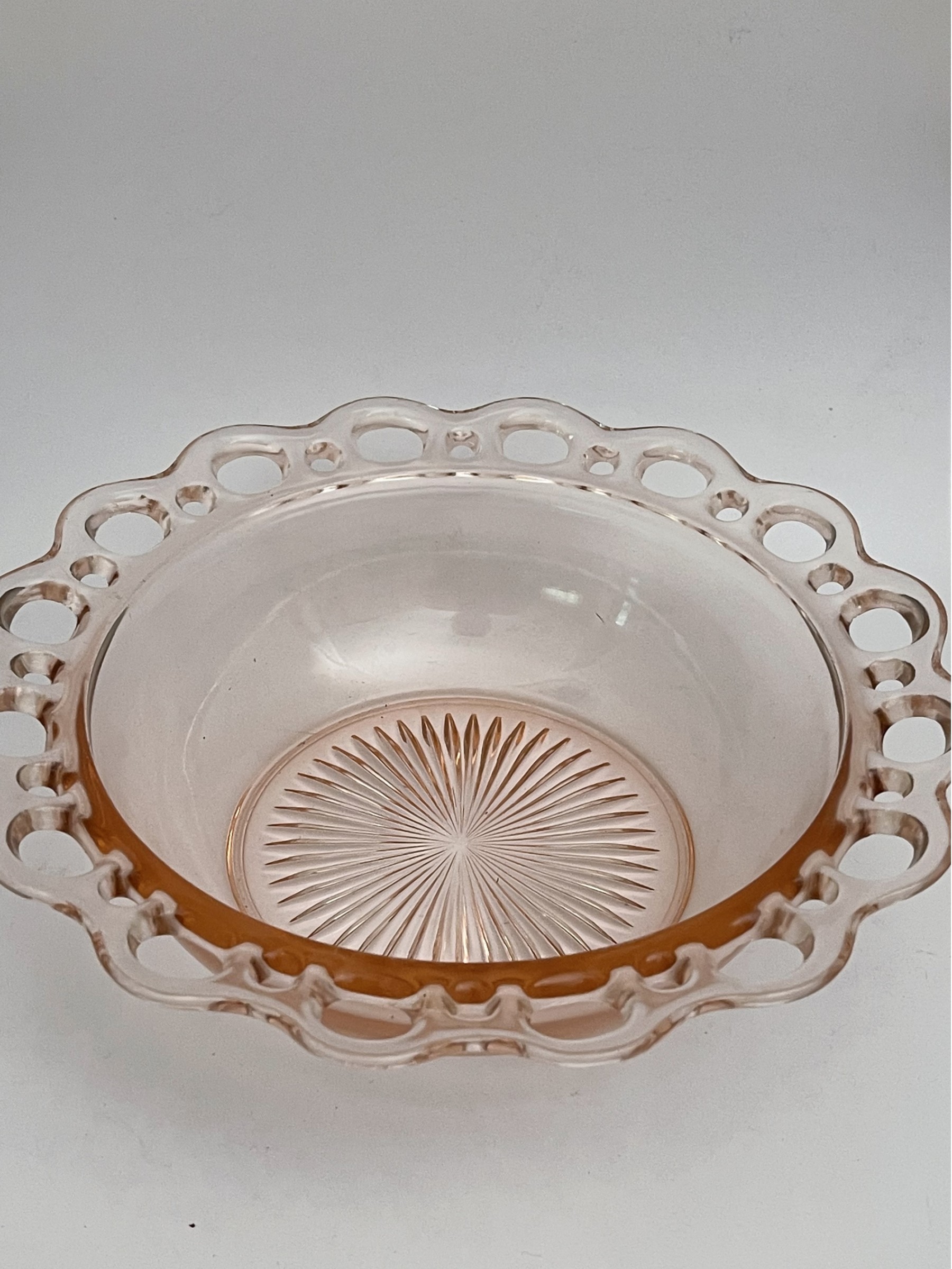 This is a really pretty punk depression glass lace trim bowl that measures 9.5 inches in diameter. Such a perfect dish for candy, a side dish or decorative items. There are no chips or cracks detected.