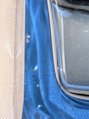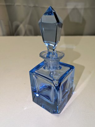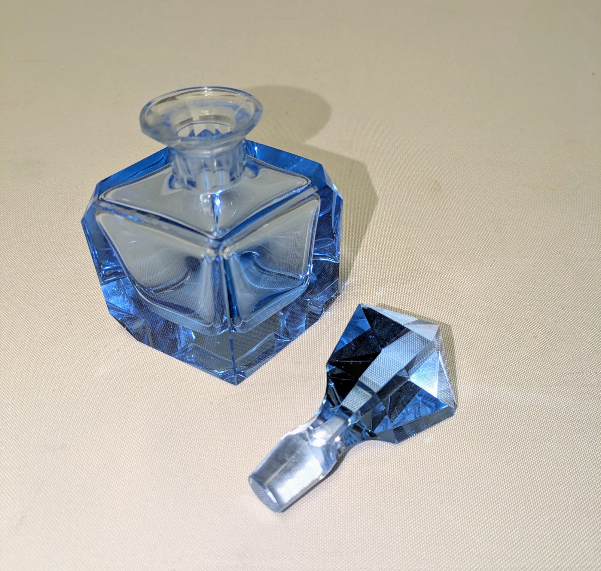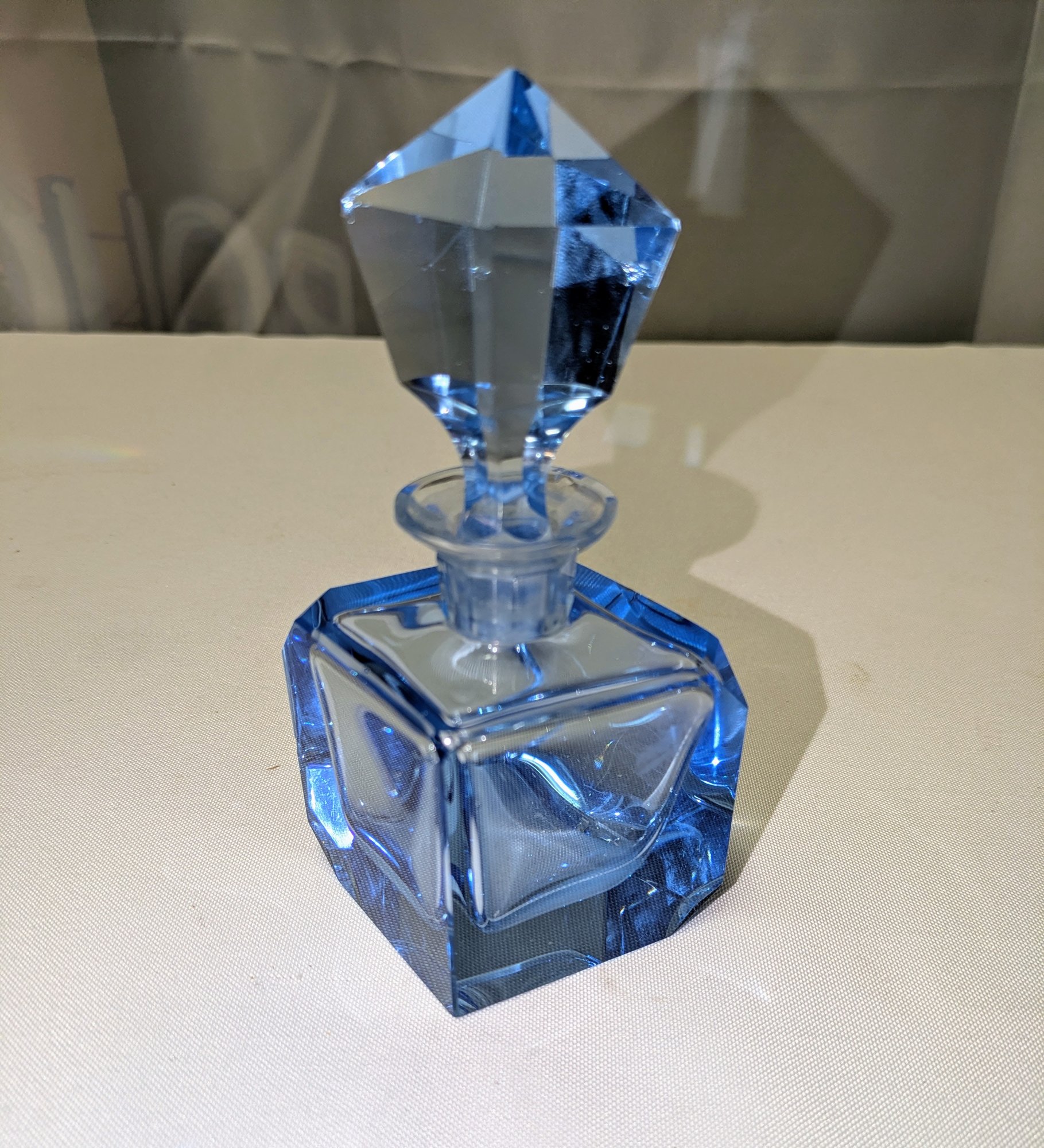 Vintage Art Deco Czech, Ice Blue Art Glass Geometric Perfume Bottle. Stunning Detail and Design. Small chip on the side, consistent with age, use, and movement. Overall, Very Good Vintage Condition. Please see all photos as part of the description and condition. 3.5"H (without stopper) x 5.5"H (with stopper) x 2.75" x 3.25"