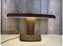 A fantastic Vintage Art Deco Machine Age Moe Desk Lamp with original brown wrinkle painted finish. It is one of the first fluorescent lamps made. You have to hold down the button for a second before it turns on. The early ones have a different system and that’s how they were made. Super cool. The top measures 20.5 inches x 5 inches. The base is 10x5 inches and the entire piece measures 11 inches tall.