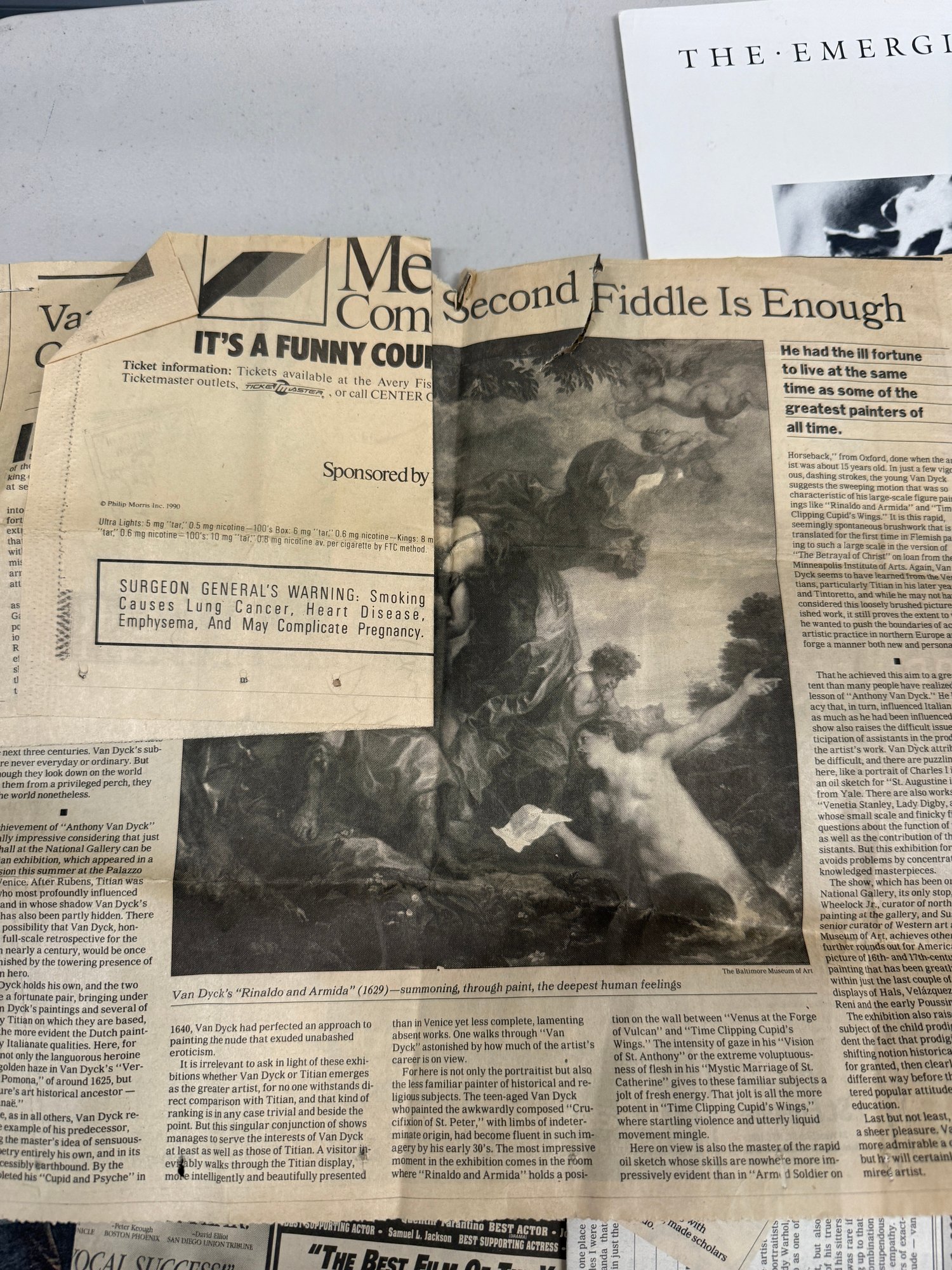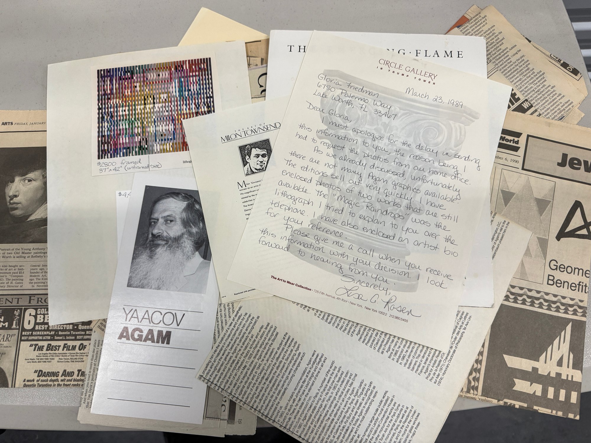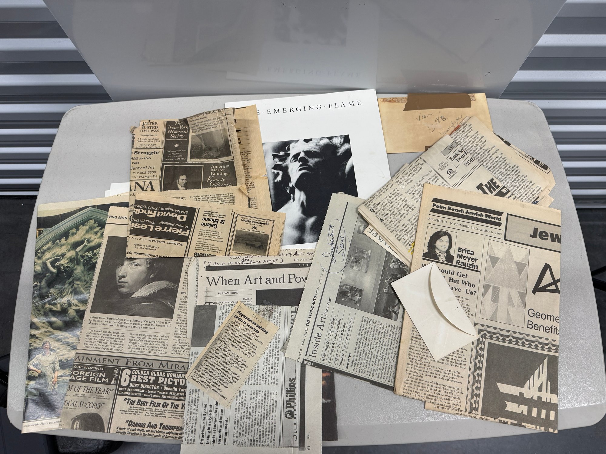 Vintage art-related ephemera including newspaper clippings, gallery materials, and correspondence dating from the late 1980s through 1990s. Includes references to Old Master works, exhibition articles, and material related to artist Yaacov Agam along with a handwritten gallery letter dated 1989. Condition varies with age-related wear, toning, and folds. Sold as found.