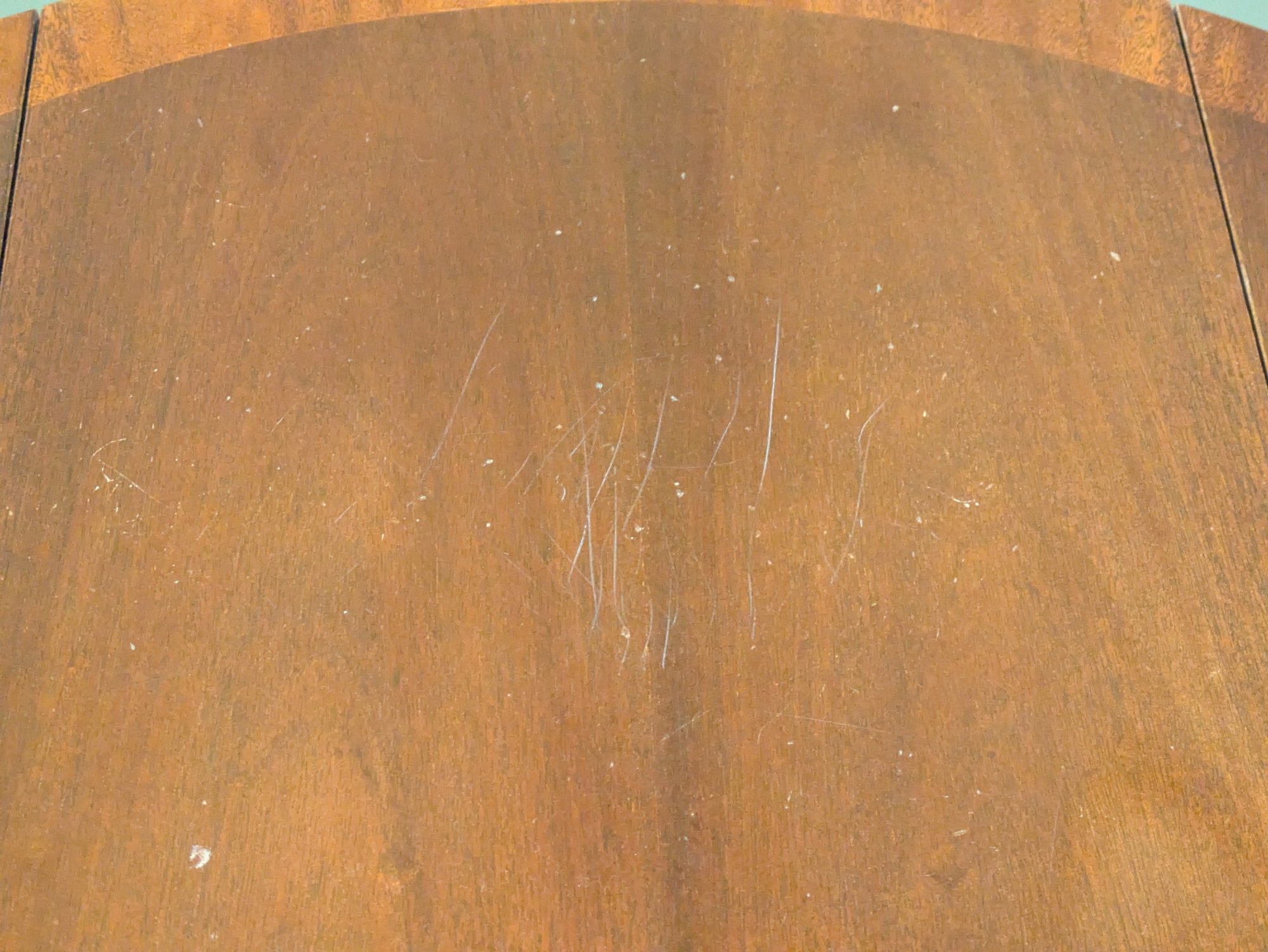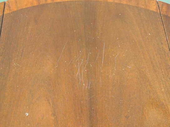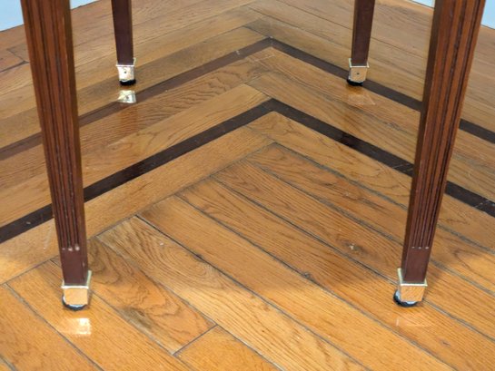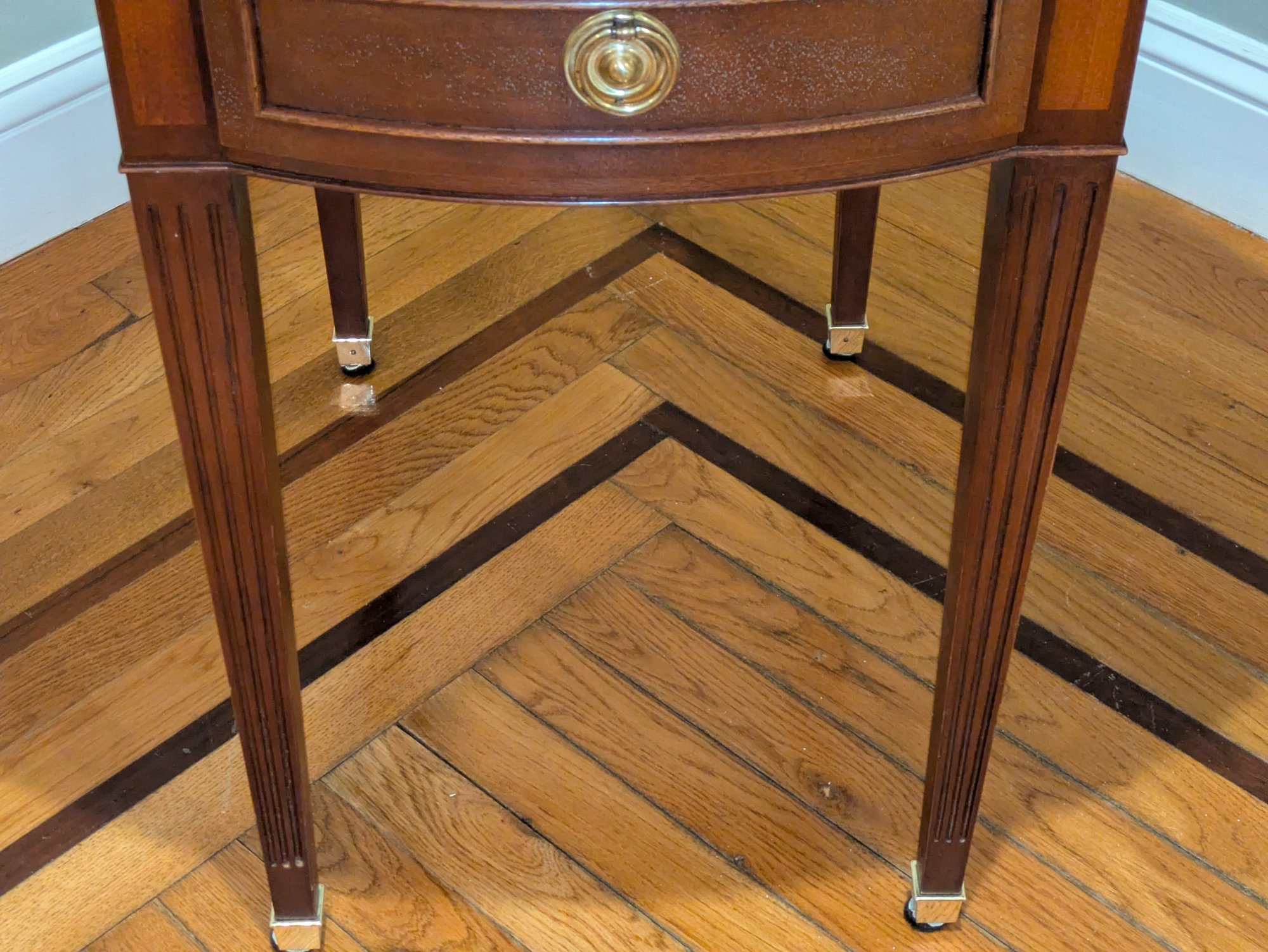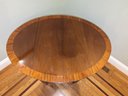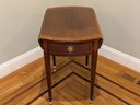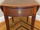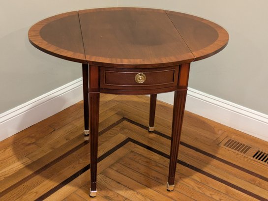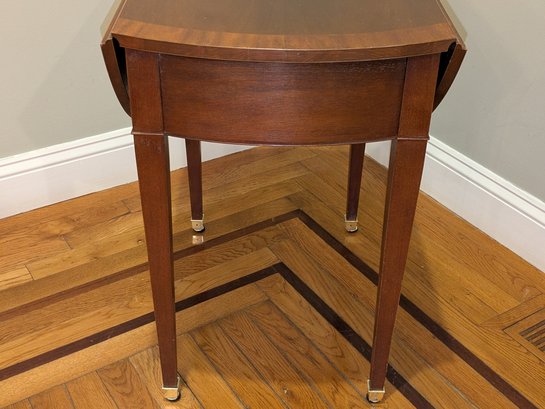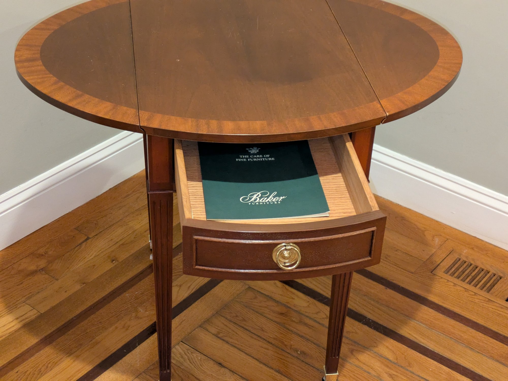 Vintage Baker Furniture Mahogany and Satinwood Inlaid Drop-Leaf Pembroke Drop Leaf Table. This is a truly stunning table and would look magnificent in any area of the home or office. The table is made of solid mahogany with two hinged folding leaf sides, one central drawer, fluted, carved tapered legs, and brass hardware. There are very minor marks, consistent with age and use. Overall Excellent/Very Good Vintage Condition. Please see all photos as part of the description and condition. 16"W x 24"H x 24D (With both leaves down) / 31"W x 24"H x 24"D (With both leaves up).