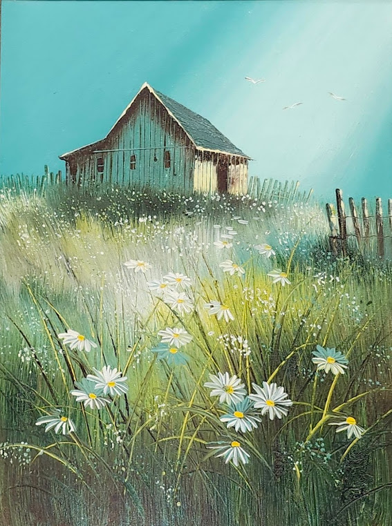 This charming Vintage Barn & Daisies Scene Original Painting captures the idyllic essence of rural life in soft blue and green tones. The artwork features a rustic barn, set against a serene landscape that evokes a sense of peace and nostalgia. Delicate daisies bloom in the foreground, their white petals contrasting beautifully with the lush greenery, adding a touch of freshness to the scene. The harmonious color palette creates a soothing atmosphere, making it a perfect piece for brightening up any room. This original painting is ideal for collectors or anyone looking to infuse their space with a touch of country charm and natural beauty. A lovely addition to farmhouse decor or a cozy living area, it invites viewers to appreciate the simple joys of nature. Signed by the artist "Kent" & is approx. 19.75 x 1.625 x 23.75".
