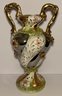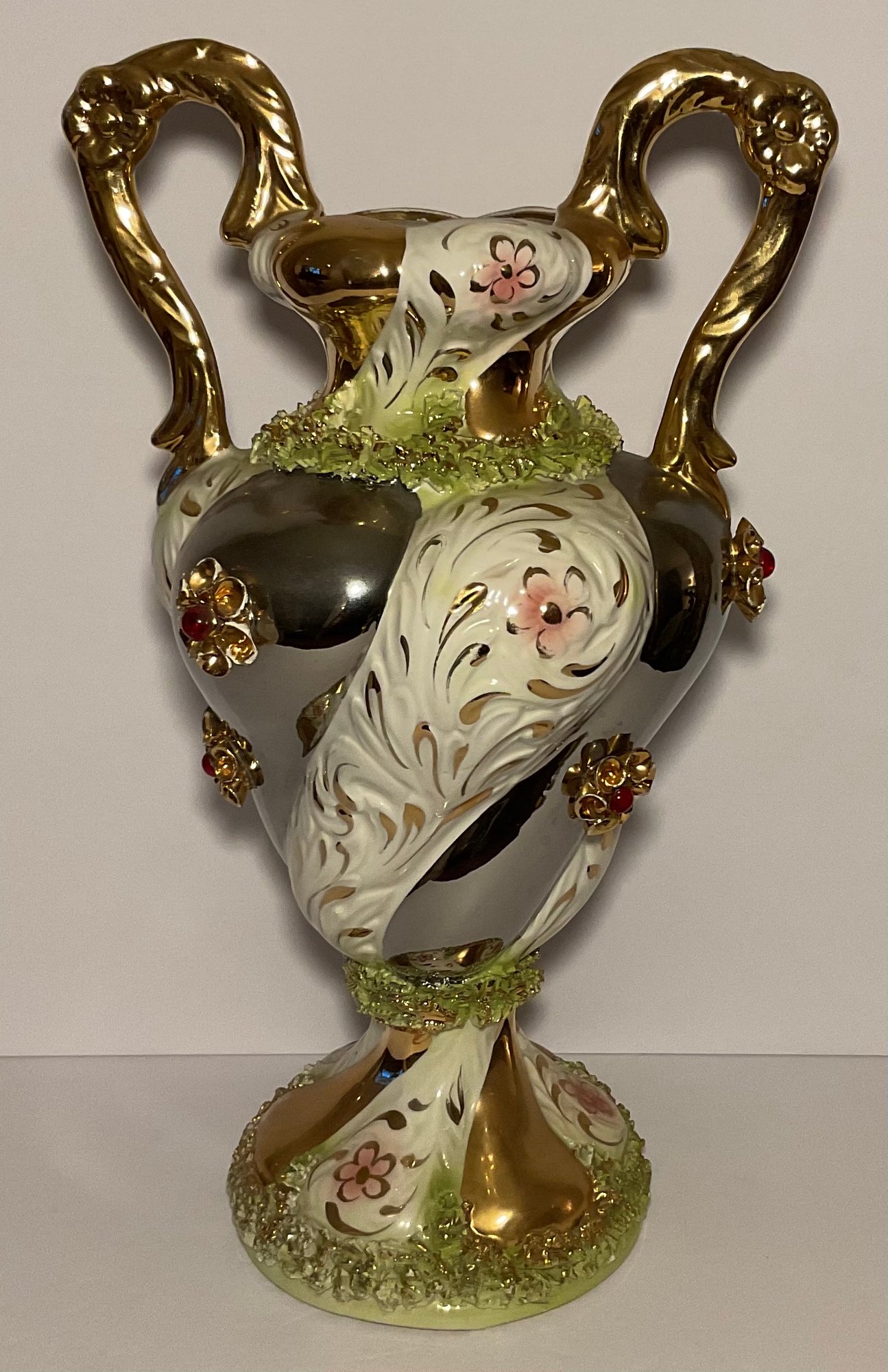 Vintage Bejeweled Gold Gilded Handle Ceramic Vase.