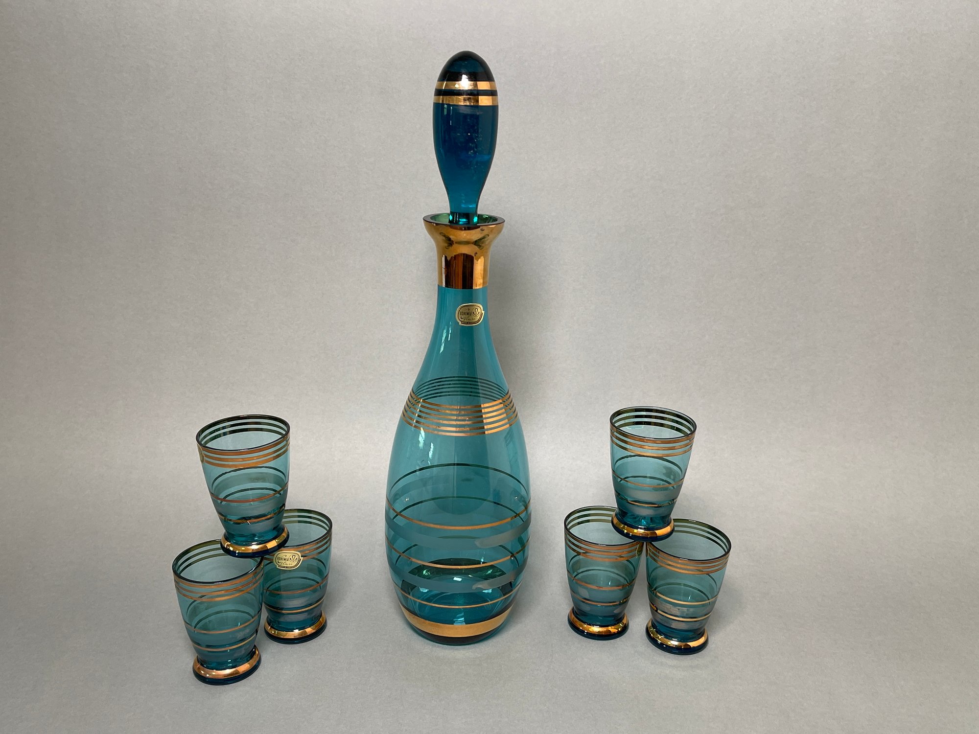 Vintage 1950's tealish with gold stripes Bohemian Czech decanter with six miniature glasses. No chips or cracks.
