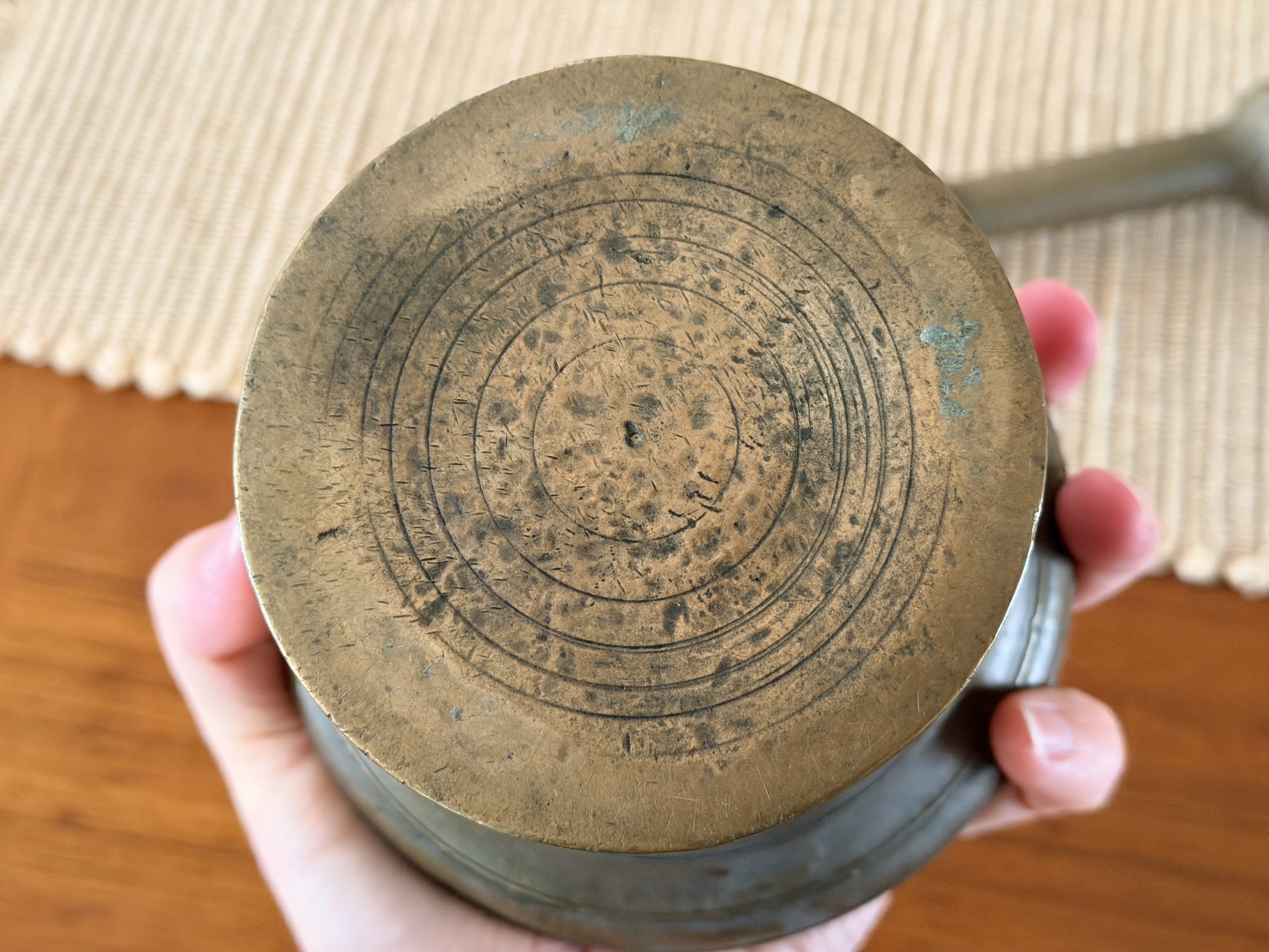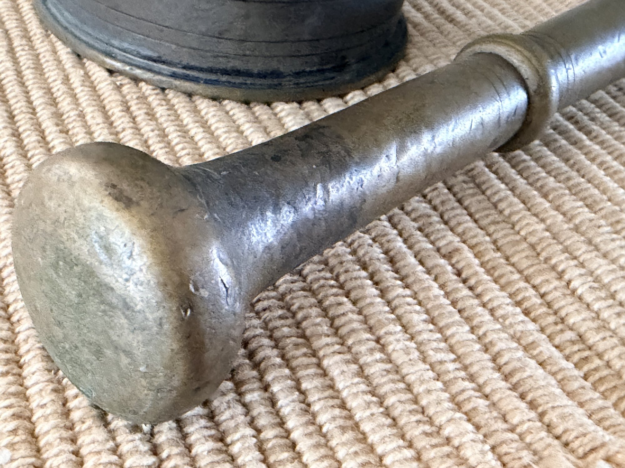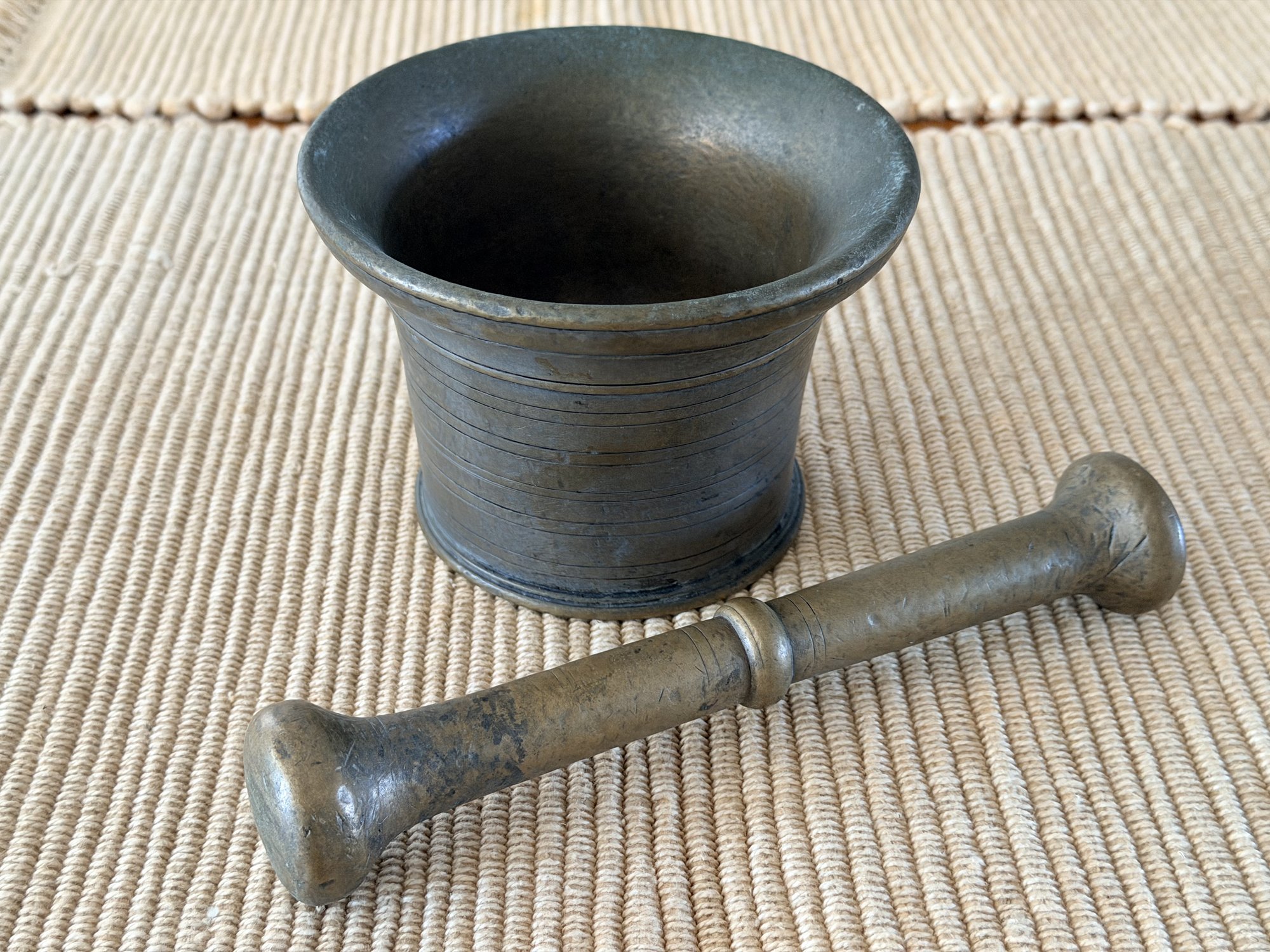 The coordinating pestle fits comfortably within the bowl and shows complementary wear, adding to the overall character of the piece. Ideal for use in the kitchen, bar, or as a decorative object in rustic, traditional, or eclectic interiors.