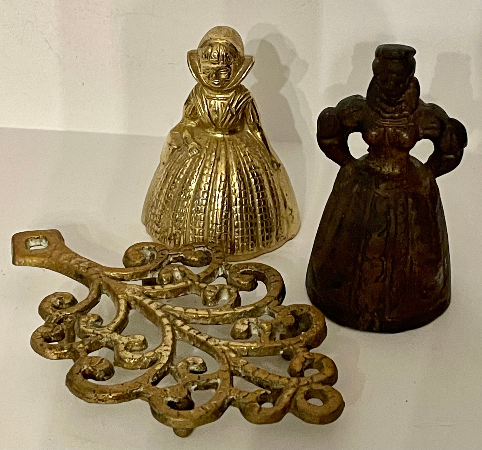Three nice vintage brass items - a trivet - 4 1/2" long and 2 lady shaped bells. One bell is 3" high and the other is 3 1/2" high.