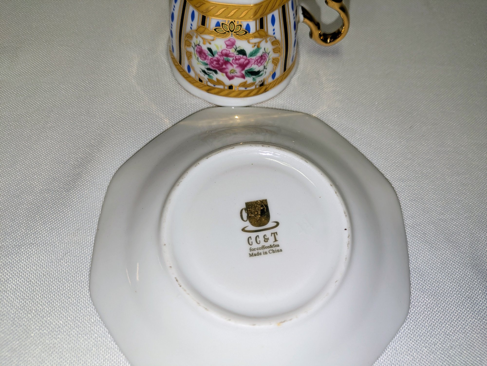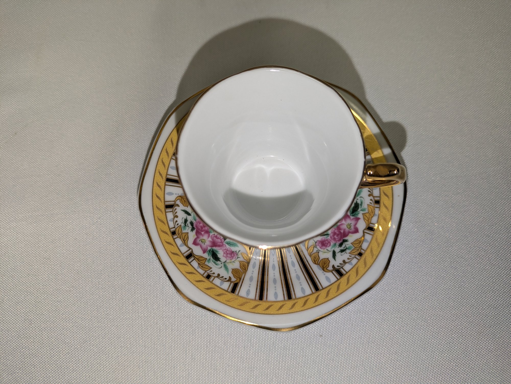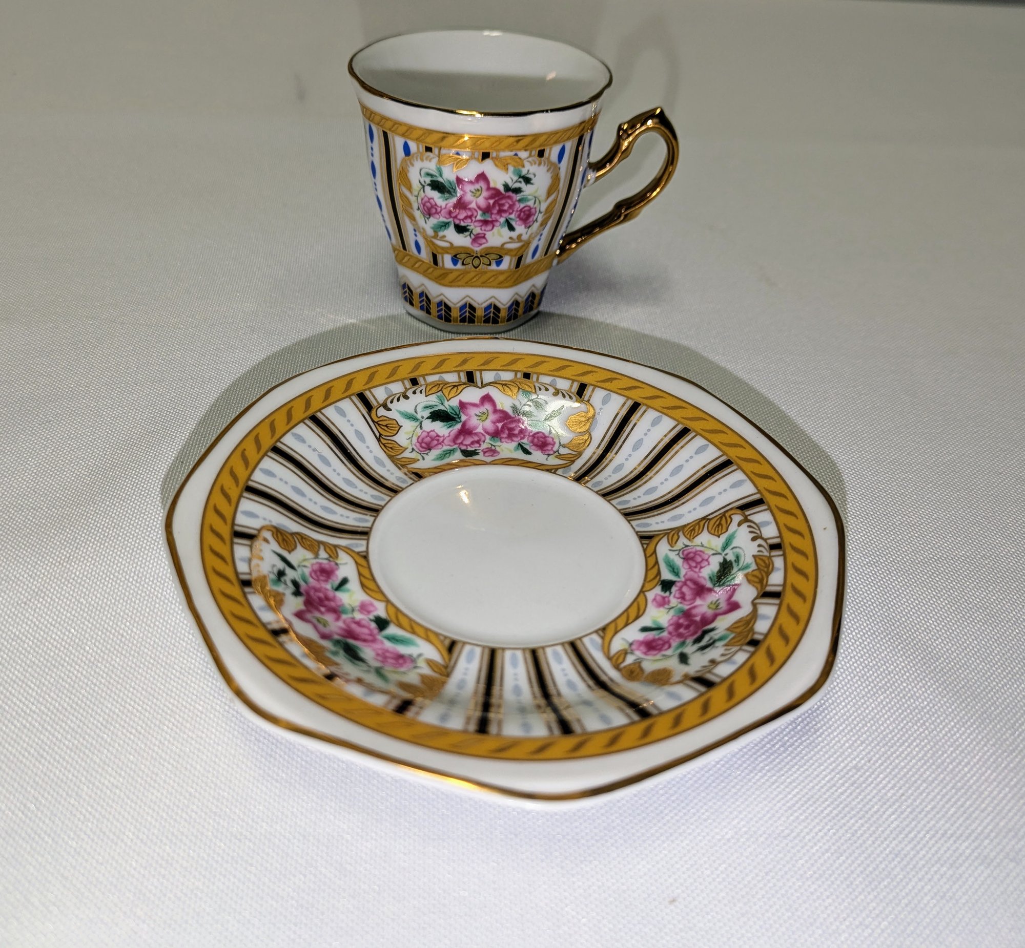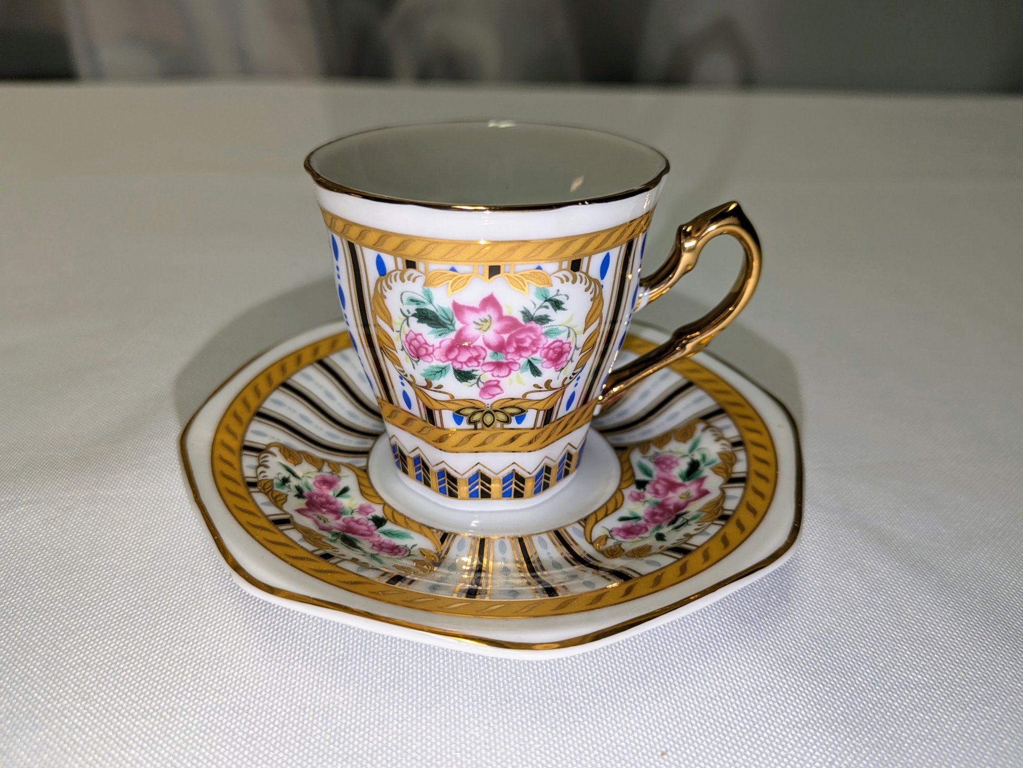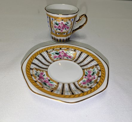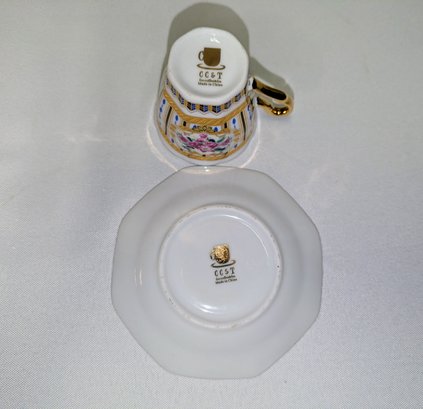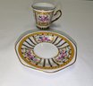 Stunning Details and Design on both the Cup and Saucer, Accented in Gold Gilt. Excellent, Vintage Condition. Please see all photos as part of the description and condition. Cup 2.25"H / Saucer 4.25" Diam.