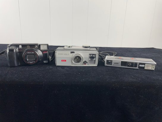 Three piece set. Including Kodak Brownie Super 27 Camera, Tele Minolta Pocket Camera, and Minolta Freedom Tele Camera. Evidence of use, minimal scratches seen in images. See photos for more conditions and sizing.