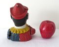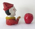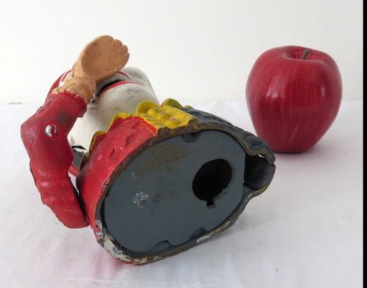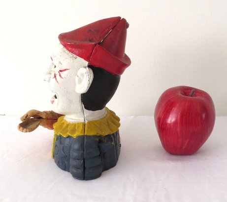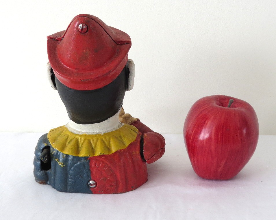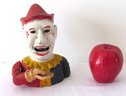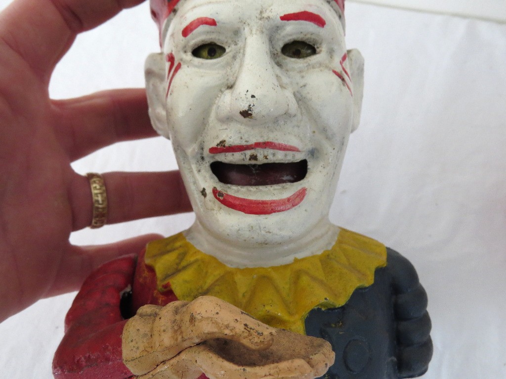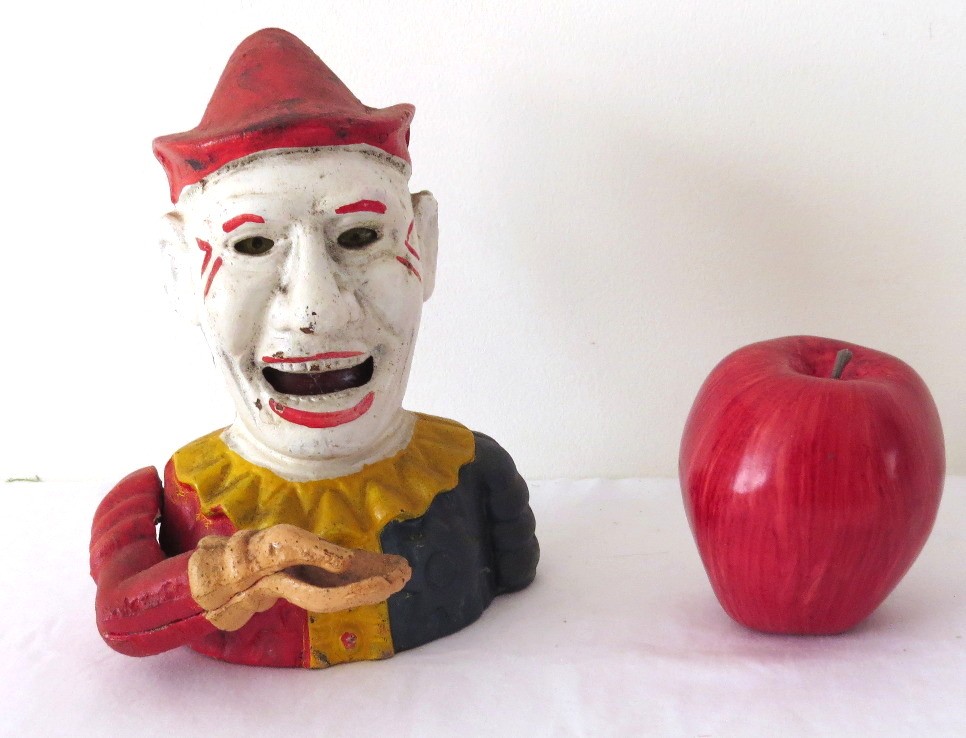 A reproduction of the 19th c. original, this cast iron evil circus clown bank even has moving eyes! A mechanical bank, he lifts the coin into his mouth and his eyes track down to see himself consume it!