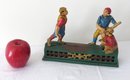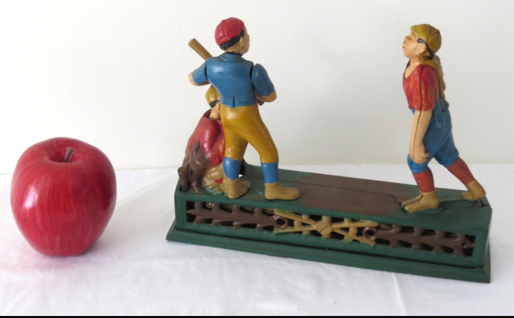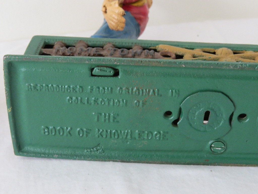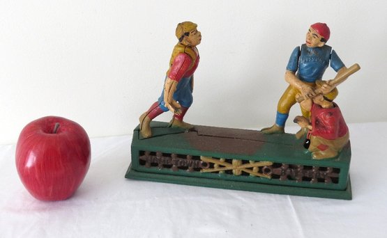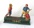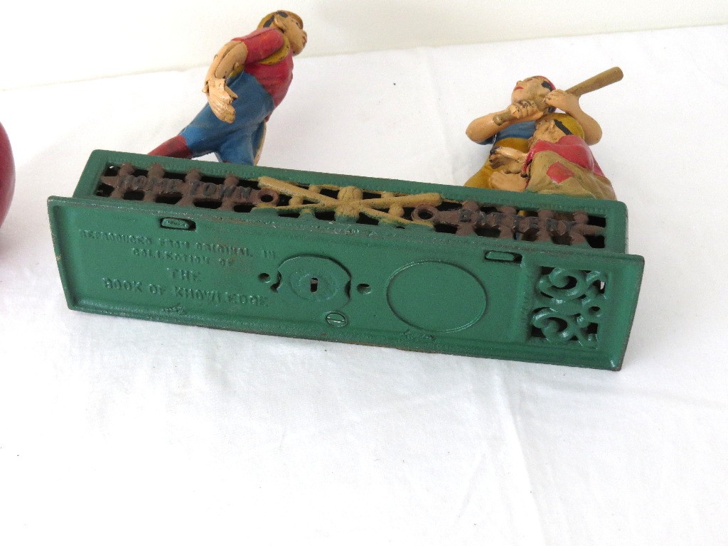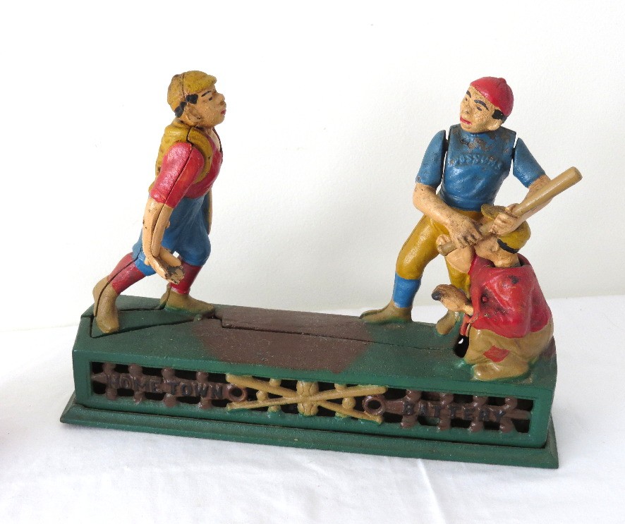 A reproduction of the 19th c. originals, this vintage cast iron mechanical bank features pitcher, batter and catcher in the endless duel.