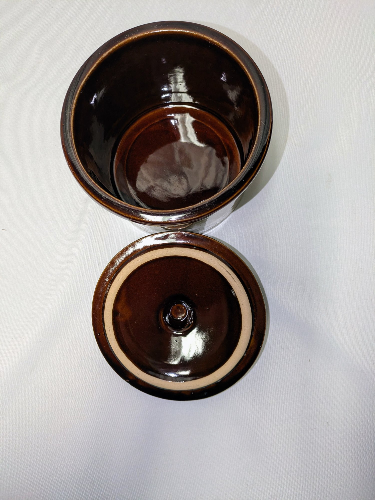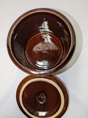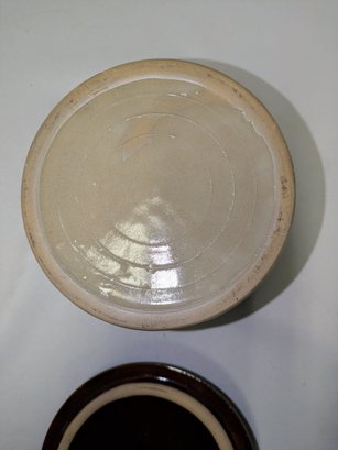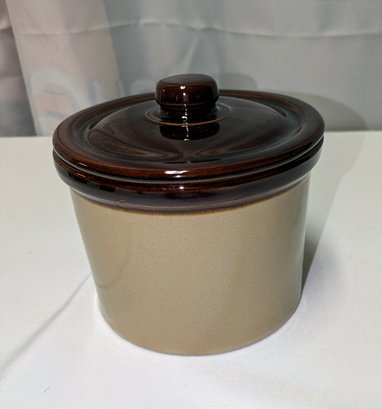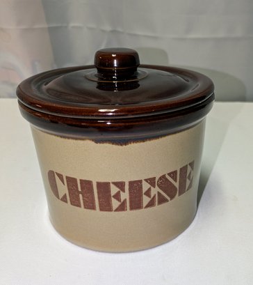 Vintage ceramic cheese crock with cover. Made of stoneware pottery with a two-tone brown glaze. Excellent/Very Good Vintage Condition. Please see all photos as part of the description and condition. 4.5"H (without lid) x 5.5" (with lid) x 6.25" Diam.
