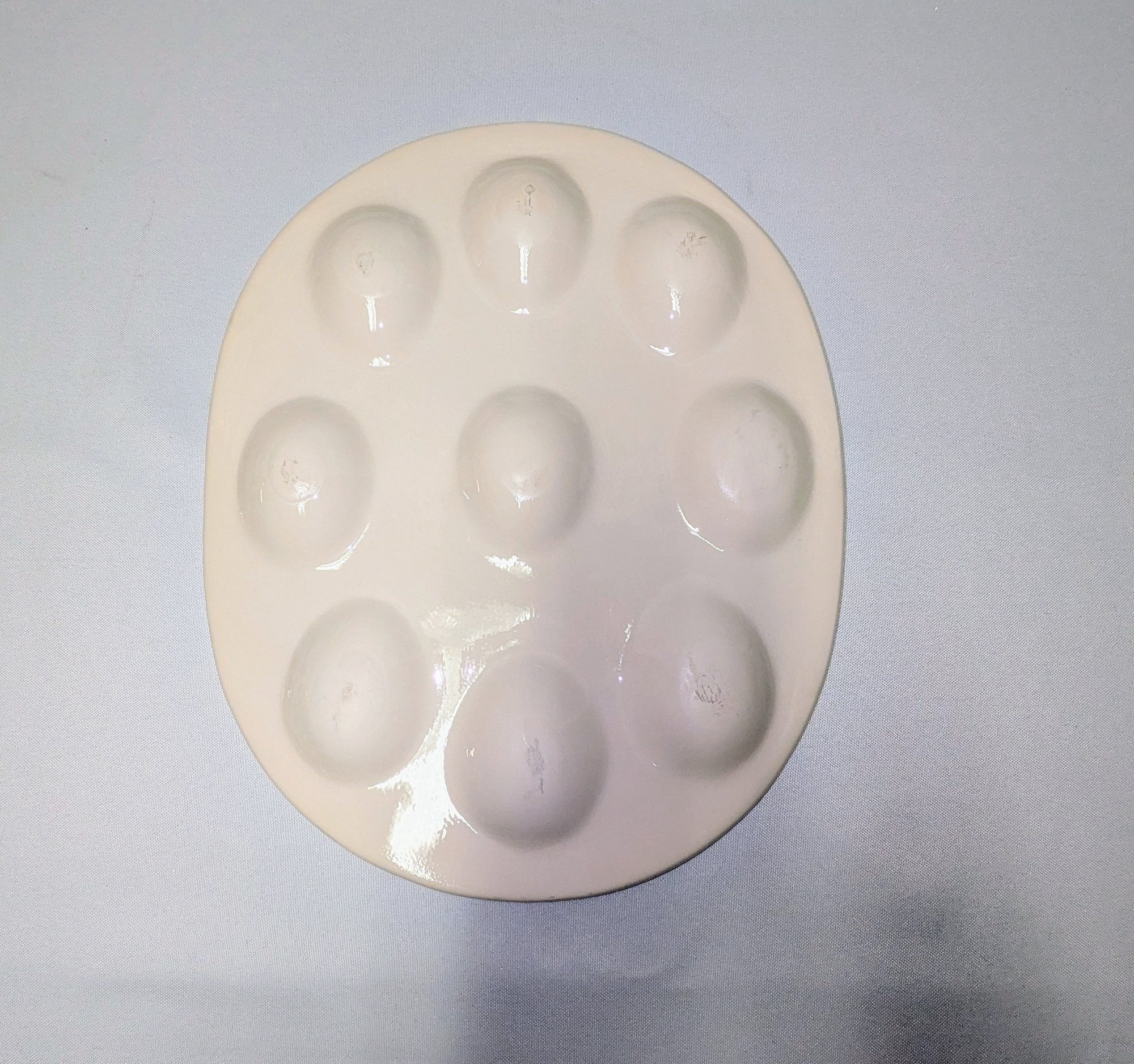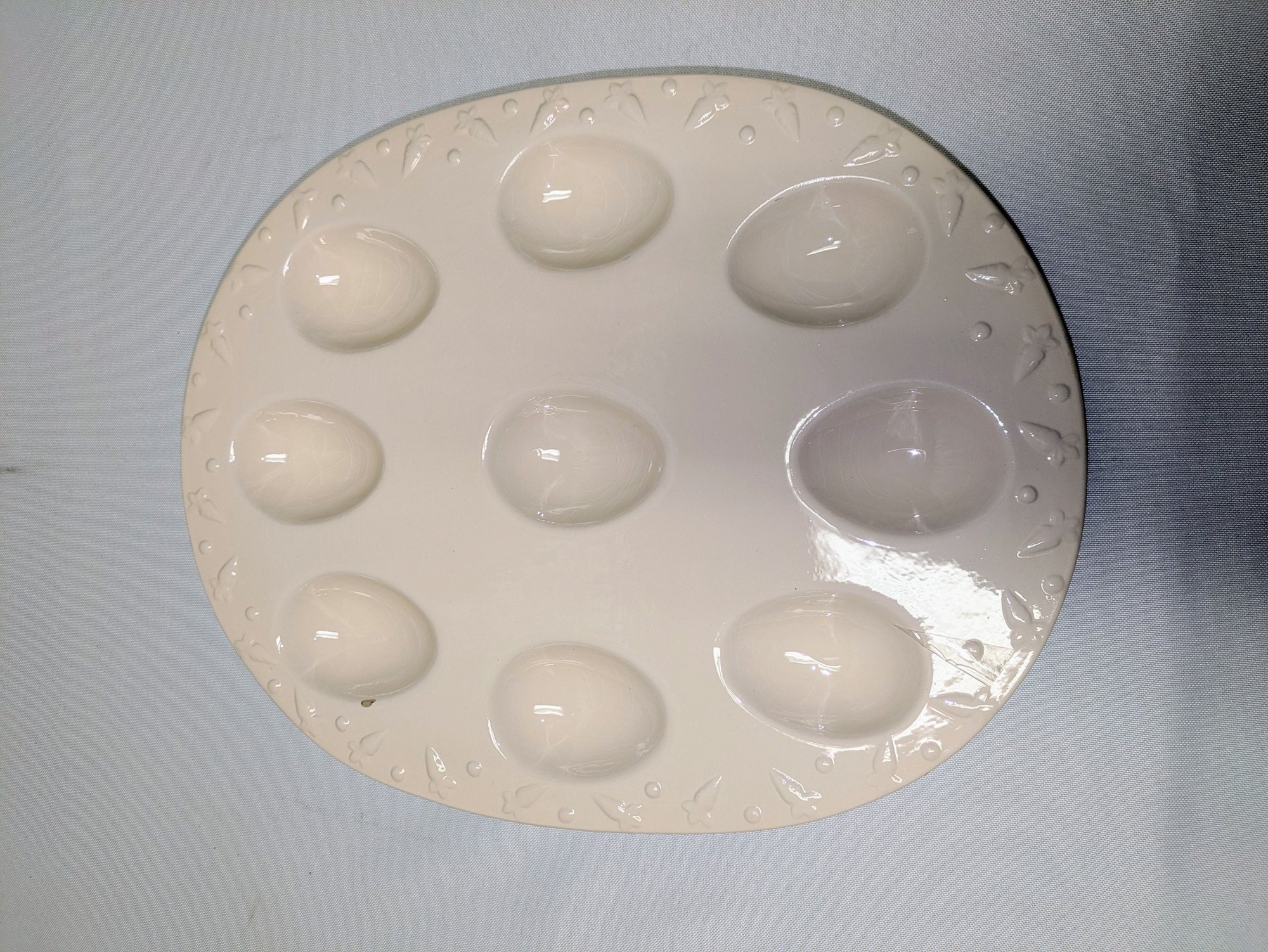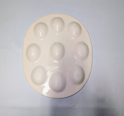 Adorable way to serve your Deviled Eggs or Display your Easter Eggs. Features Nine Well Egg Holders and an Adorable Carrot Design Along the Trim. Some light marks on the bottom, and a small chip on the front, consistent with age and movement. Overall, Very Good Vintage Condition. Please see all photos as part of the description and condition. 12" x 10"
