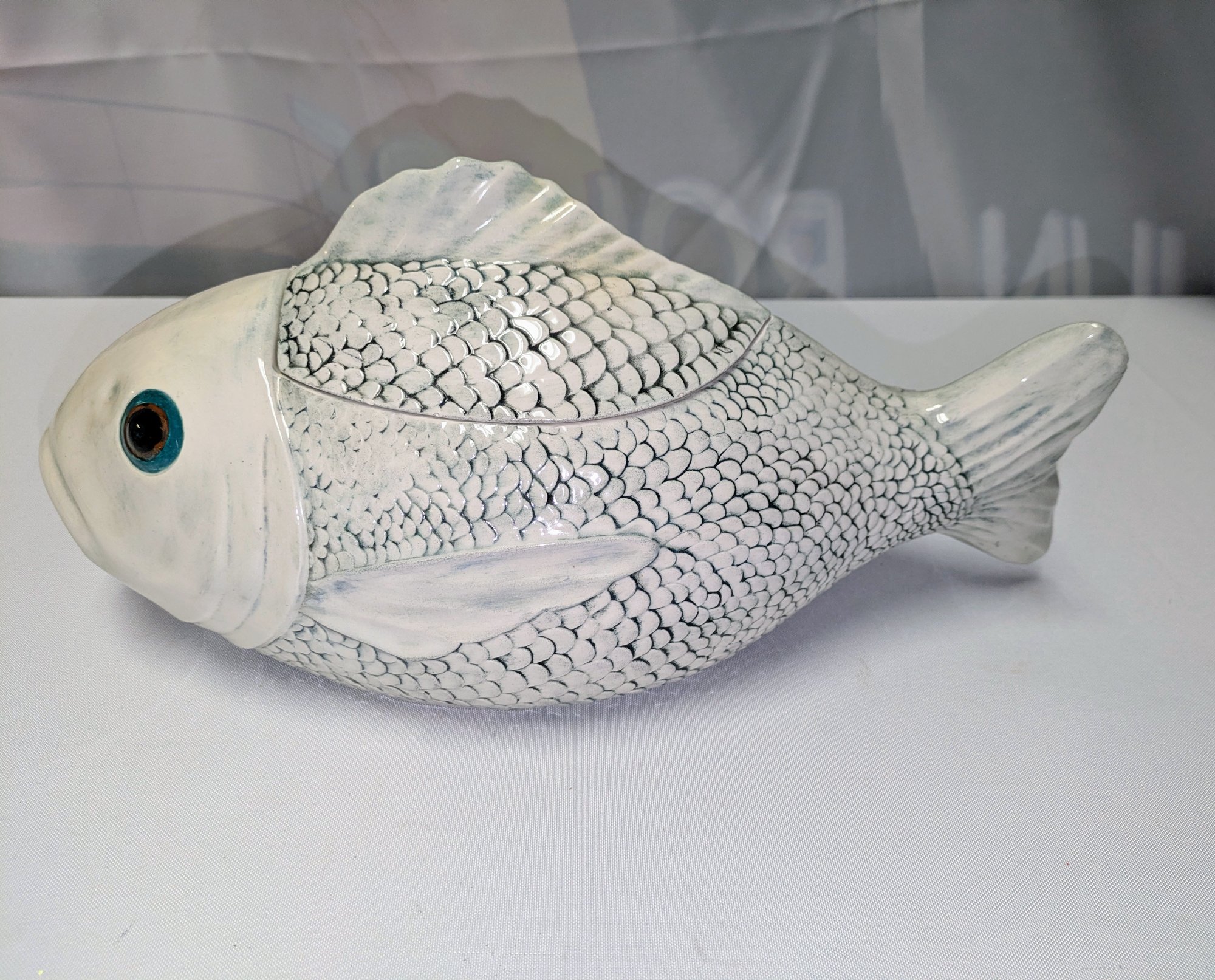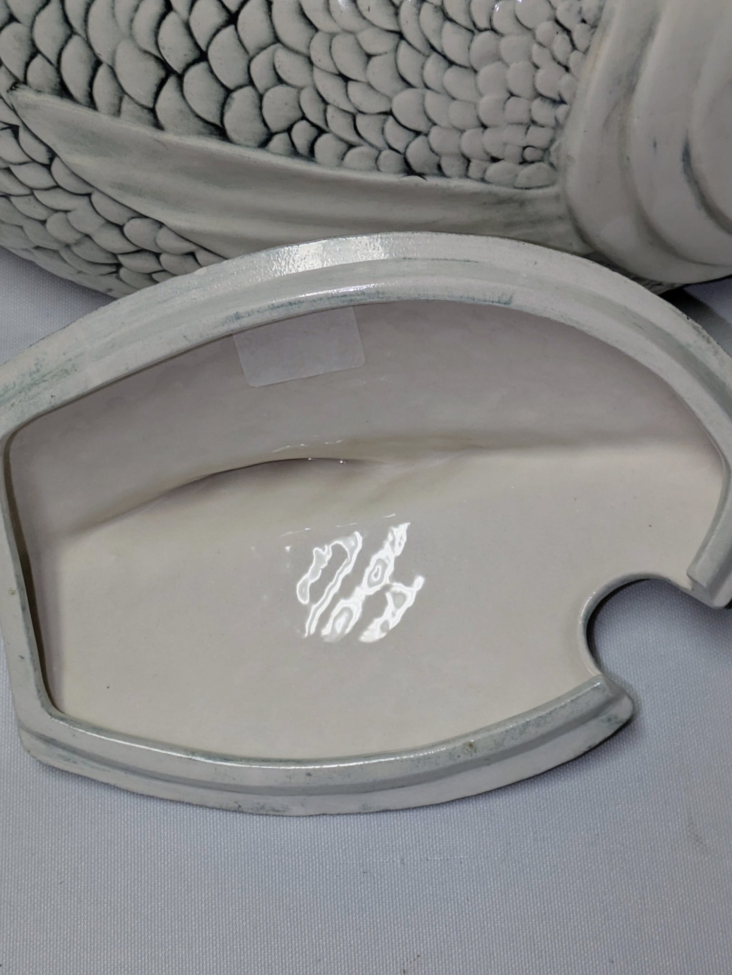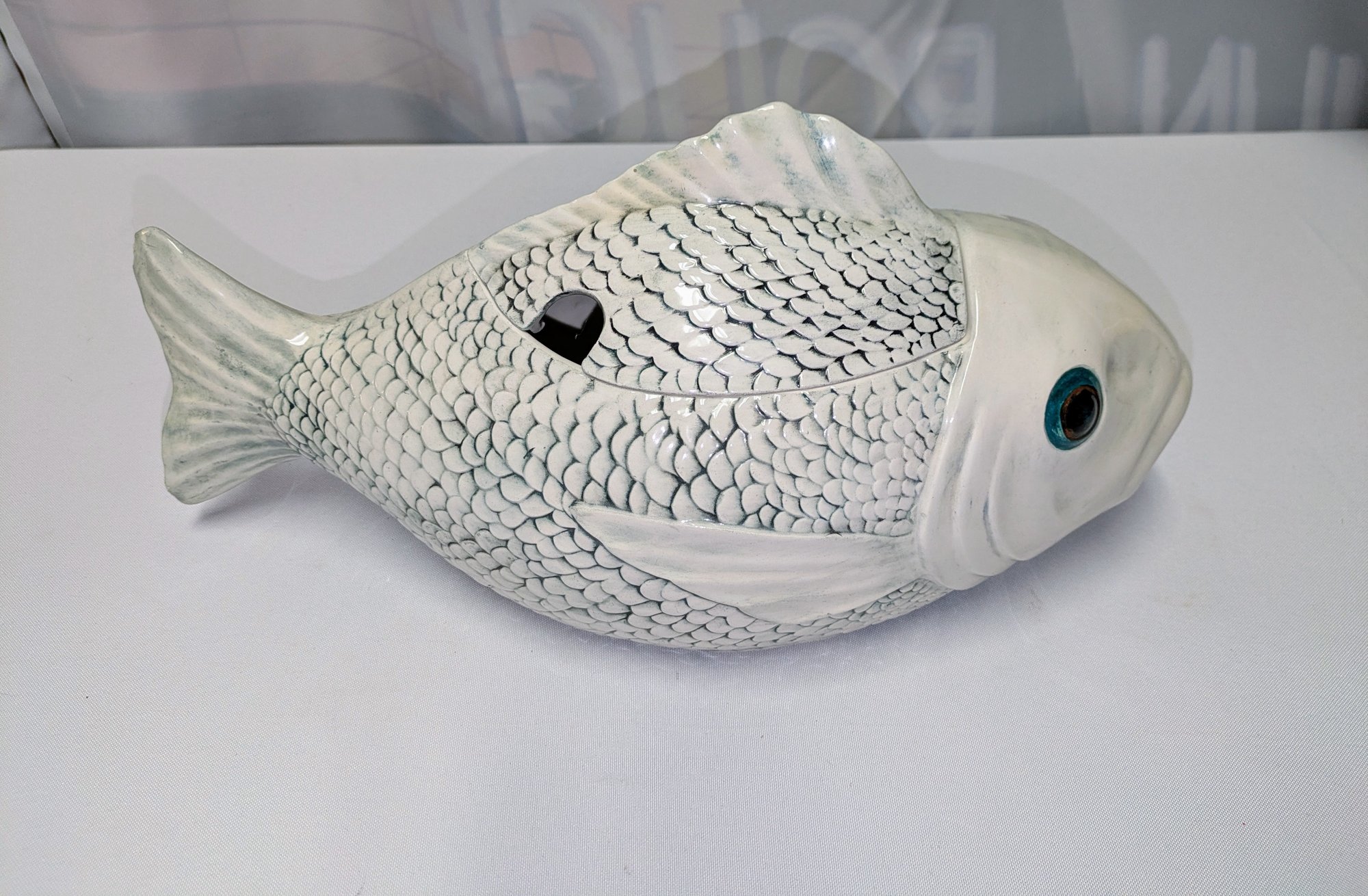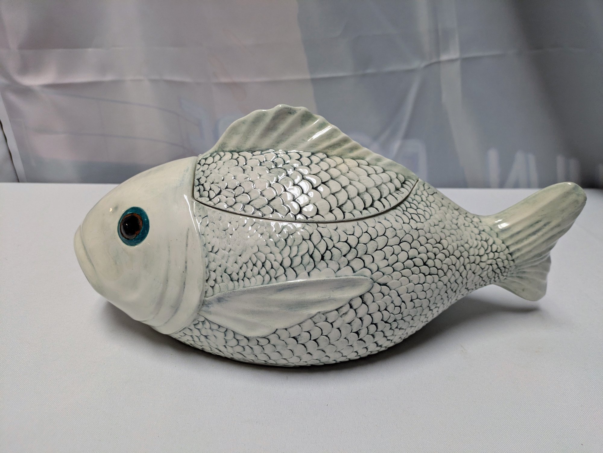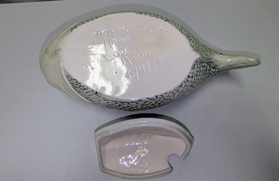 Vintage Ceramic Fish Tureen - No Ladle. Some chips are consistent with age, use, and movement. Happy Anniversary, Inscription on the Bottom. Please see all photos as part of the description and condition. 7.5"H (with cover) x 7" x 14"