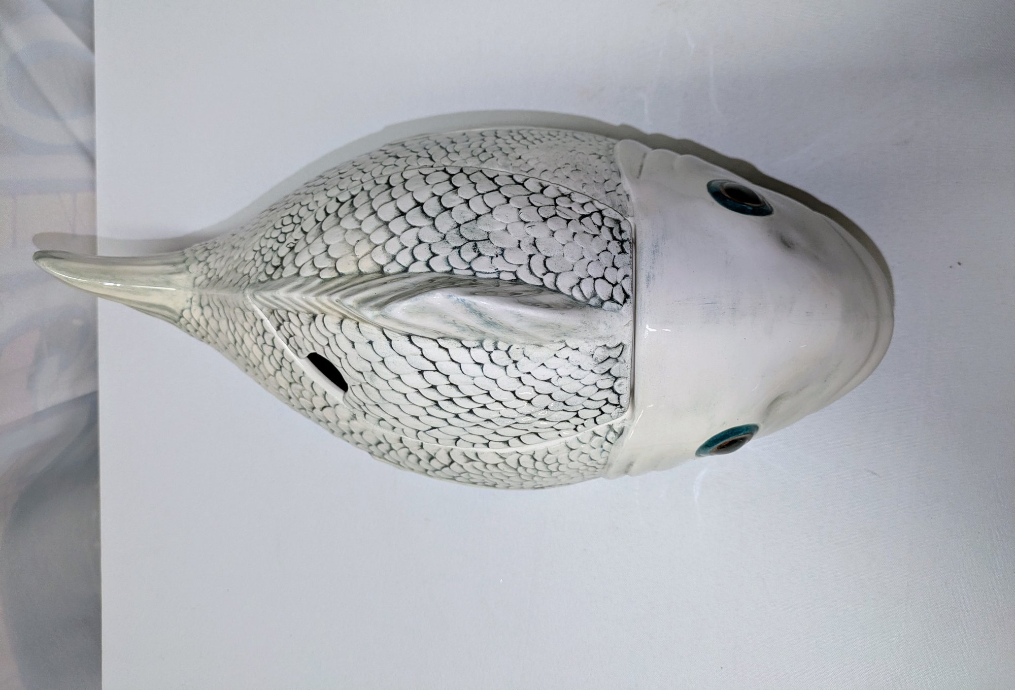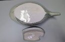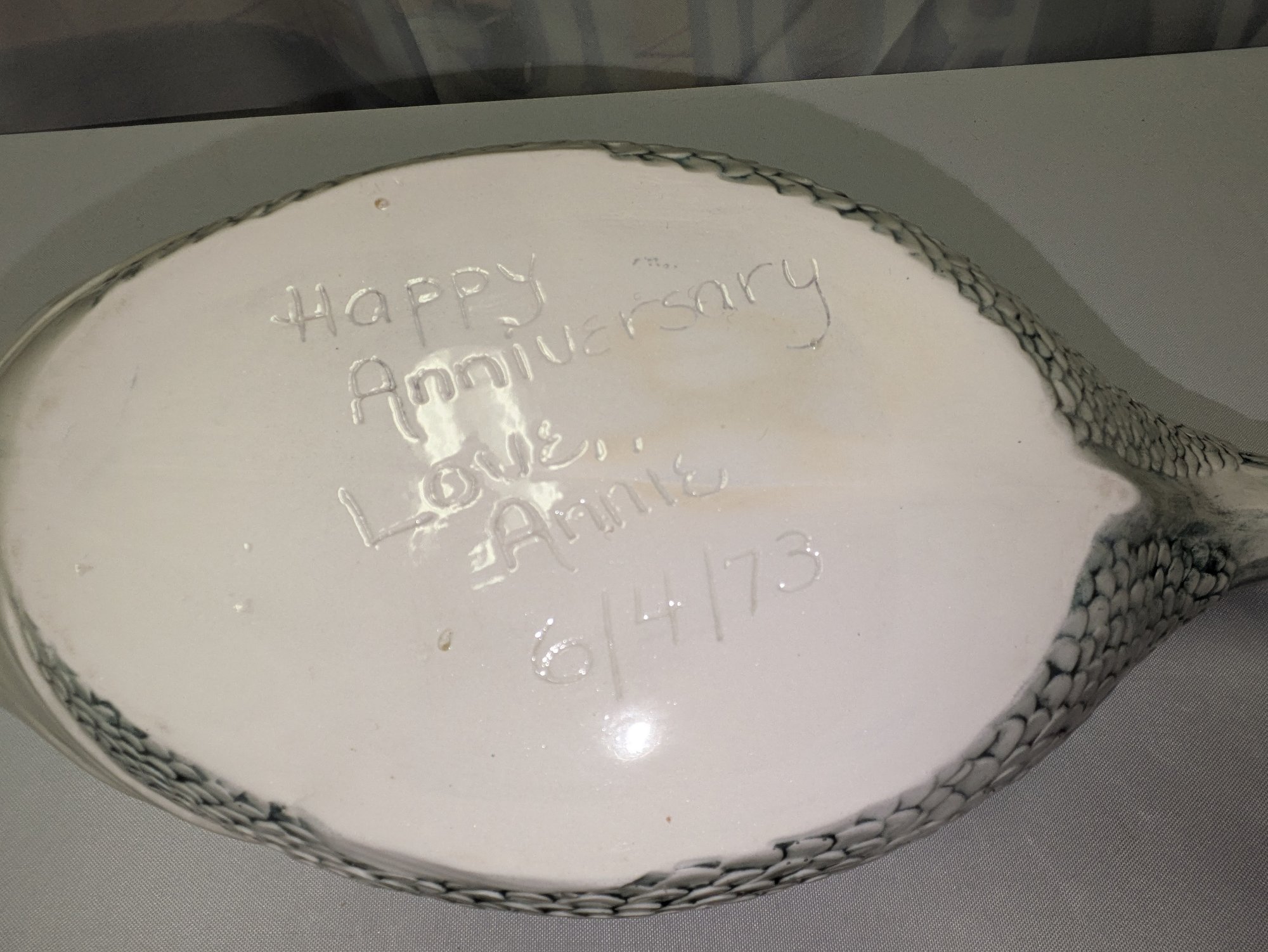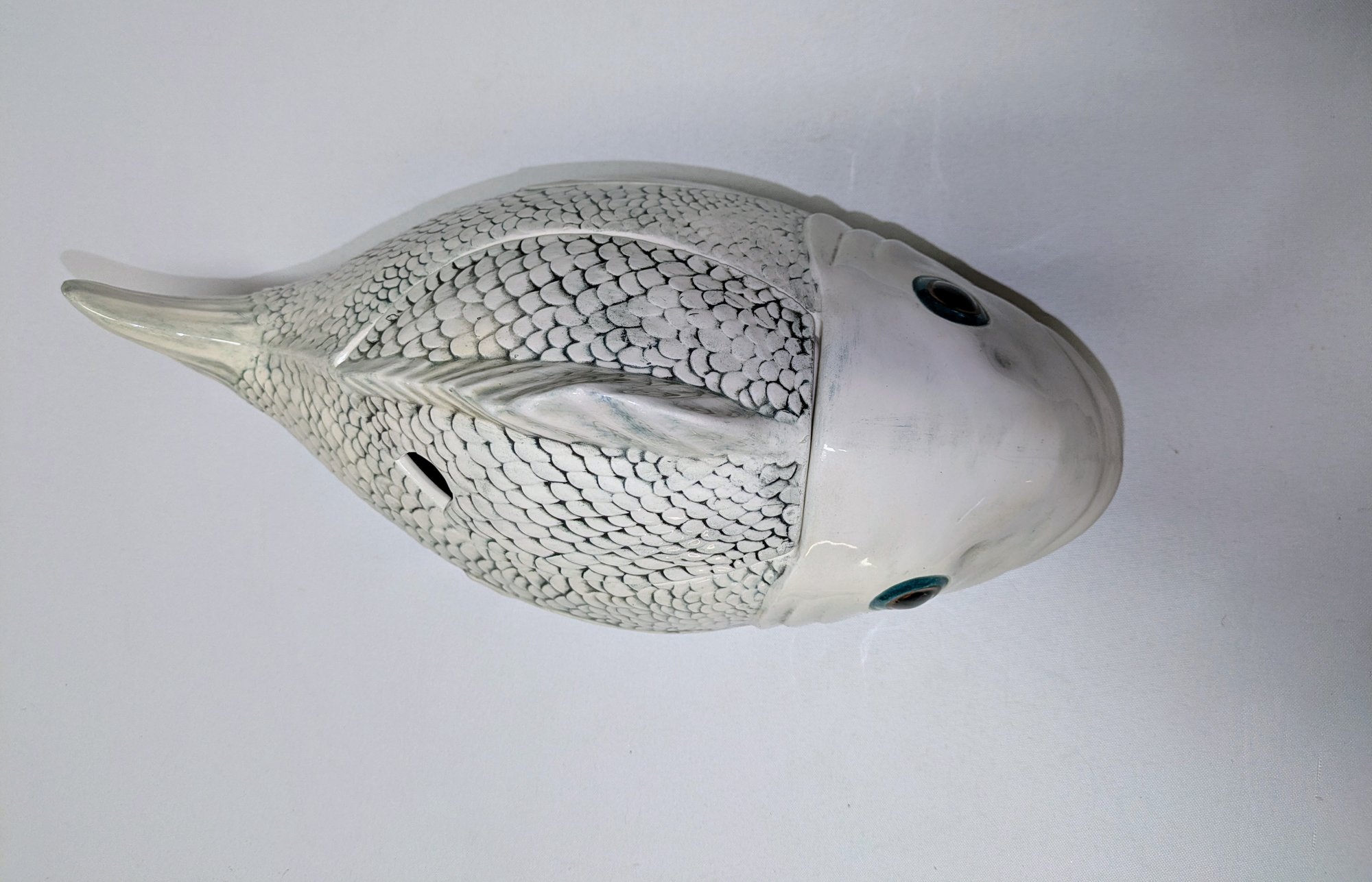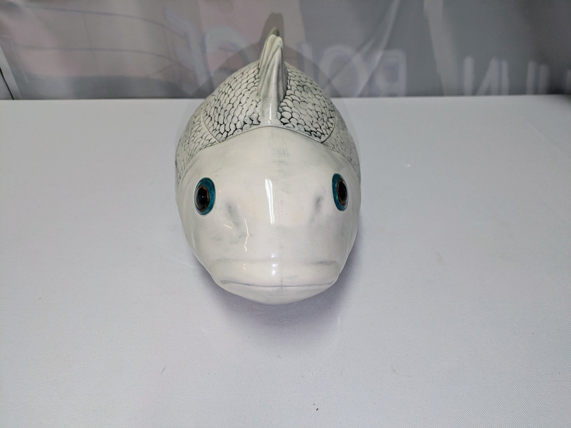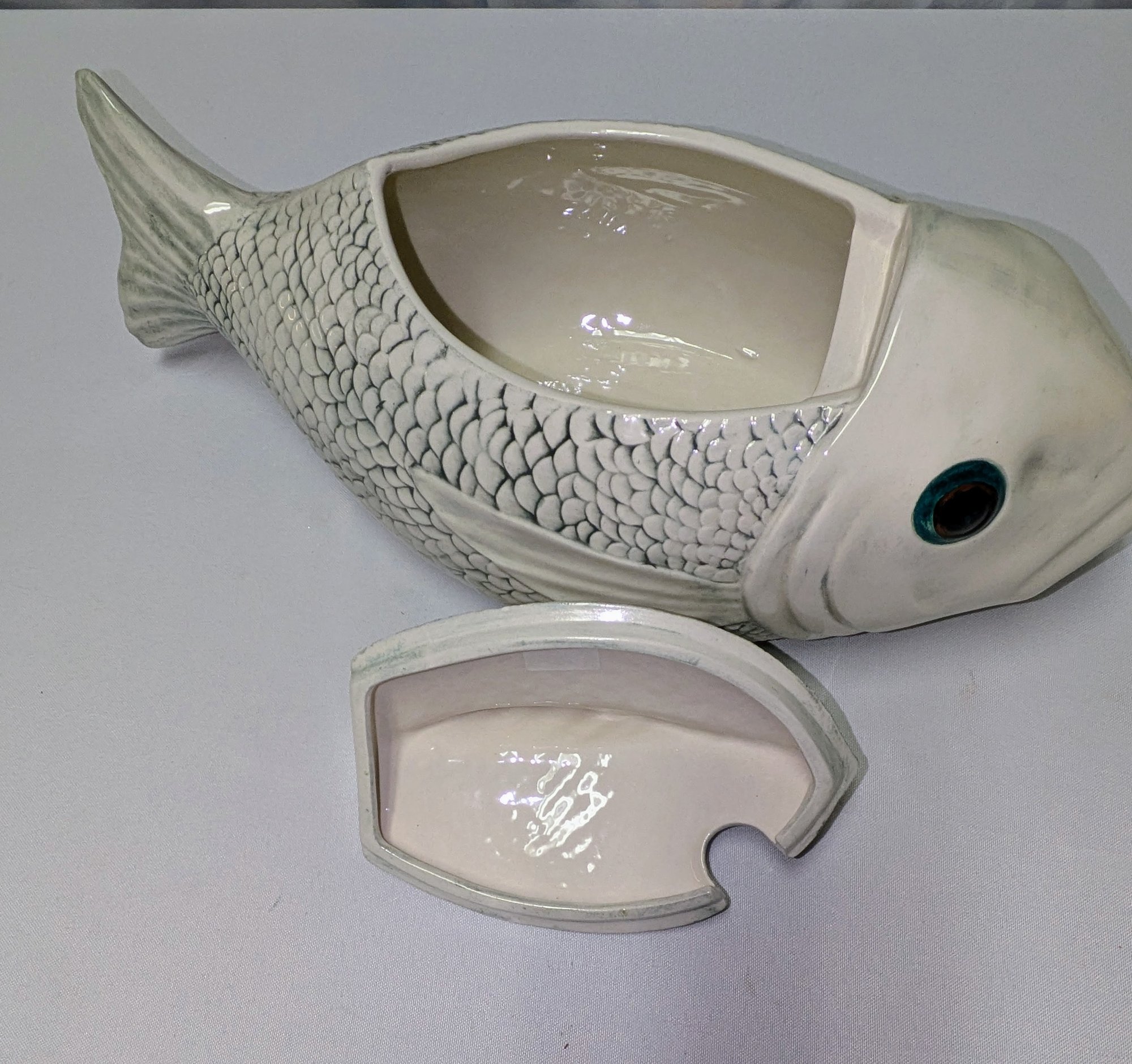 Vintage Ceramic Fish Tureen - No Ladle. Some chips are consistent with age, use, and movement. Happy Anniversary, Inscription on the Bottom. Please see all photos as part of the description and condition. 7.5"H (with cover) x 7" x 14"