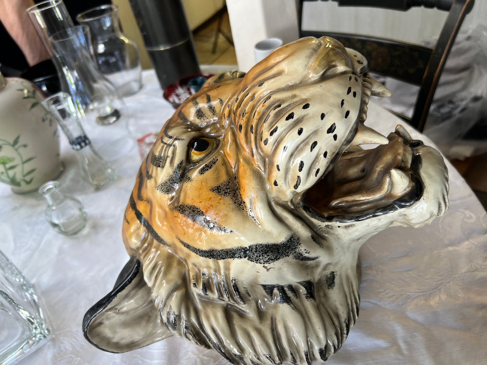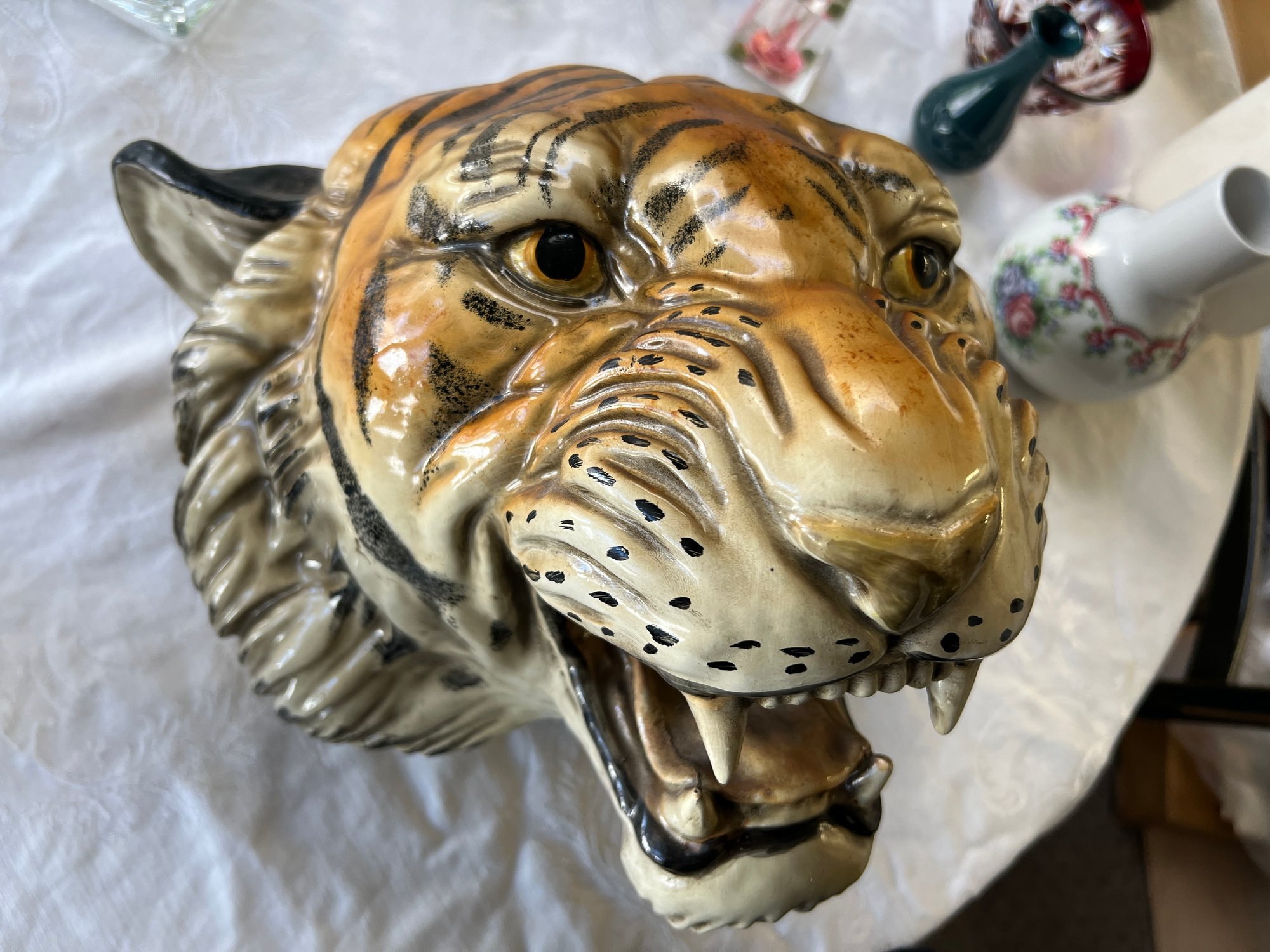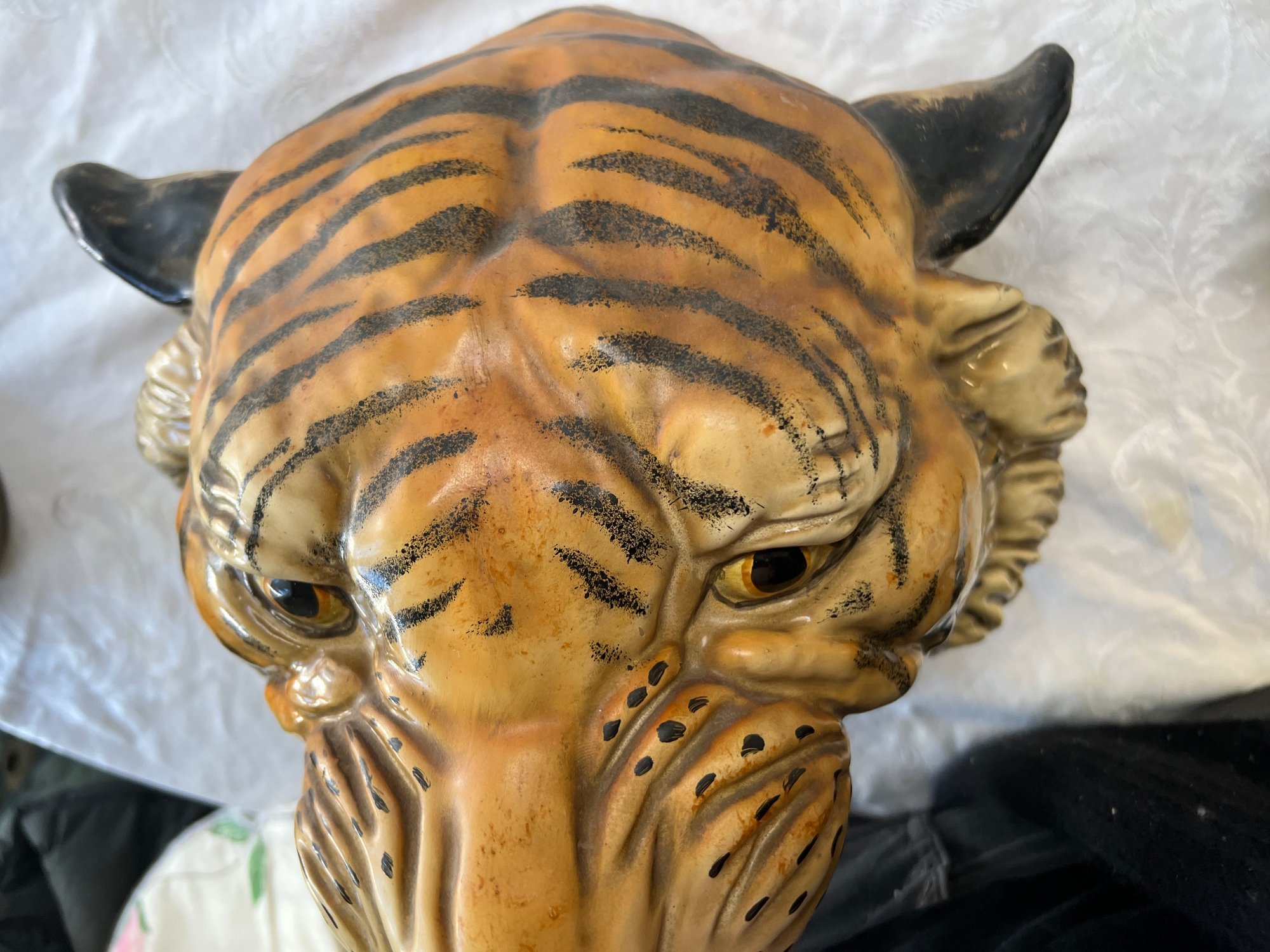 Eye-catching vintage ceramic tiger's head with brackets to be hung on a wall.