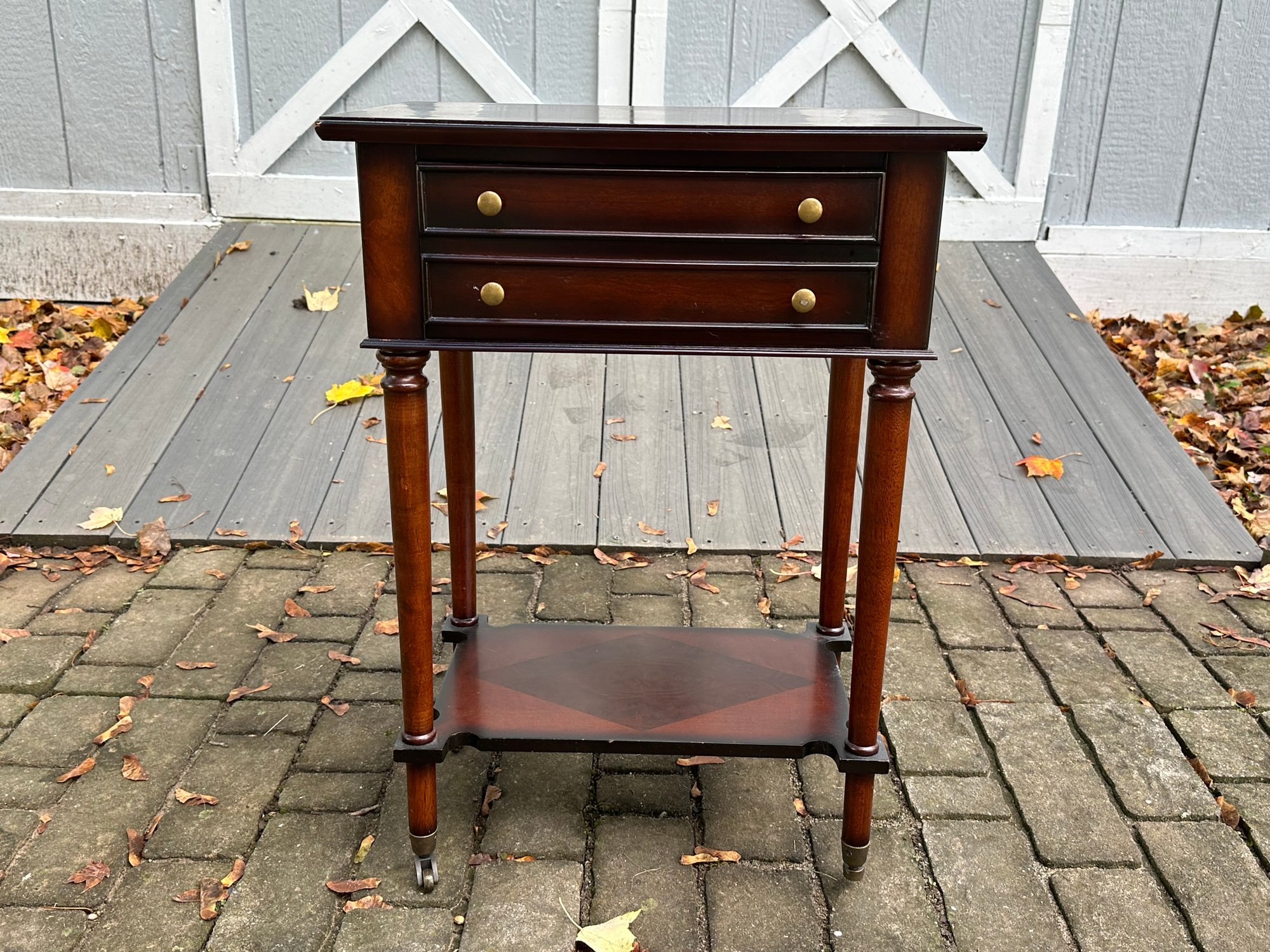 A vintage cherry end table with caster wheels. A great end table with beautiful wood grain. A few normal scuffs from age.