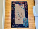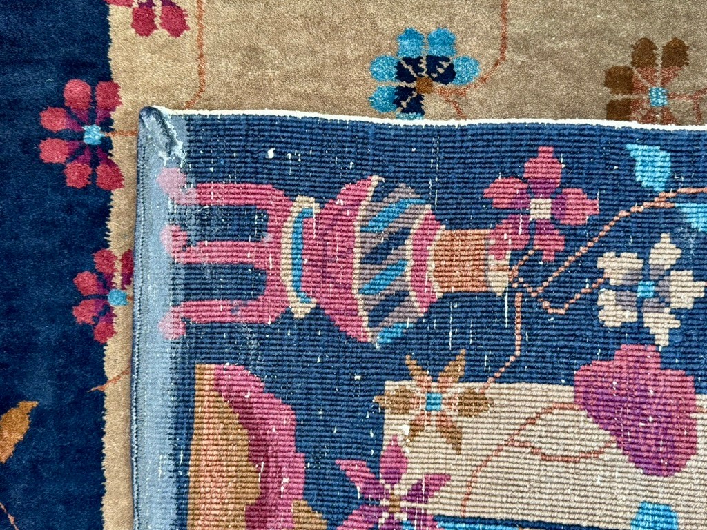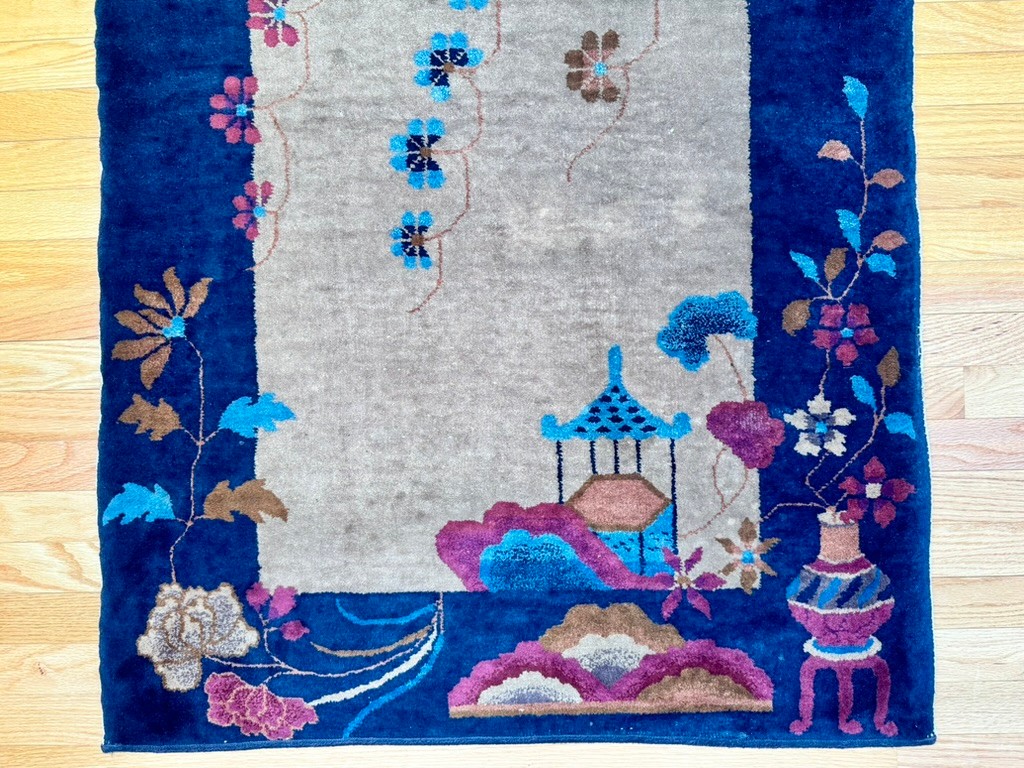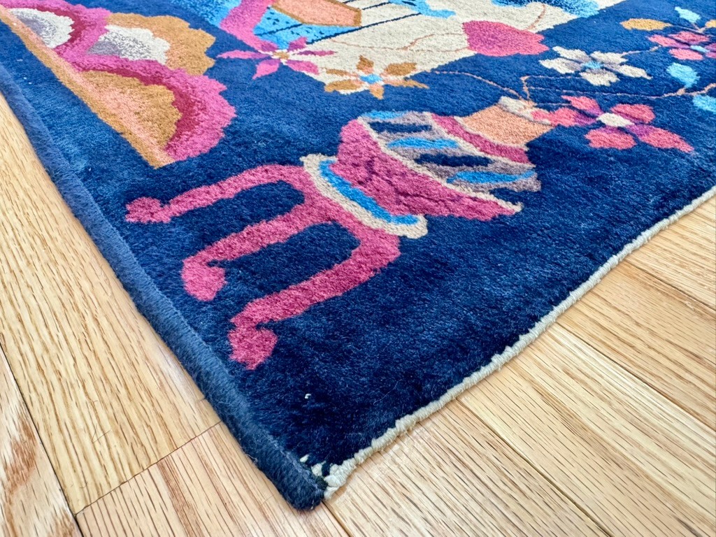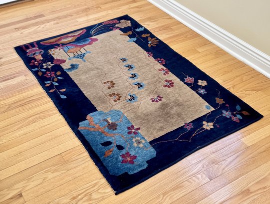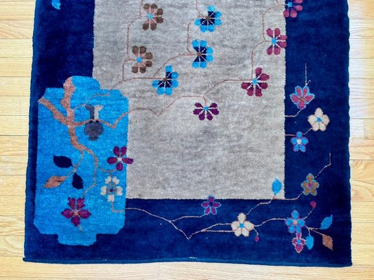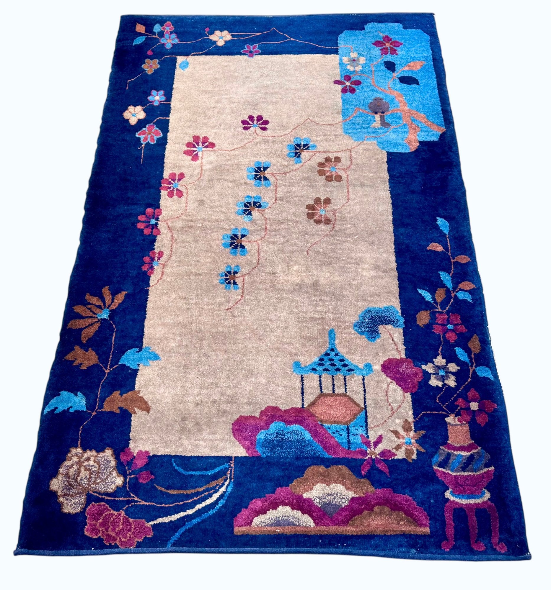 A striking vintage rug in the Chinese Art Deco style, featuring a bold cobalt blue field with an ivory center panel framed by stylized florals, vines, and pagoda-inspired elements.