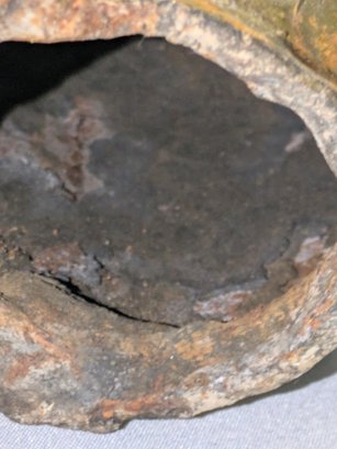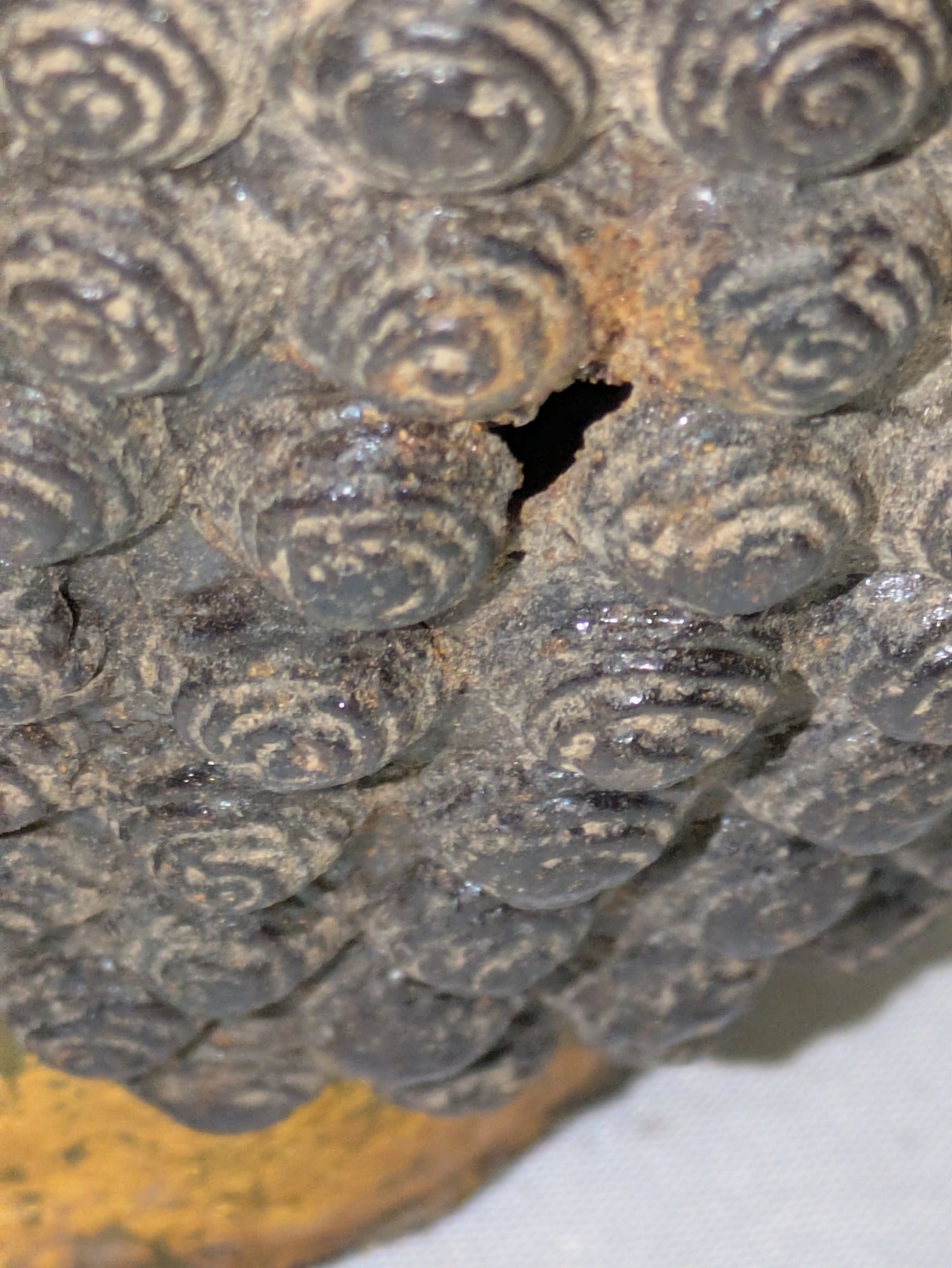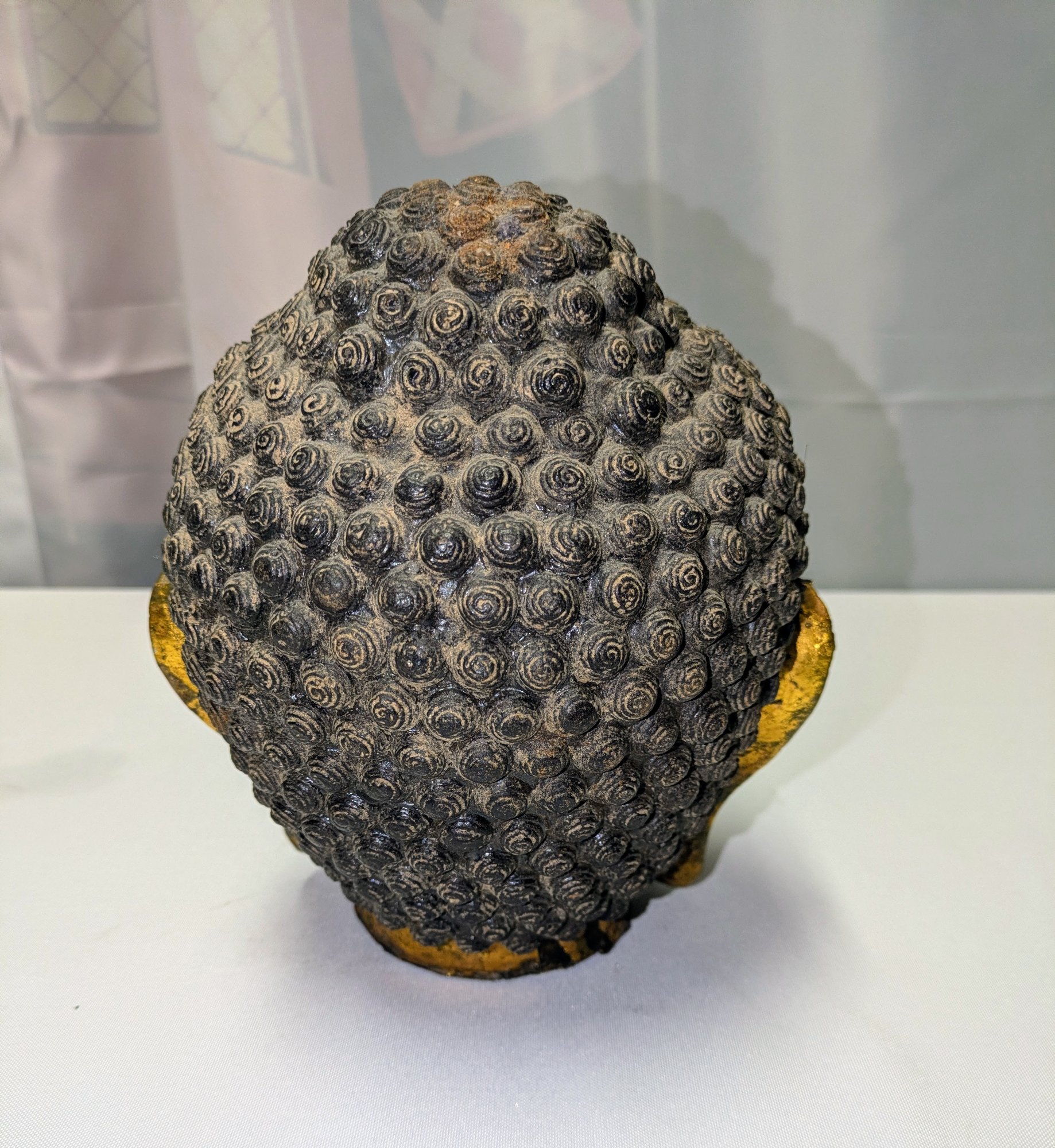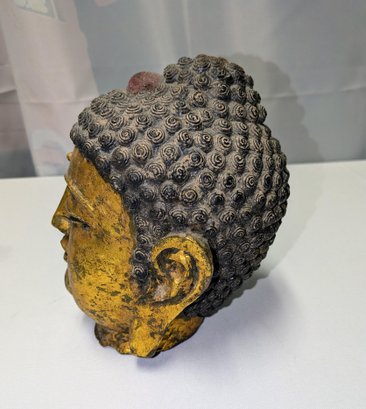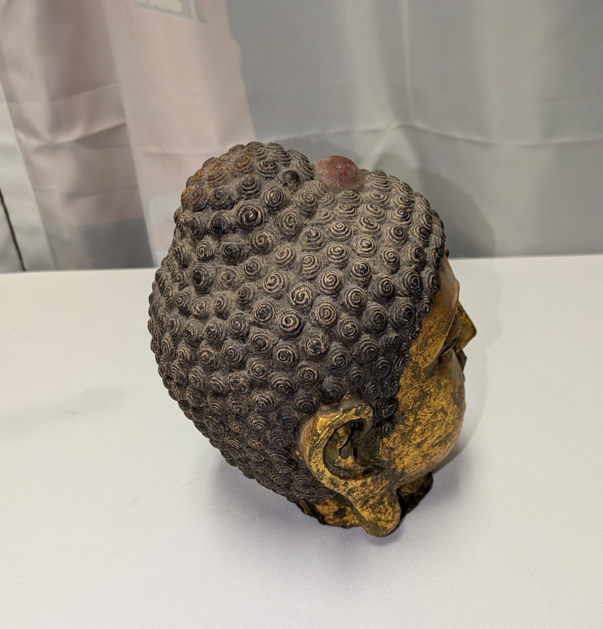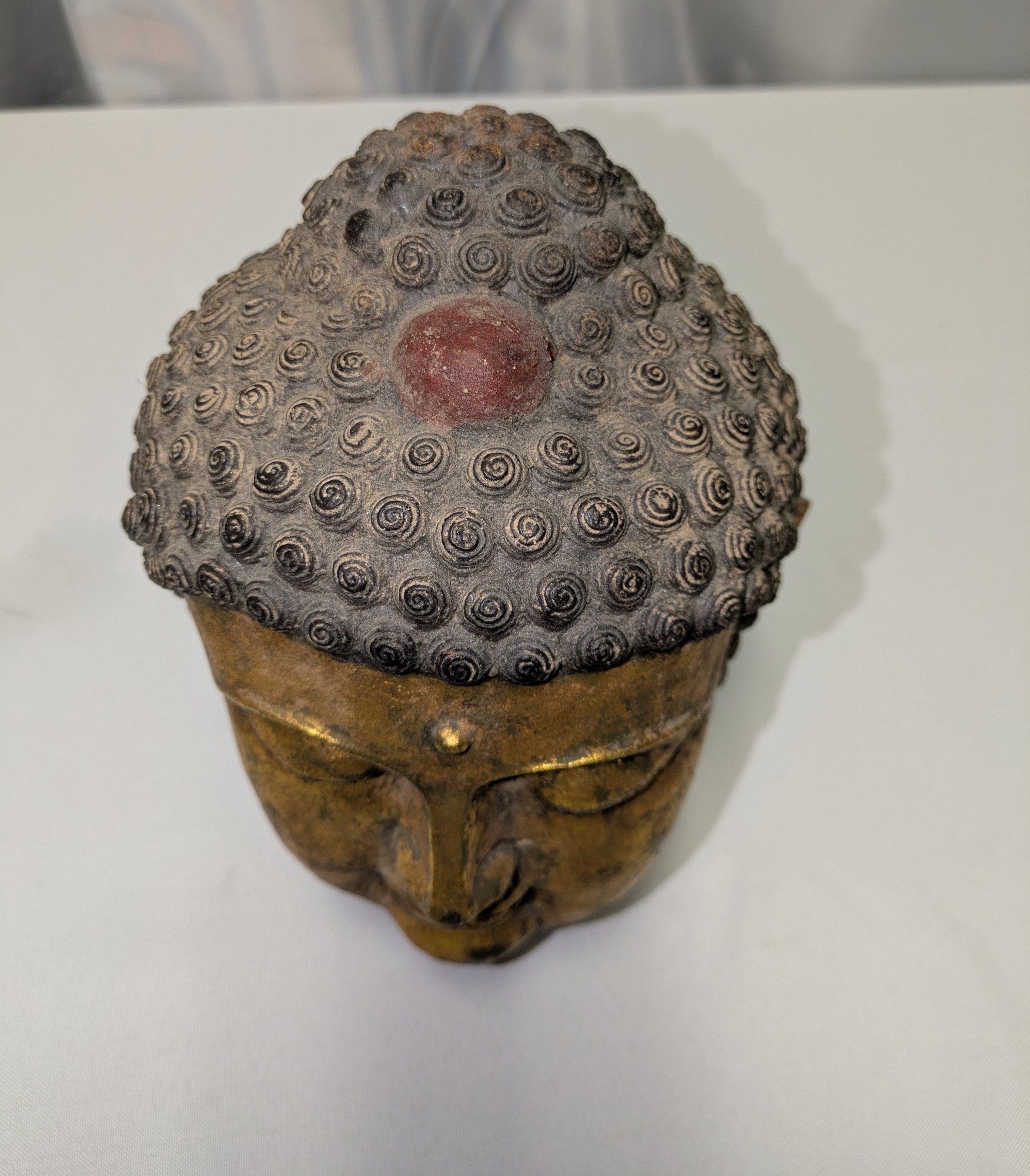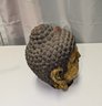 Great details and design. This is a vintage piece, and the gold leaf paint is worn, with marks, patina, and a small hole in the metal, all of which are consistent with age and metal. Please see all photos as part of the description and condition. 8.5"H x 7" Diam.