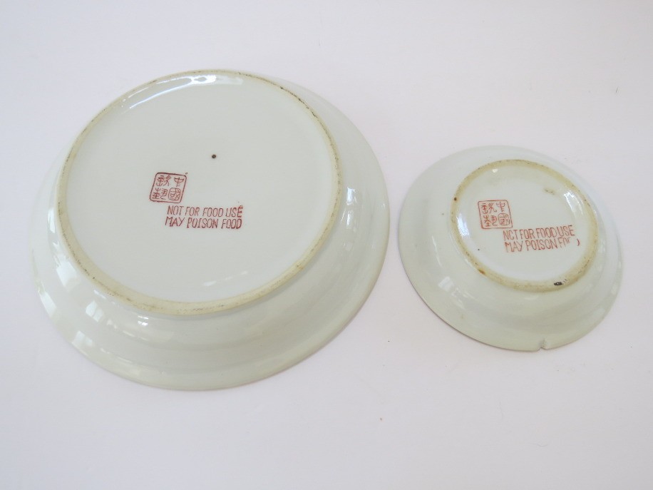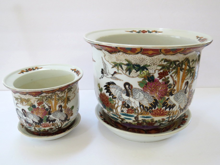 Two different size Chinese porcelain planters with matching underplates, a true work of art that blends elegance, symbolism, and craftsmanship. The larger cachepot measures 7" tall with a 9"diameter while the smaller one measures 4 1/4" tall with a 5 1/2" diameter. Both feature 2 sided vibrant hand-painted elements rich with meaning, cranes (longevity), bamboo (resilience), lotus blossoms (purity), and lush florals, all accented with touches of shimmering gold in the Moriage style. The matching underplates are a rare bonus, protecting your surfaces while completing the set with style. The larger pot, underplate and smaller cachepot appear to have no cracks or chips while the smaller underplate has a rim chip.